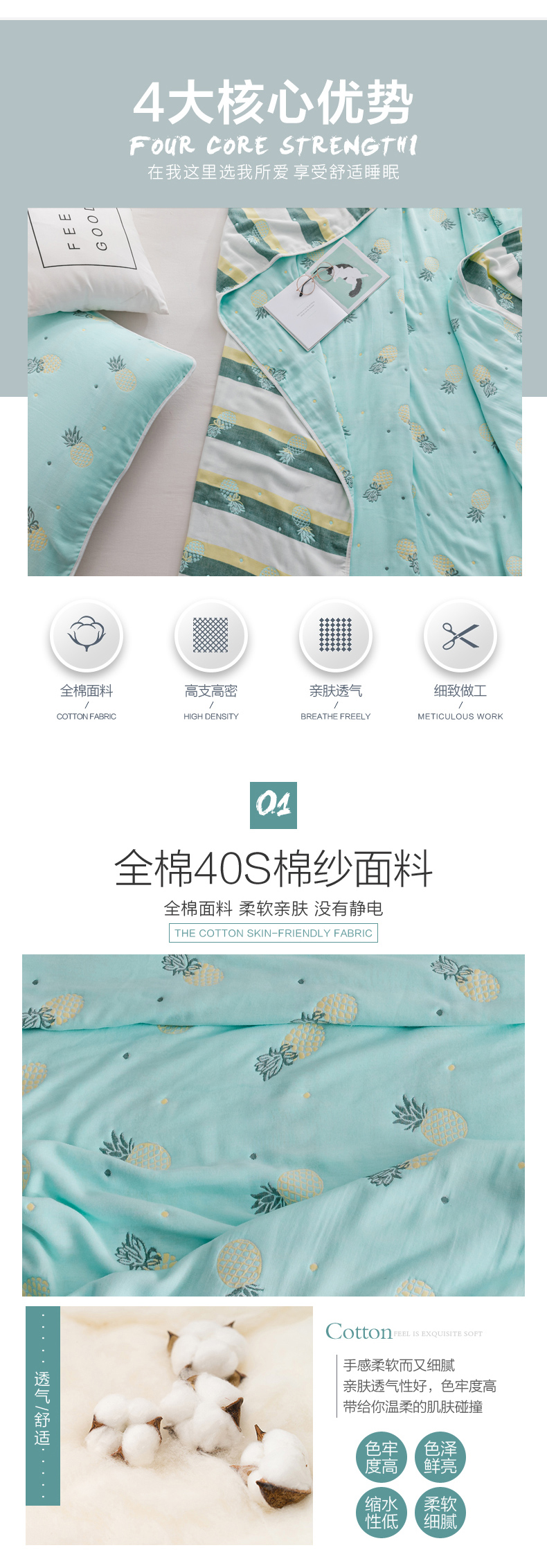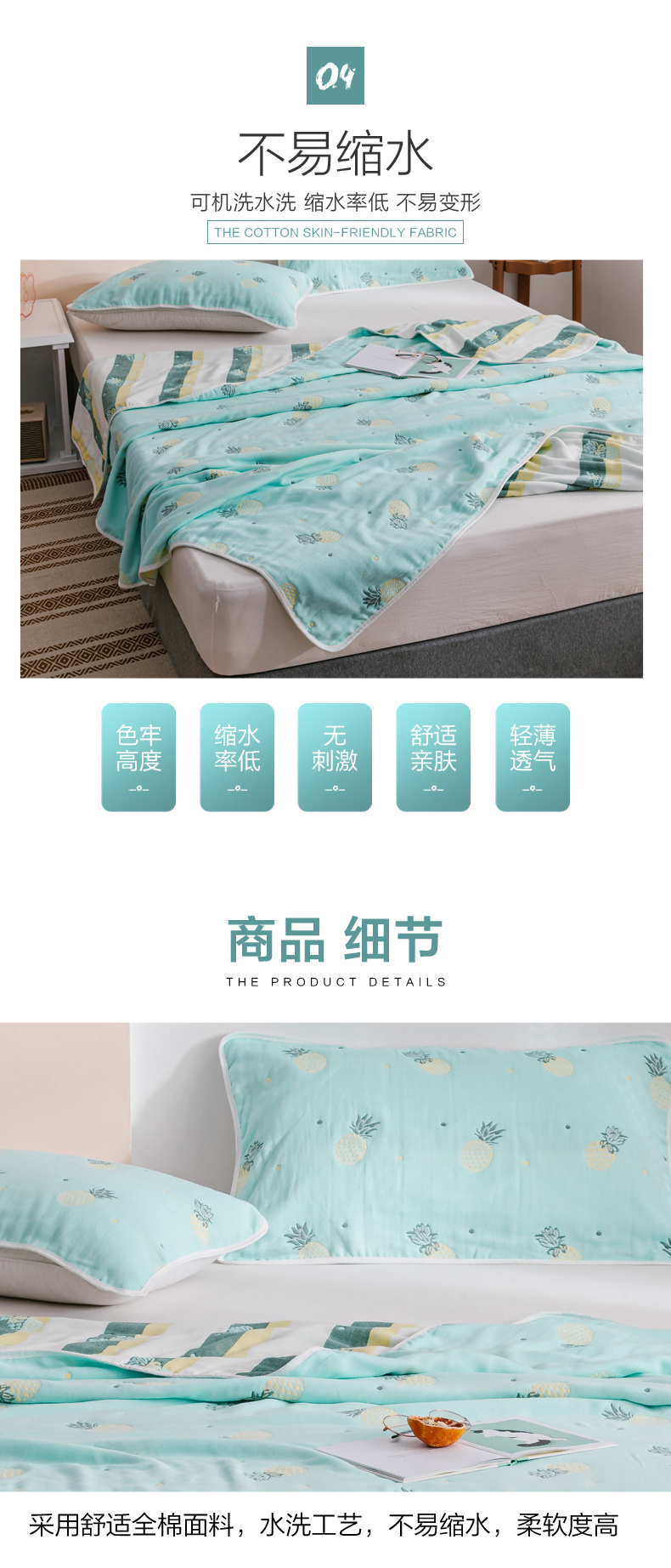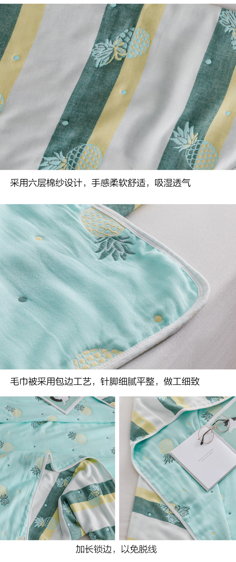 商品名称:朴尔家纺-毛巾被 2026春夏新款六层全棉纯棉纱布毛巾被夏被夏凉被空调被 清新菠萝-兰