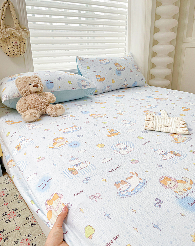立森 2026春夏新款云感皱皱纱泡芙纱床笠单枕套系列-床拍图 碎花萌宠,碎花萌宠