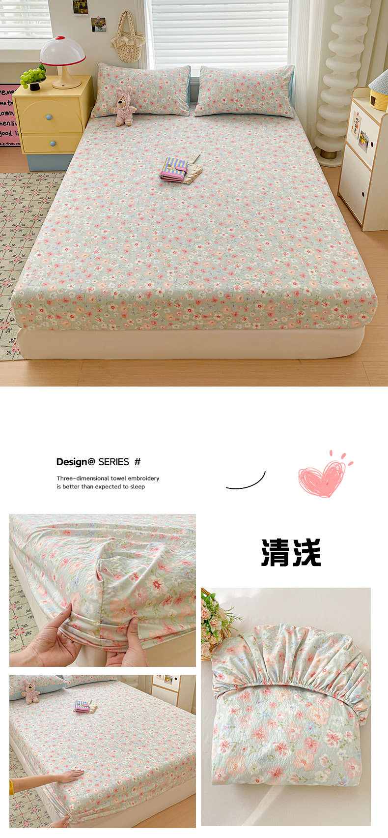• 91家纺网 家纺一手货源 找家纺 立森 2026春夏新款云感皱皱纱泡芙纱床笠单枕套系列-床拍图 碎花萌宠,碎花萌宠
