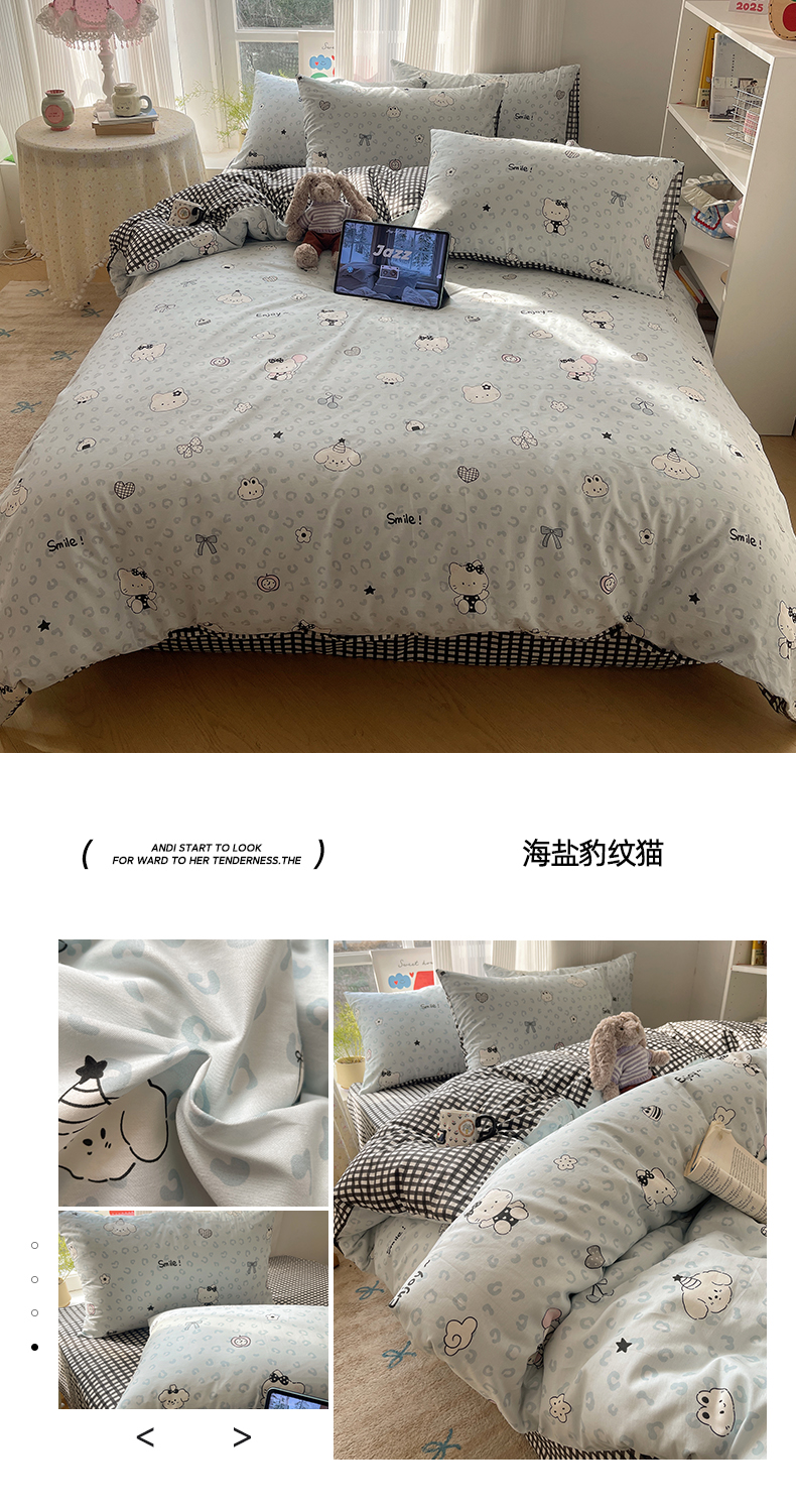 (总)六巷胡同 2026新款INS减龄可爱风卡通全棉四件套(第二系列),豹纹黑皮猫,粉格趣味犬,度假冲浪猫,海盐豹纹猫,爱心汉堡喵,假日蛋糕犬,猫咪聚会趴,蓝调波点兔,蓝格美拉犬,萝莉樱桃猫,汪星人派对,小熊周末集,星星萝莉猫