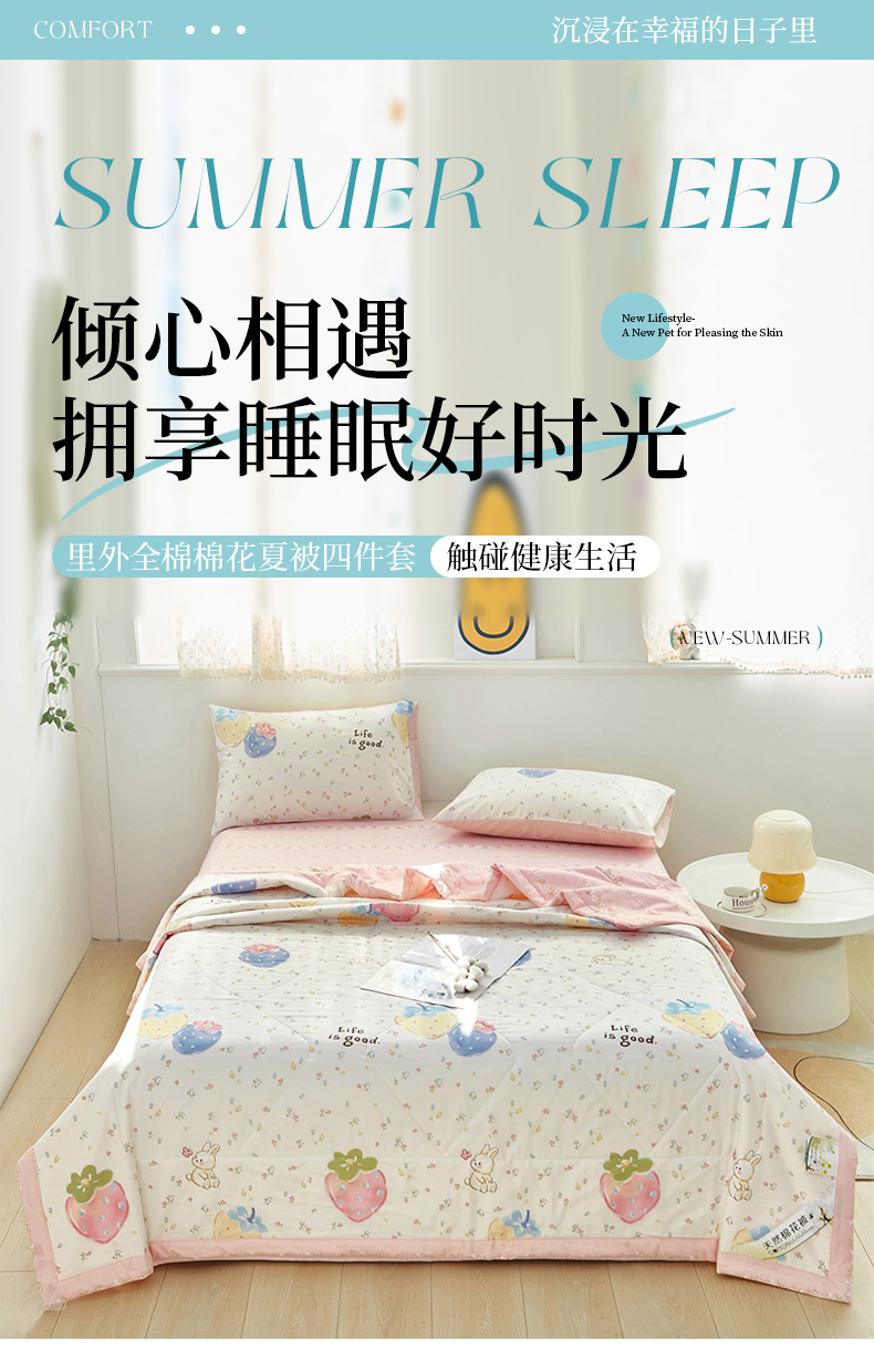 • 91家纺网 家纺一手货源 找家纺 黛妮雅 2026新款里外全棉印花棉花被纯棉夏被夏凉被空调被 夏被四件套草莓泡芙