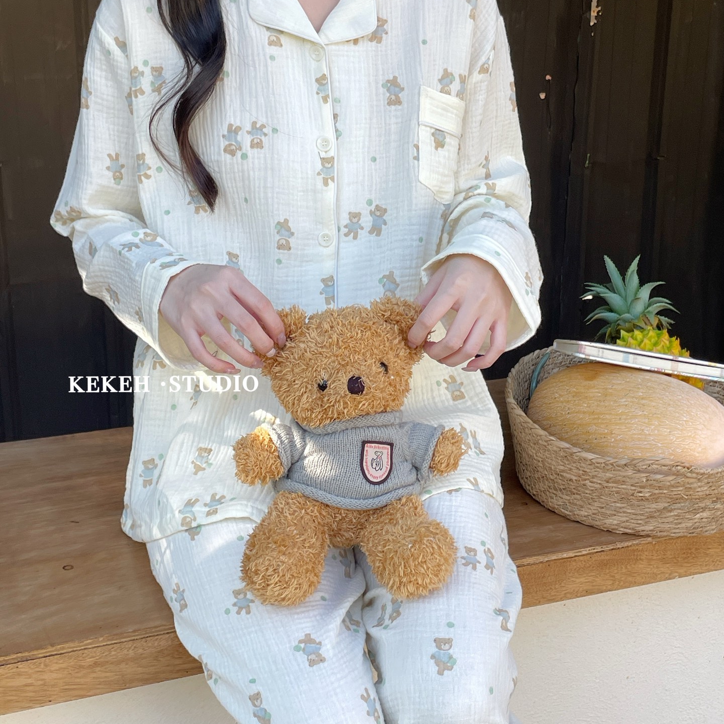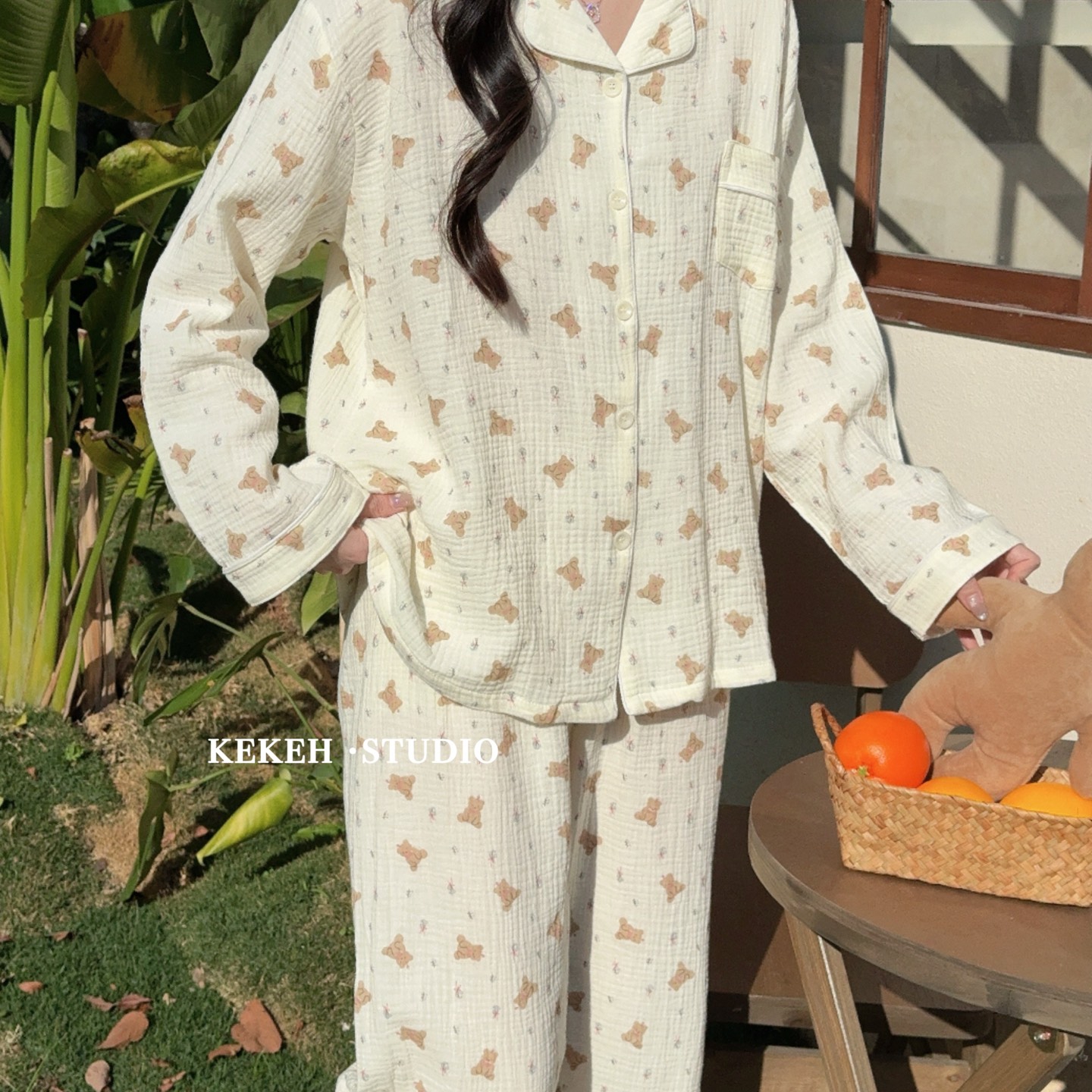 妍景家居生活馆 2026新款翻领绉绉纱套装 绿色小熊