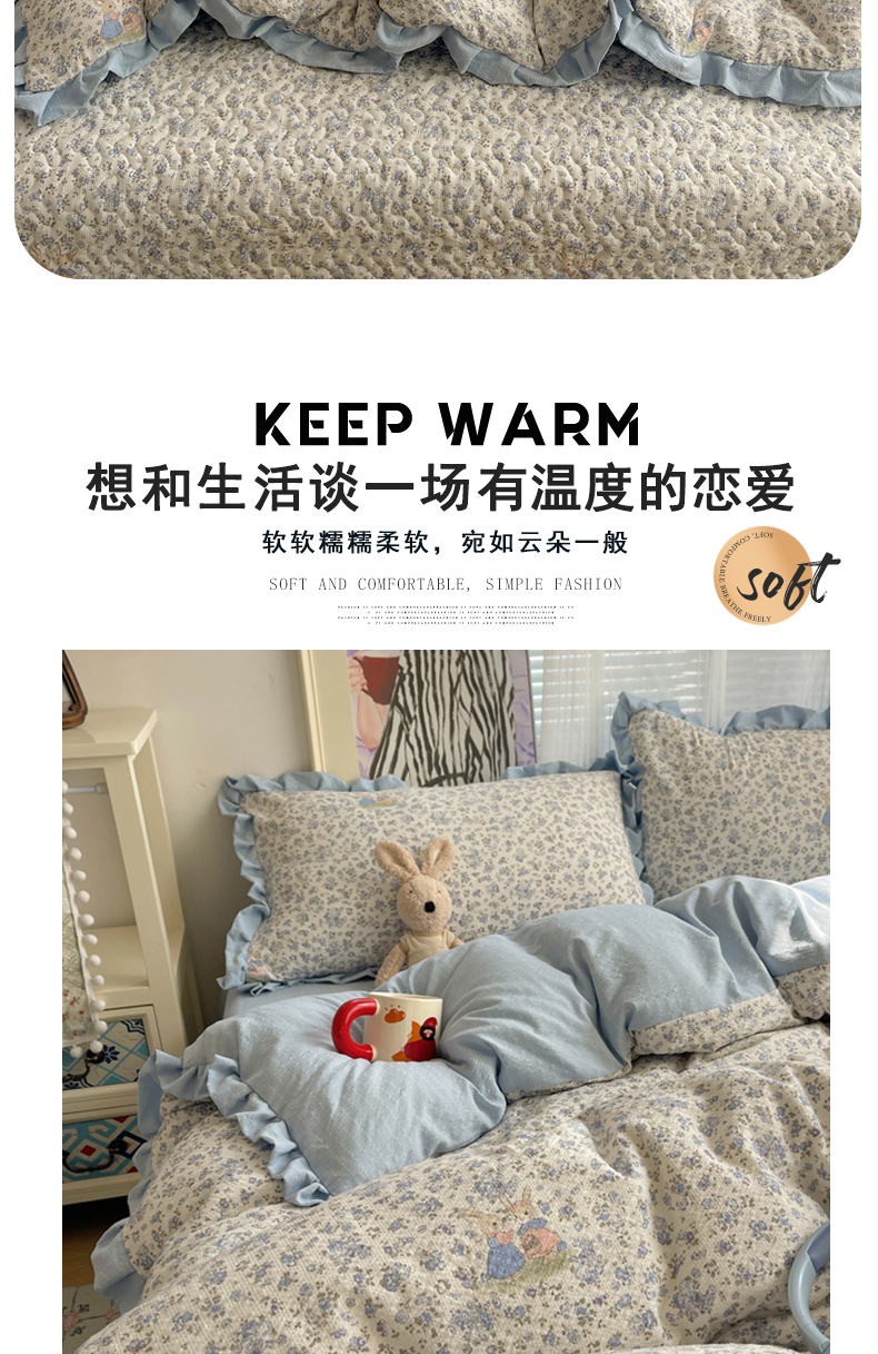 (总)迪梦姿家纺 2026新款高克重泡芙纱泡泡纱床盖款四件套系列,紫雾花蝶集,春日甜桃心米,纯宅熊,躲猫猫,花野兔眠,灰樱桃,旧街星星,猫咪集粉,莓系花伐,描线小猫咖,木马小花团,浅沙花影黄,浅沙花影蓝,田园兔,甜喵块块,甜心咖絮,甜心木马卷,兔仔花田,小兔裙边,星野蝴蝶结,悦悦小兔,只闻花香