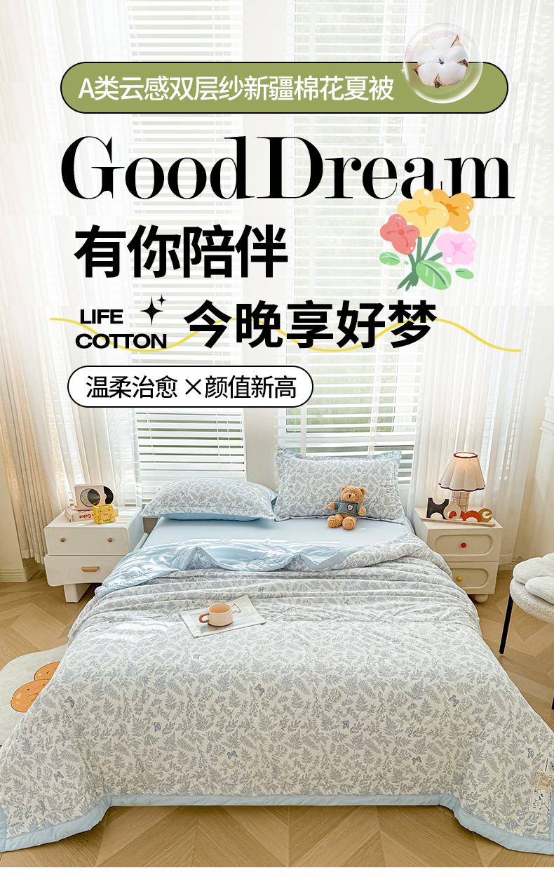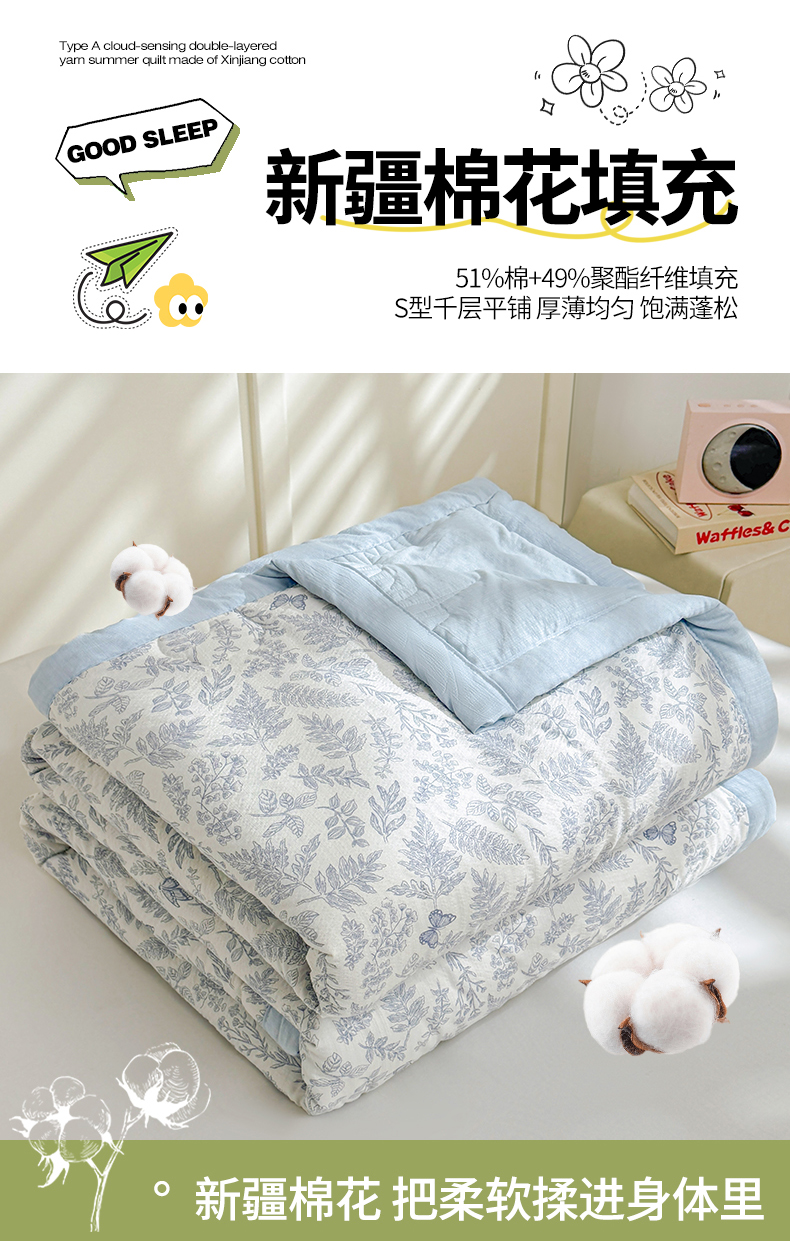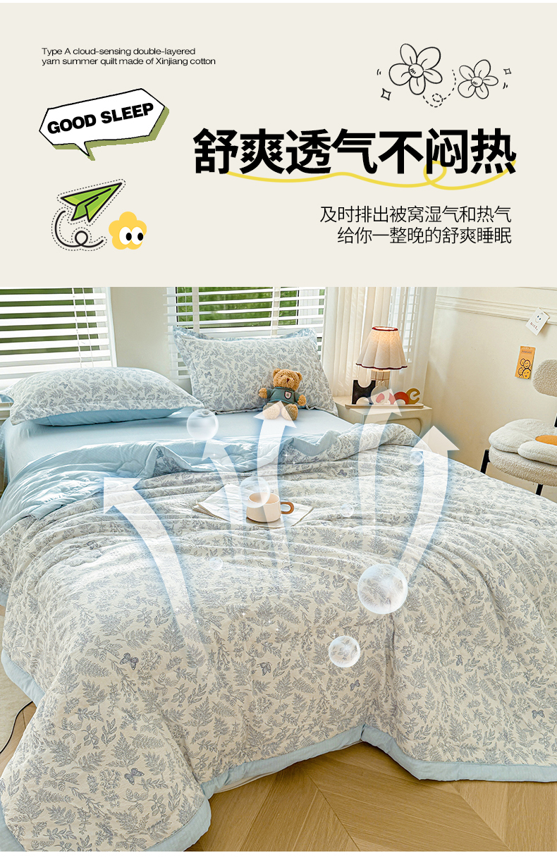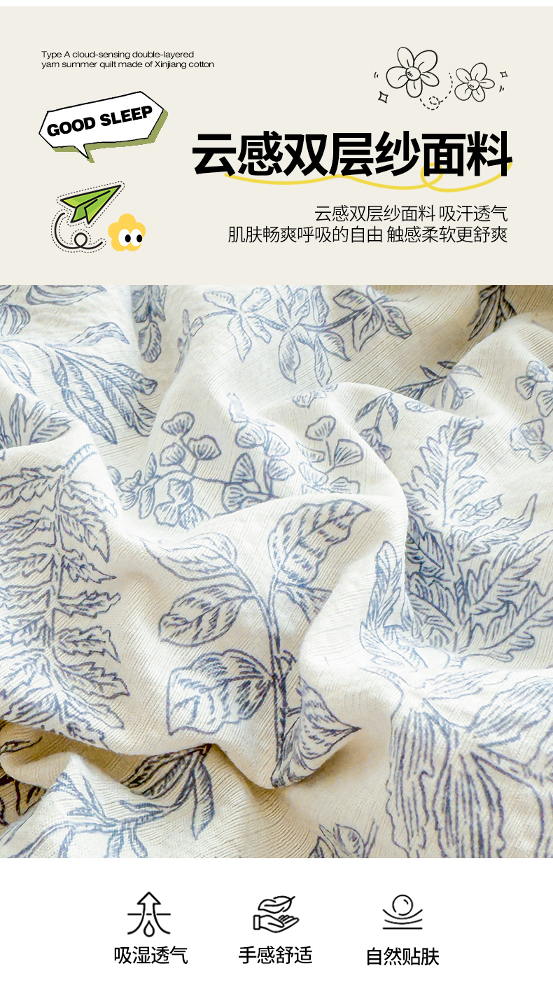 商品名称:2026新款A类新疆棉花夏凉被加宽包边水洗棉卡通印花吸湿透气棉花夏被空调被 云感叶初语
