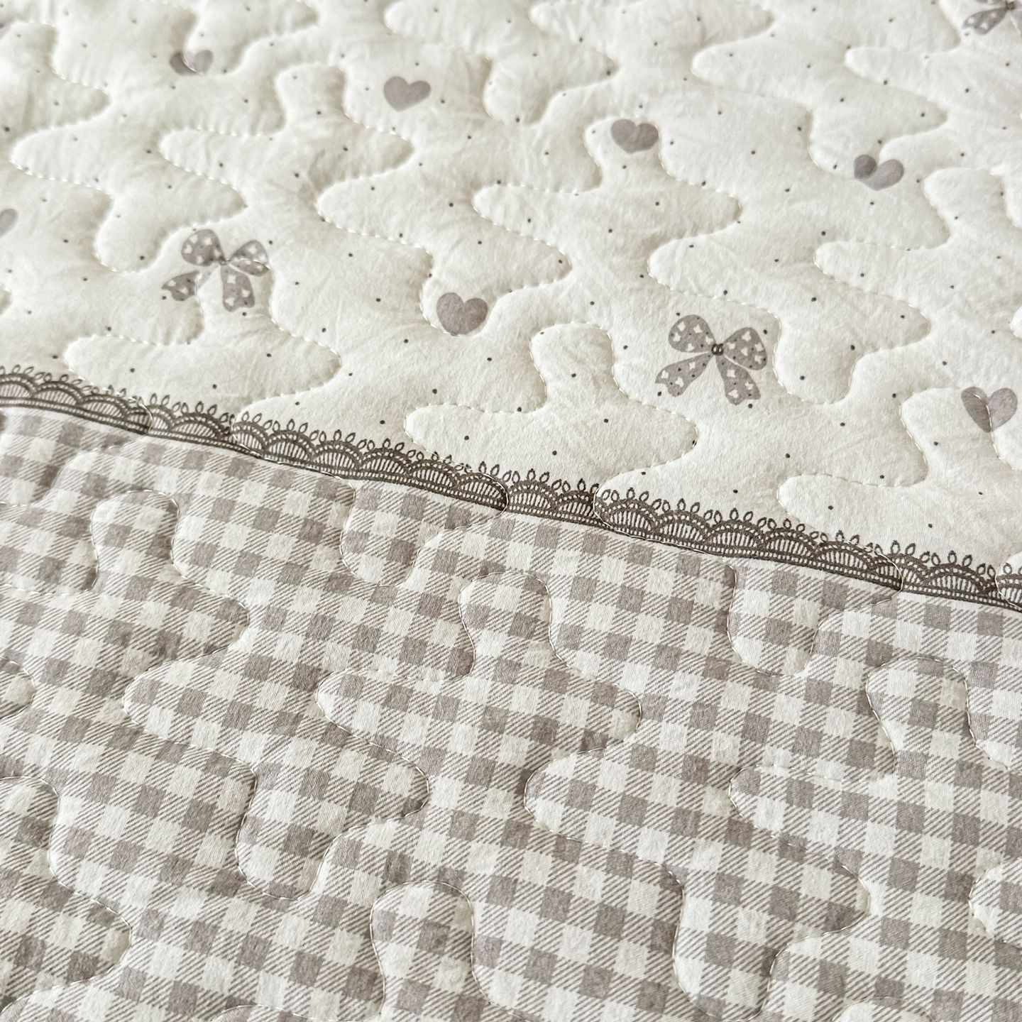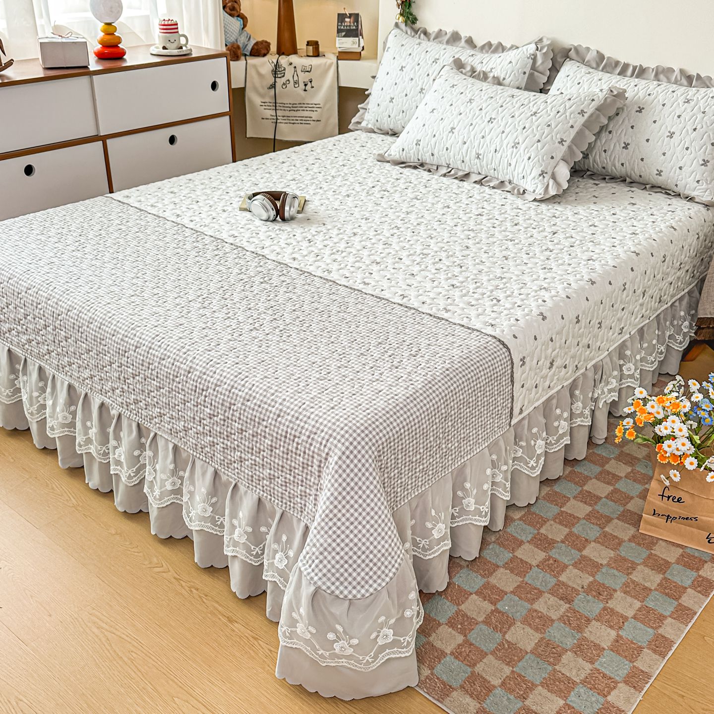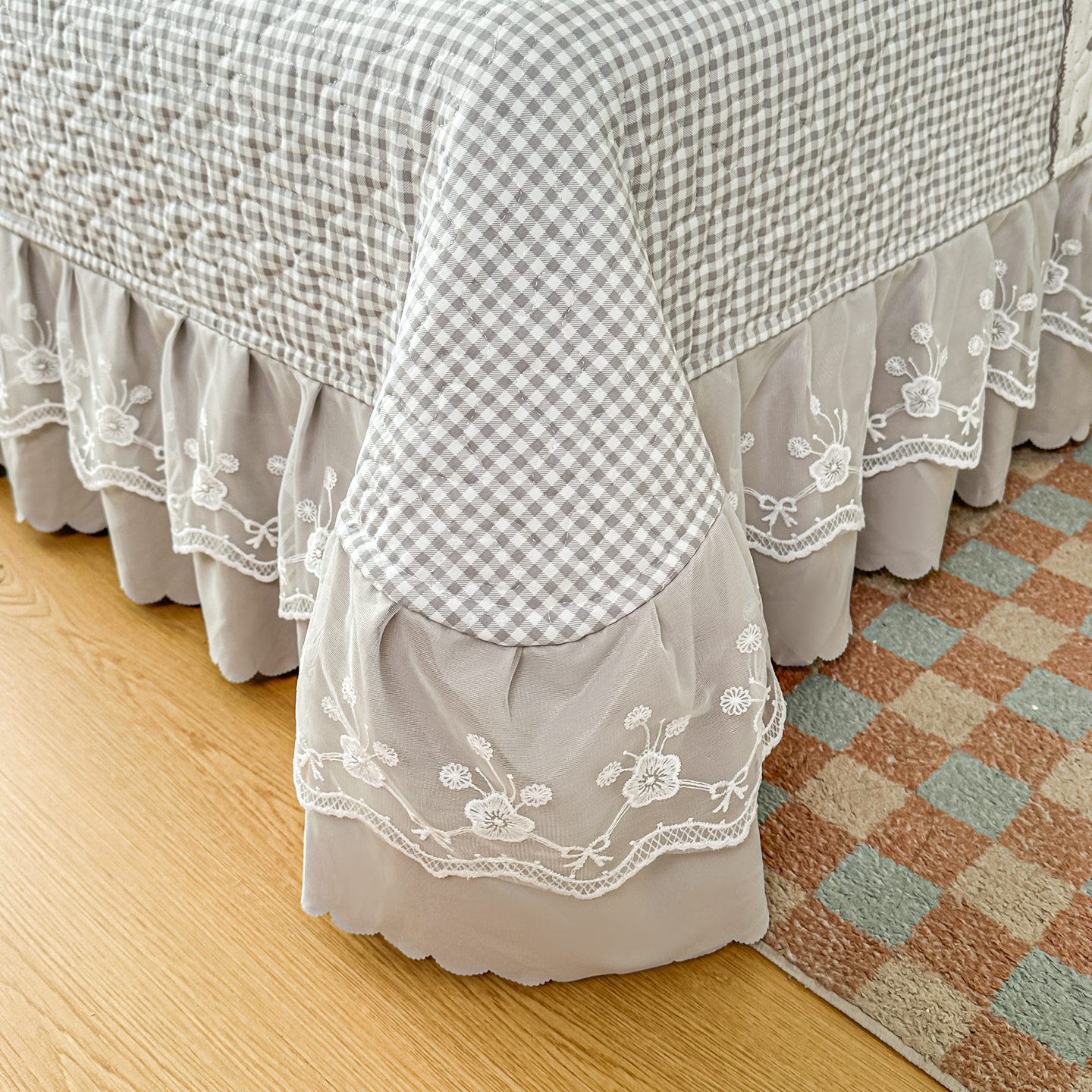 雅眠居 2026新款直播爆款古法仿棉双层蕾丝花边床盖四件套 彩格-灰