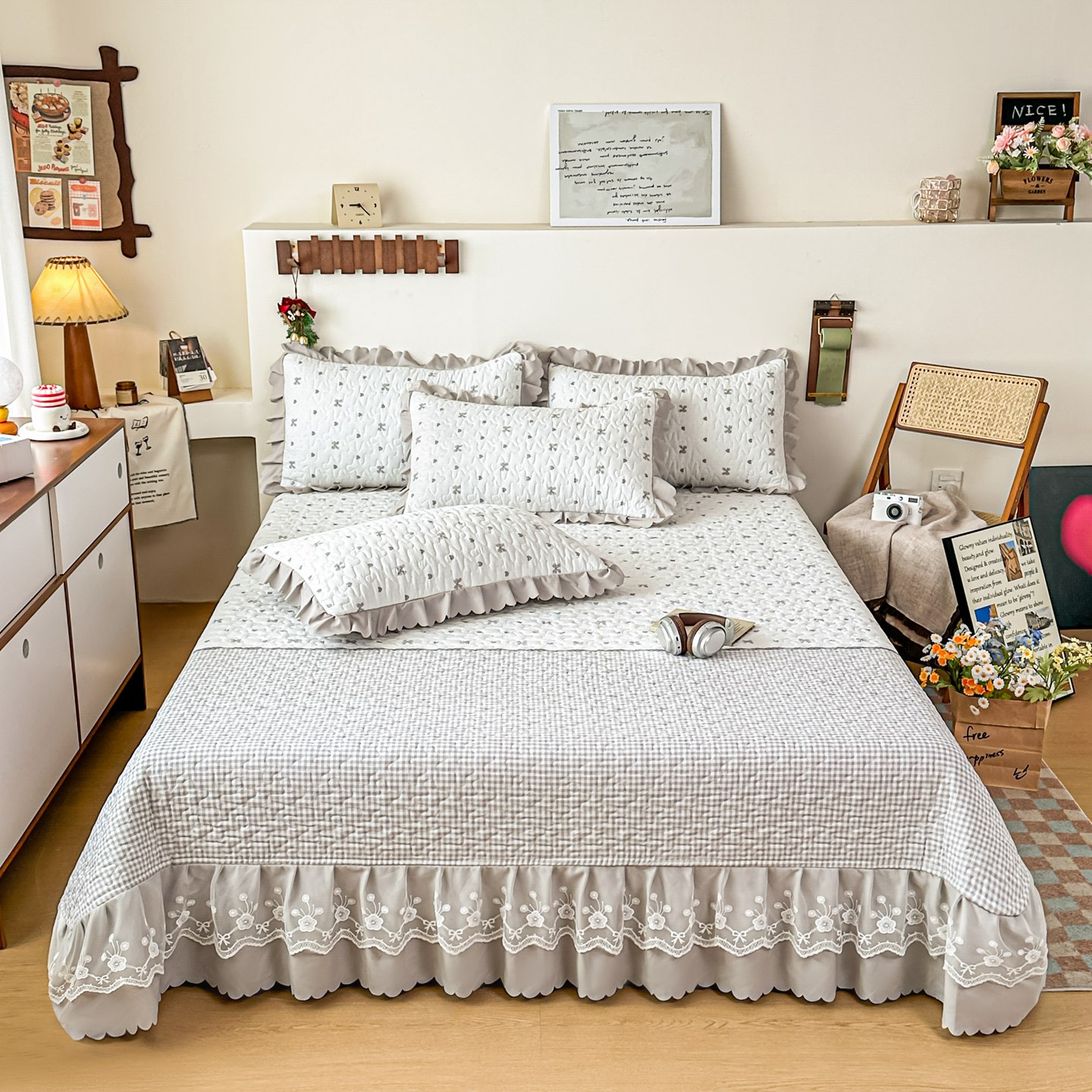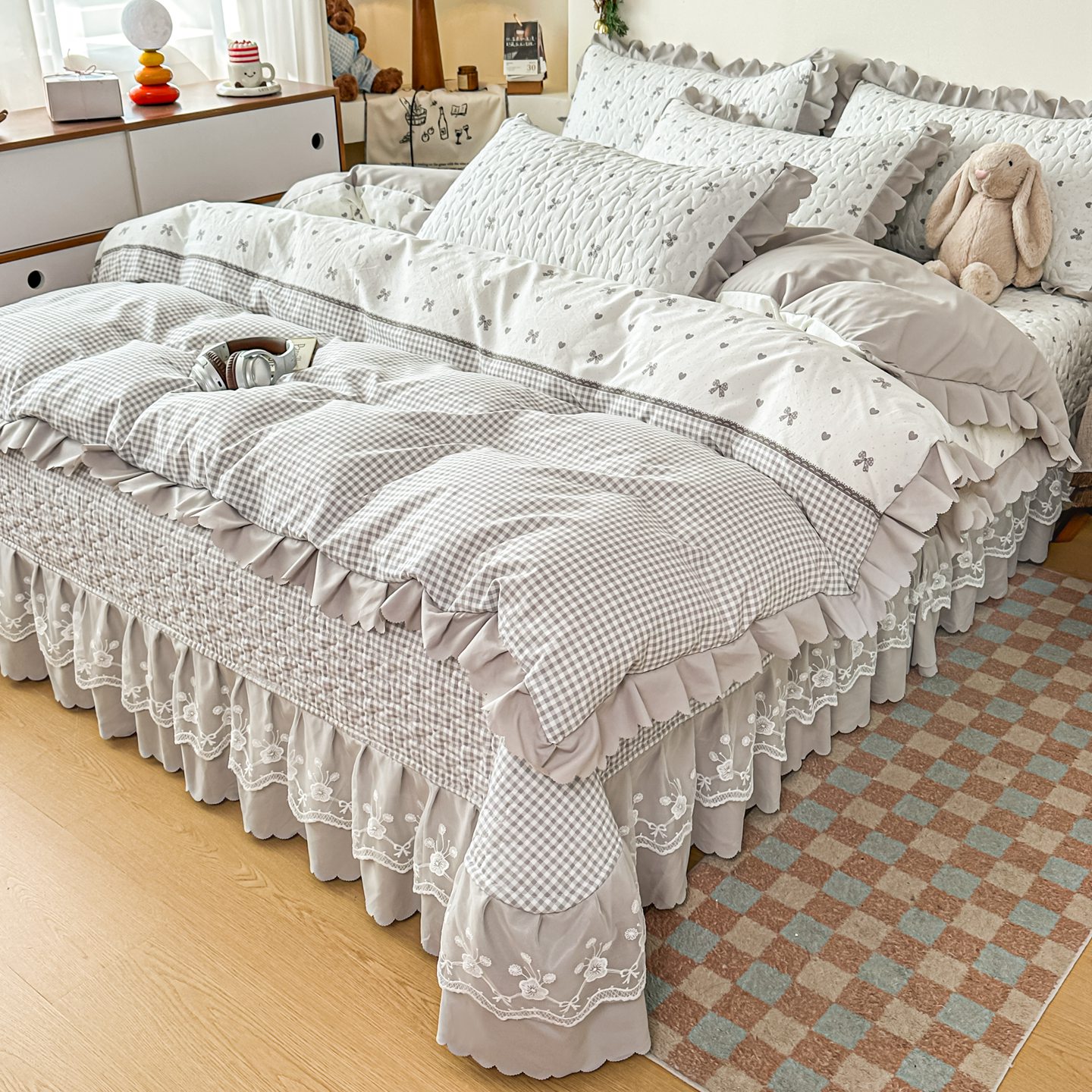 当前位置: 91家纺网 > 商品网购 > 床上用品 > 床盖 > 雅眠居 2026新款直播爆款古法仿棉双层蕾丝花边床盖四件套 彩格-灰