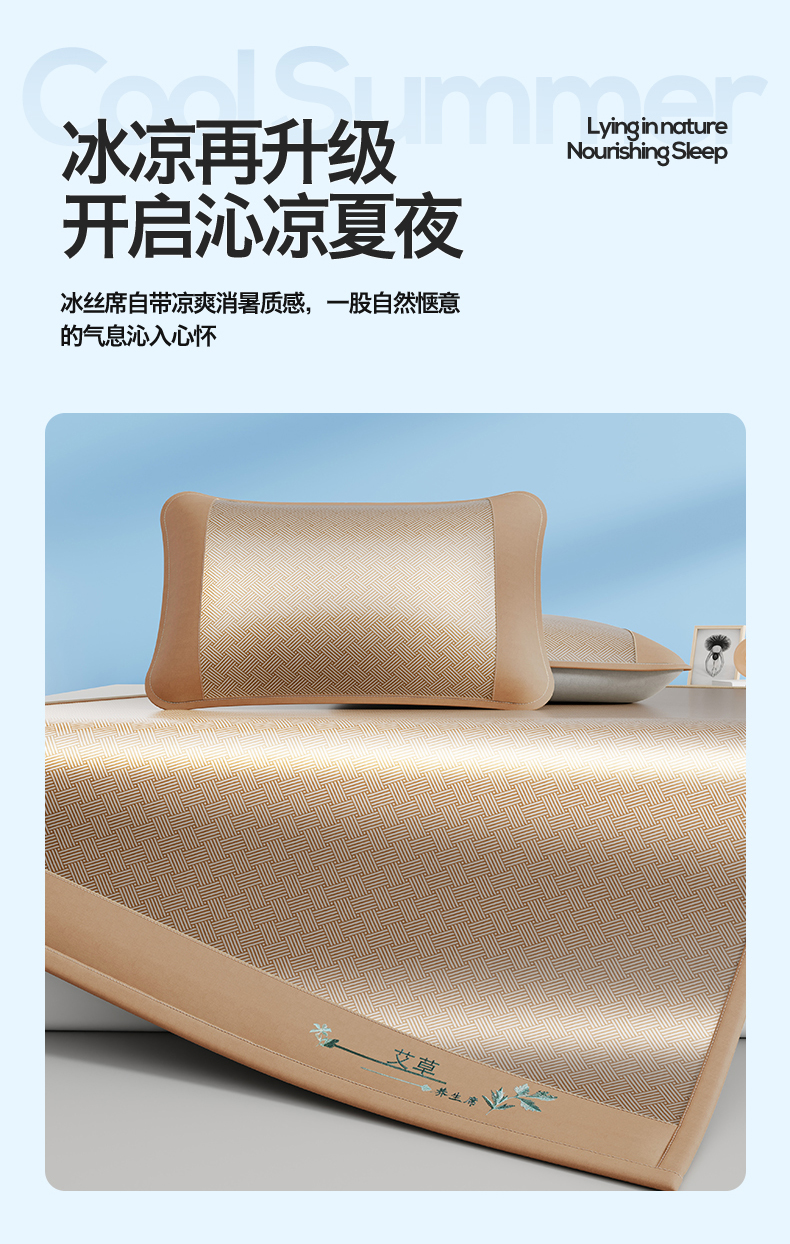 当前位置: 91家纺网 > 商品网购 > 床上用品 > 凉席 > 好艺佳毛毯 2026新款艾草凉席冰丝席绣花高密碳光软席PE饼干花三件套学生宿舍可机洗水洗 艾草冰丝席-摩尼咖