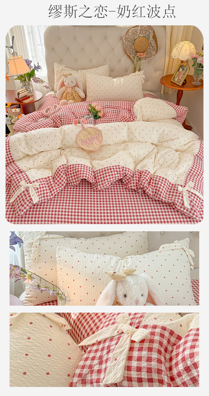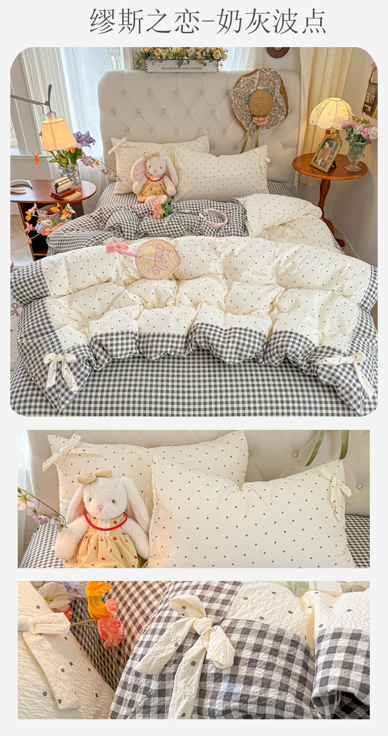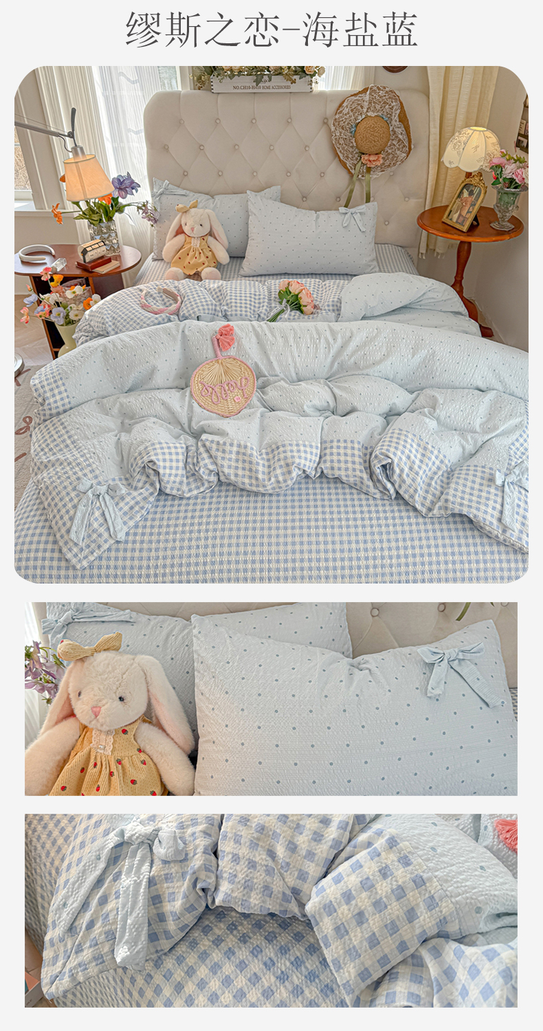 当前位置: 91家纺网 > 商品网购 > 床品套件 > 四件套 > 其它四件套 > (总)子钦家纺 2026春夏新款提花泡芙棉蝴蝶结拼角工艺床单床笠四件套-缪斯之恋