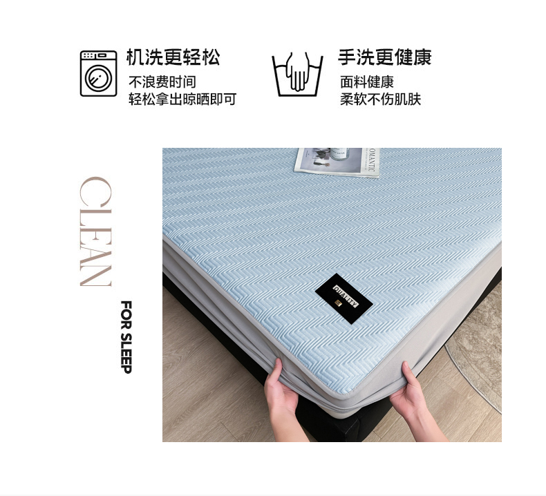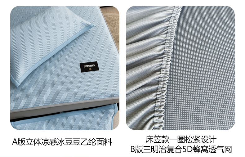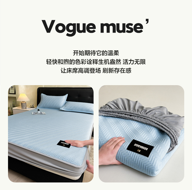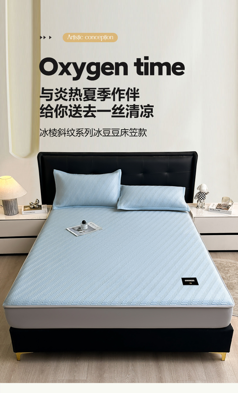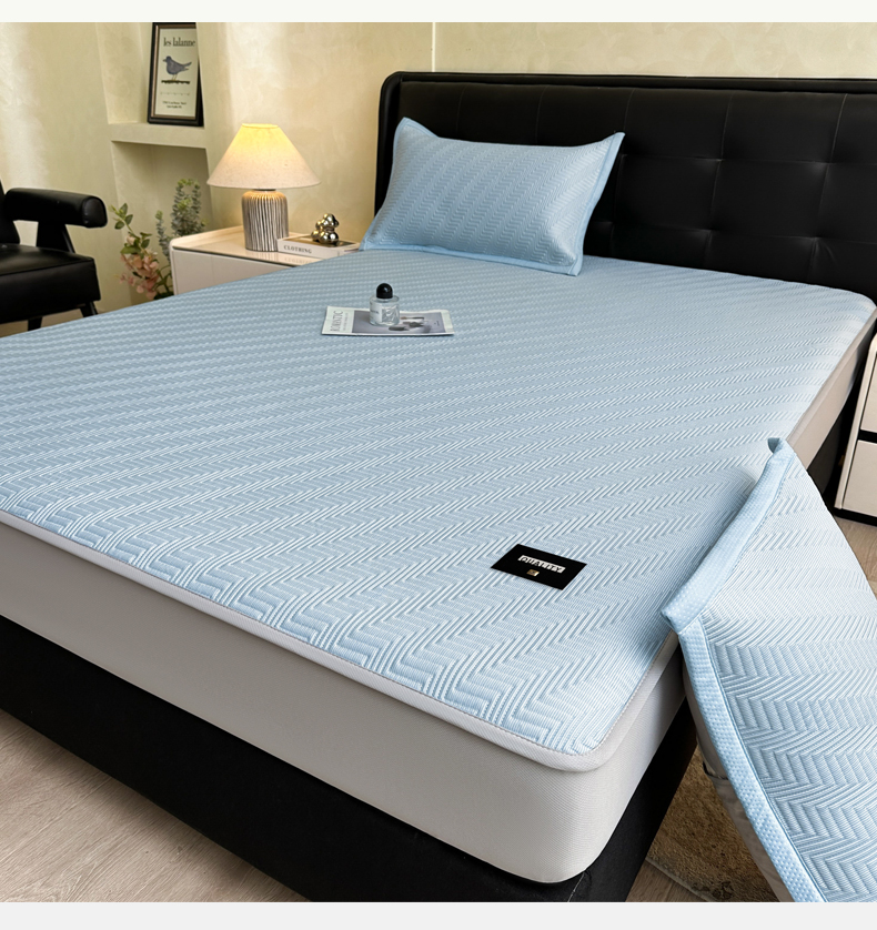 • 91家纺网 家纺一手货源 找家纺 慕木家纺 2026新款A类高克重三明治复合乙纶提花冰豆豆凉席床笠冰棱斜纹系列(提供买家秀) 冰棱斜纹-蓝床笠款