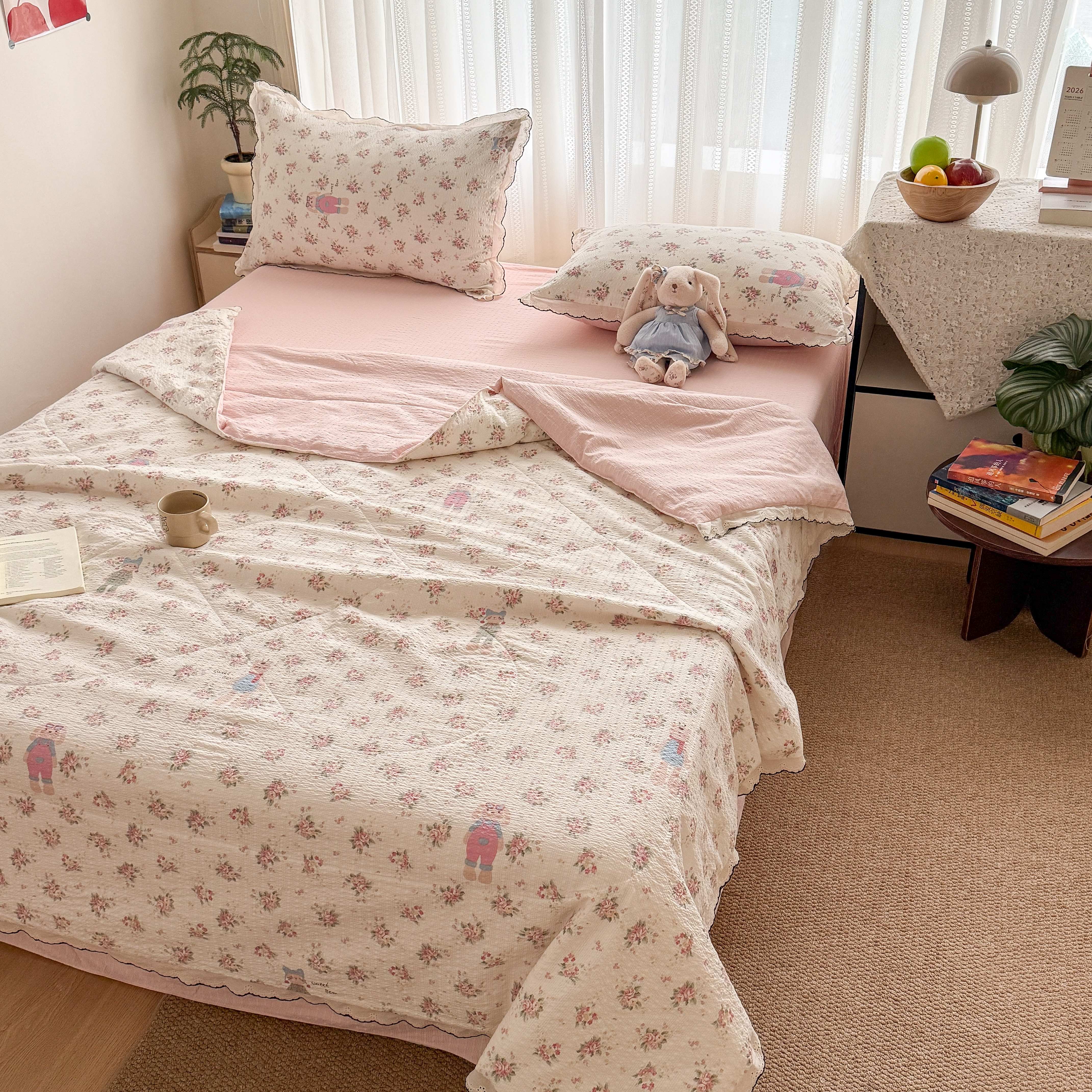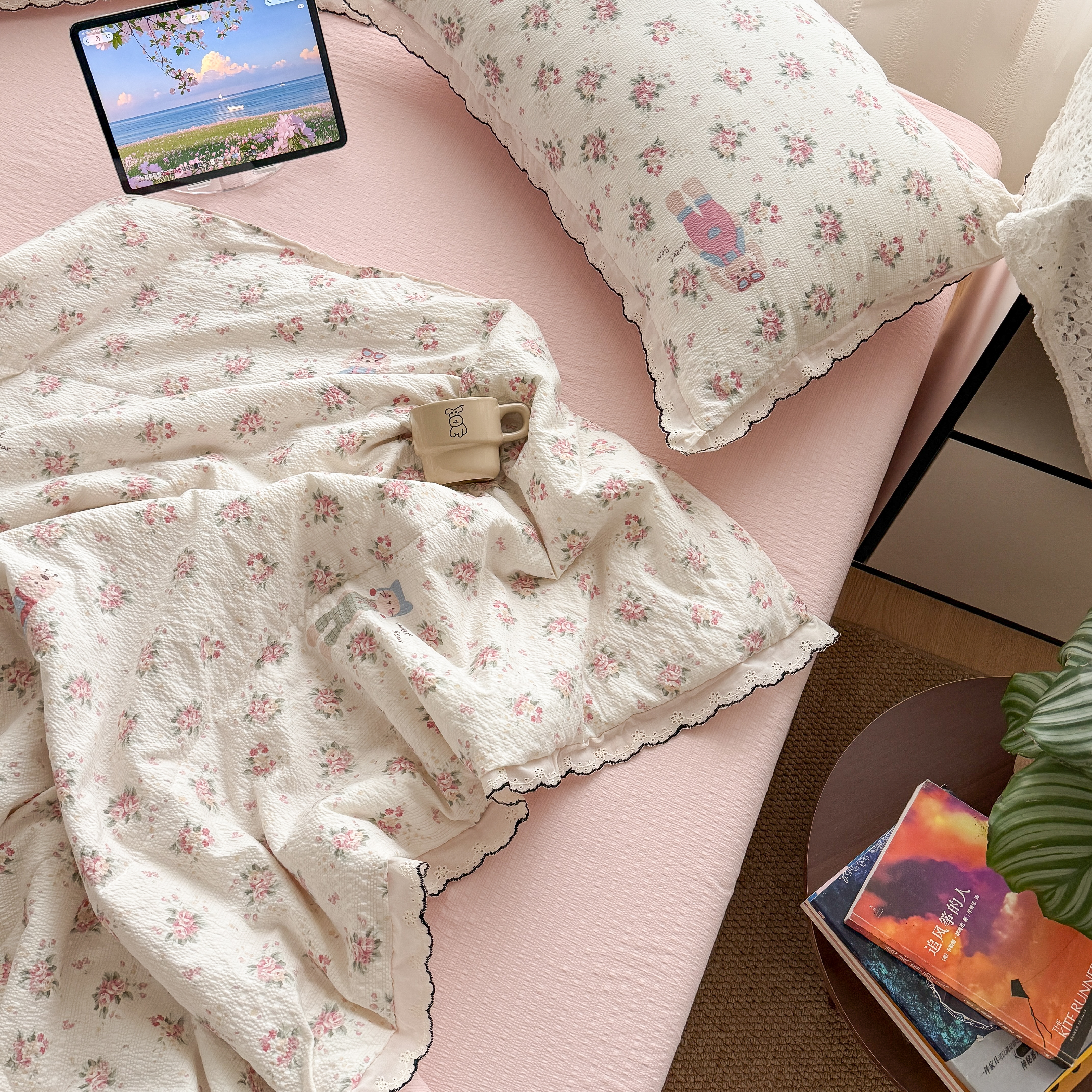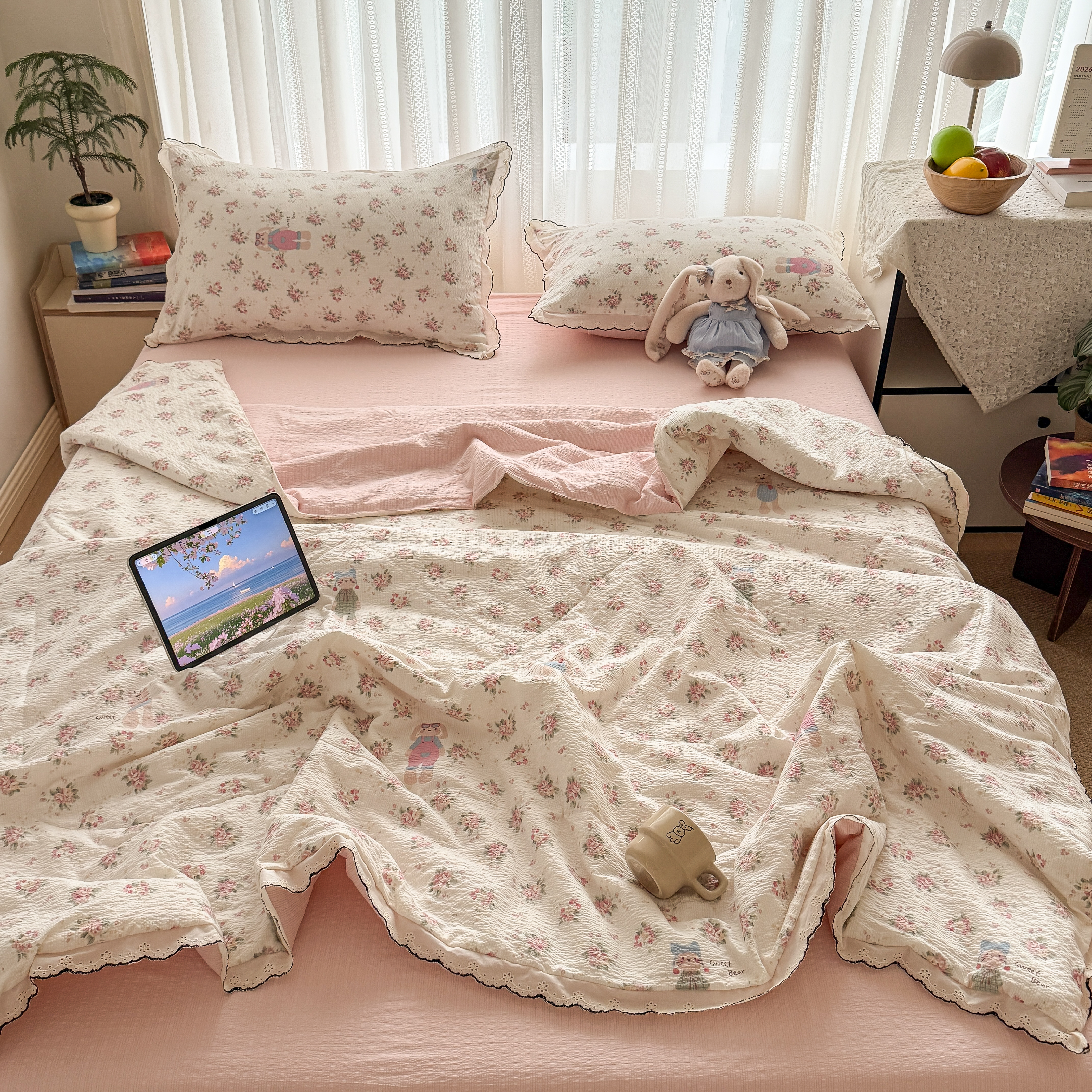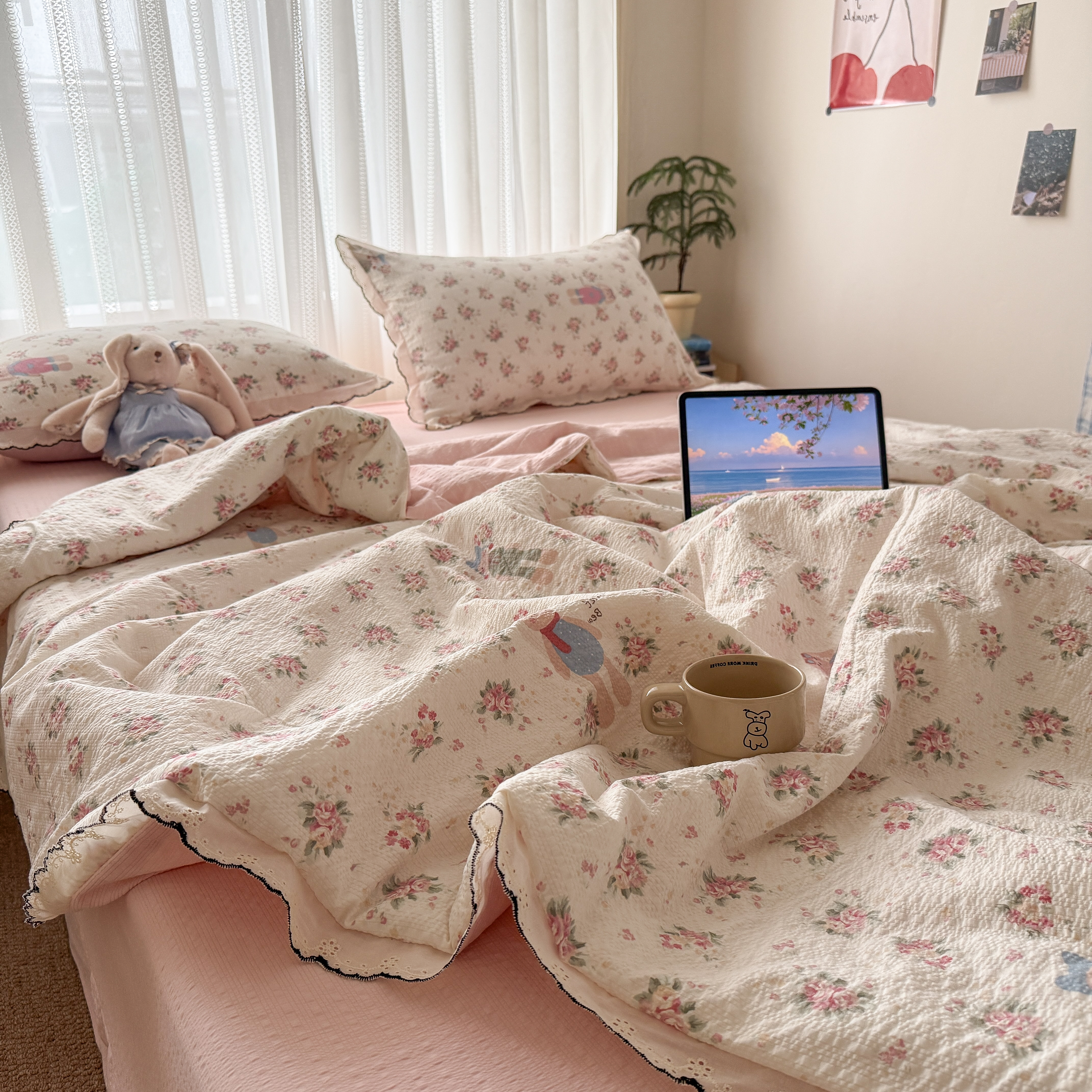 欧尚 2026新款蕾丝花边夏被款四件套 花丛萌兔