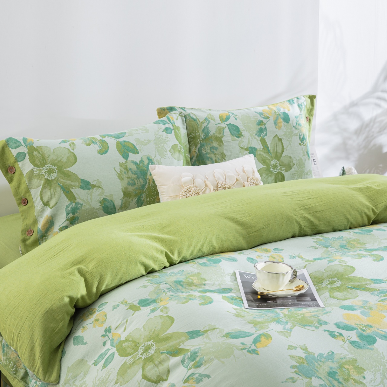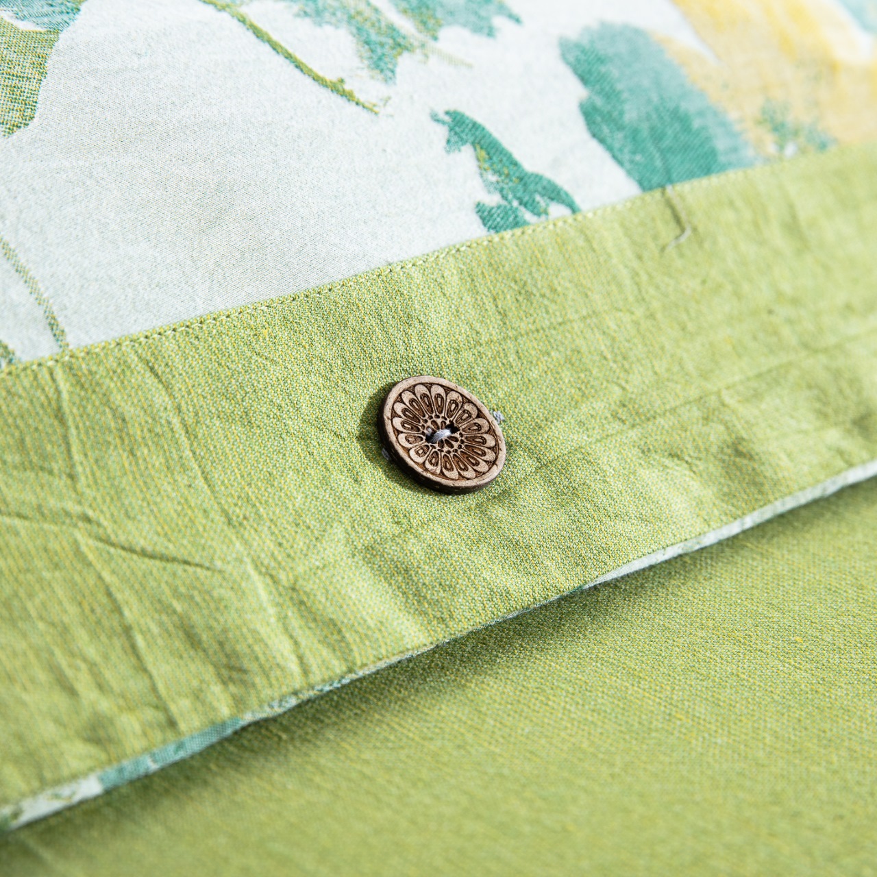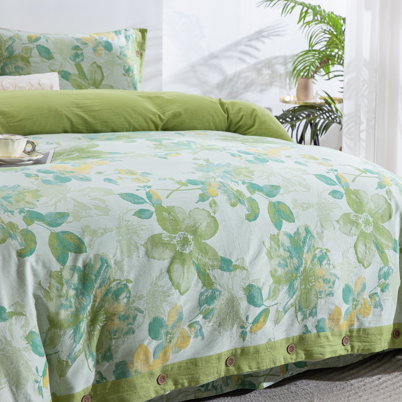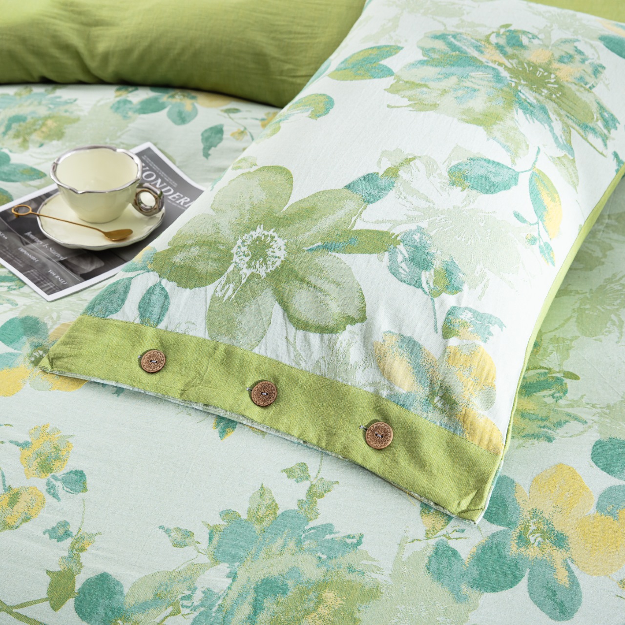 商品名称:仰望棉麻双层纱供应链 2026新款念奴娇全棉纯棉色织提花纽扣款四件套 念奴娇-绿色