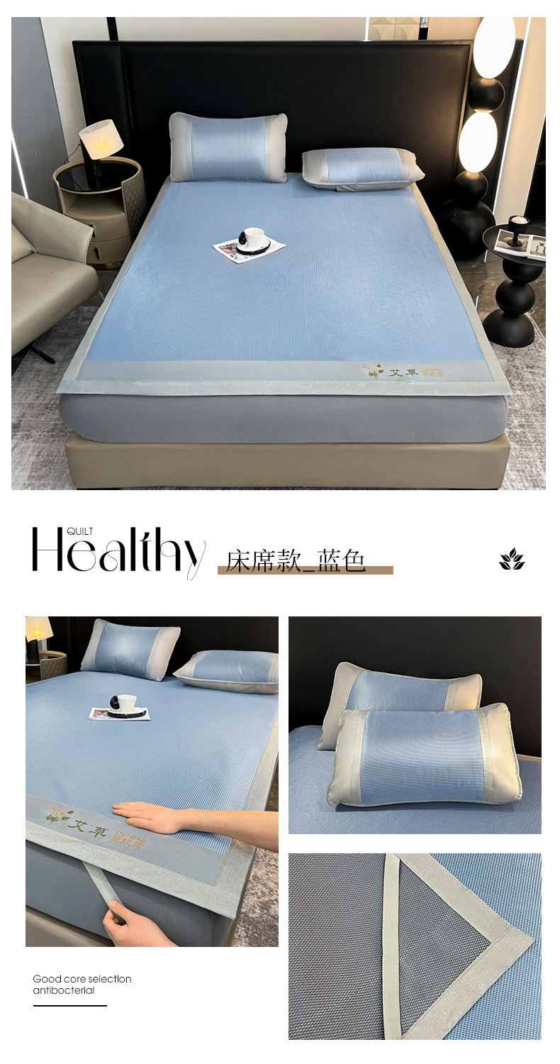 • 91家纺网 家纺一手货源 找家纺 航途席业 2026新款刺绣可水洗碳光冰丝席宽包边无纺布冰丝席艾香系列 艾香千鸟格床席款蓝色