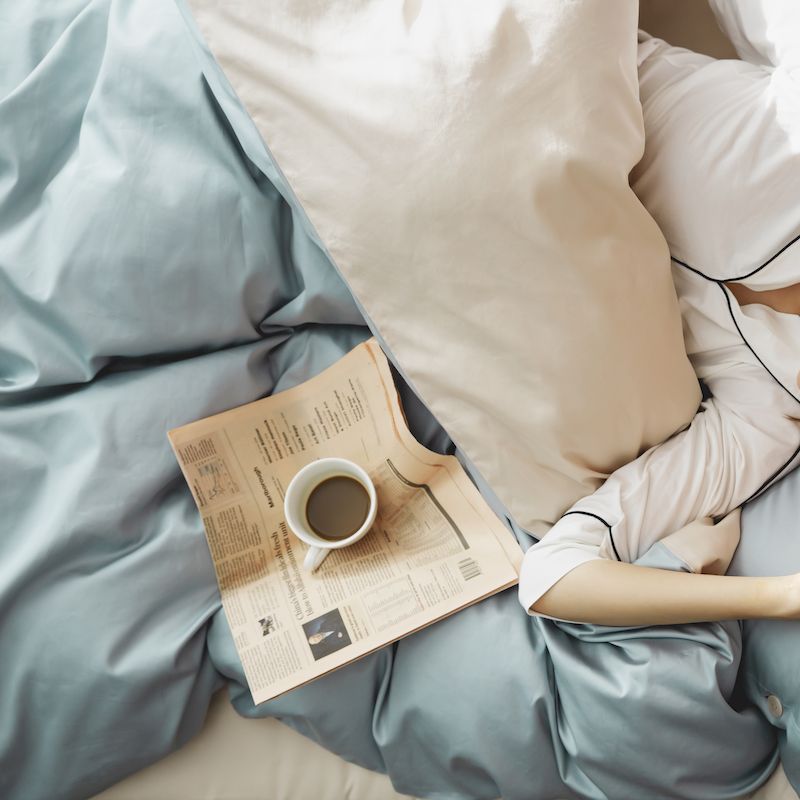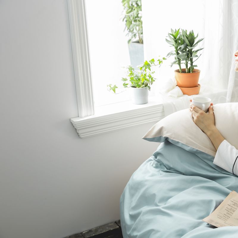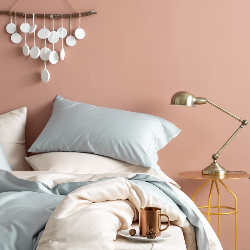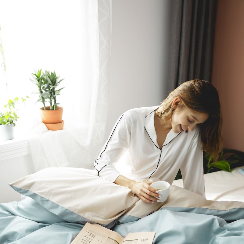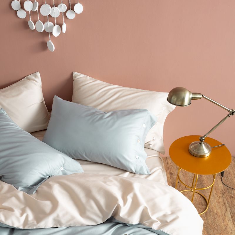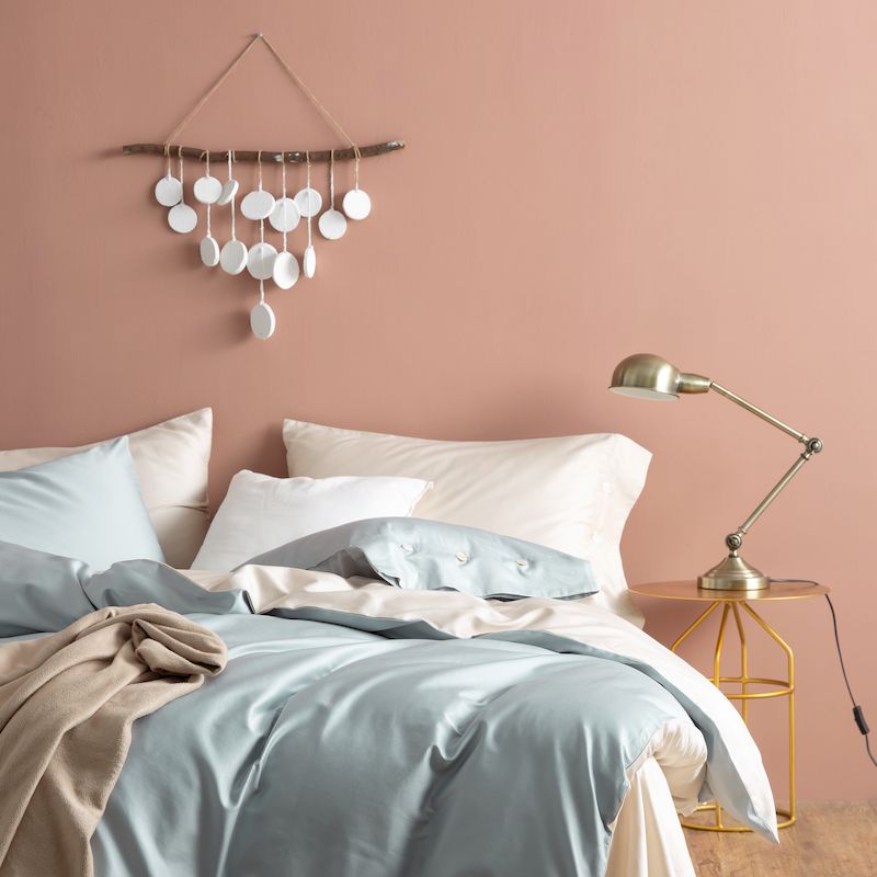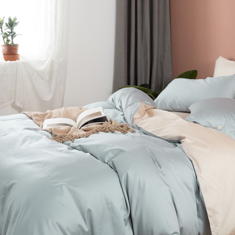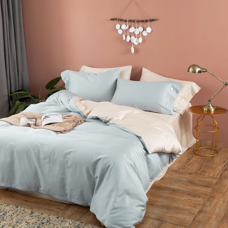 涞澳家纺2019新60长绒棉平色二简易四件套亚麻灰配普鲁士蓝