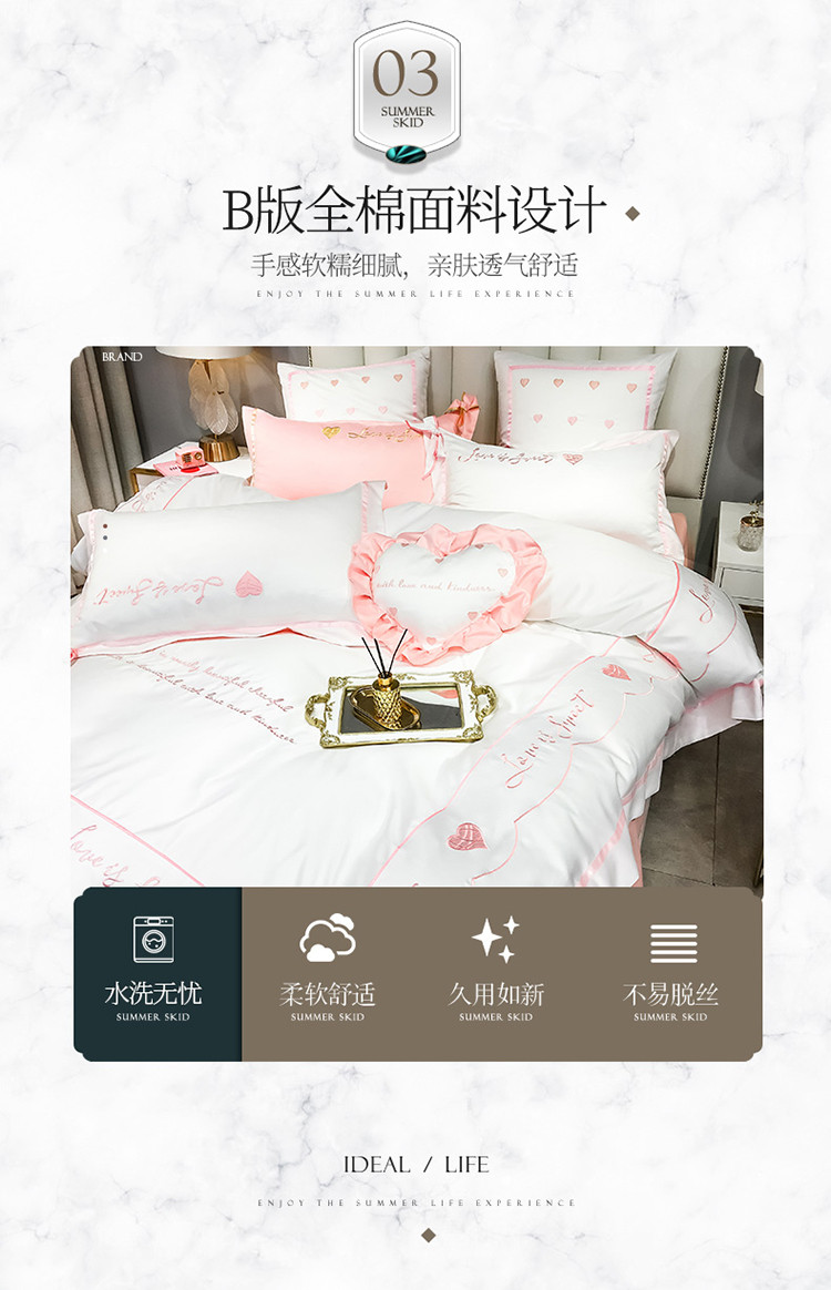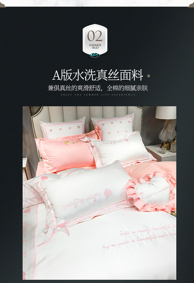 眠帛家居 2020新款60水洗真丝刺绣心心相印四件套 白色