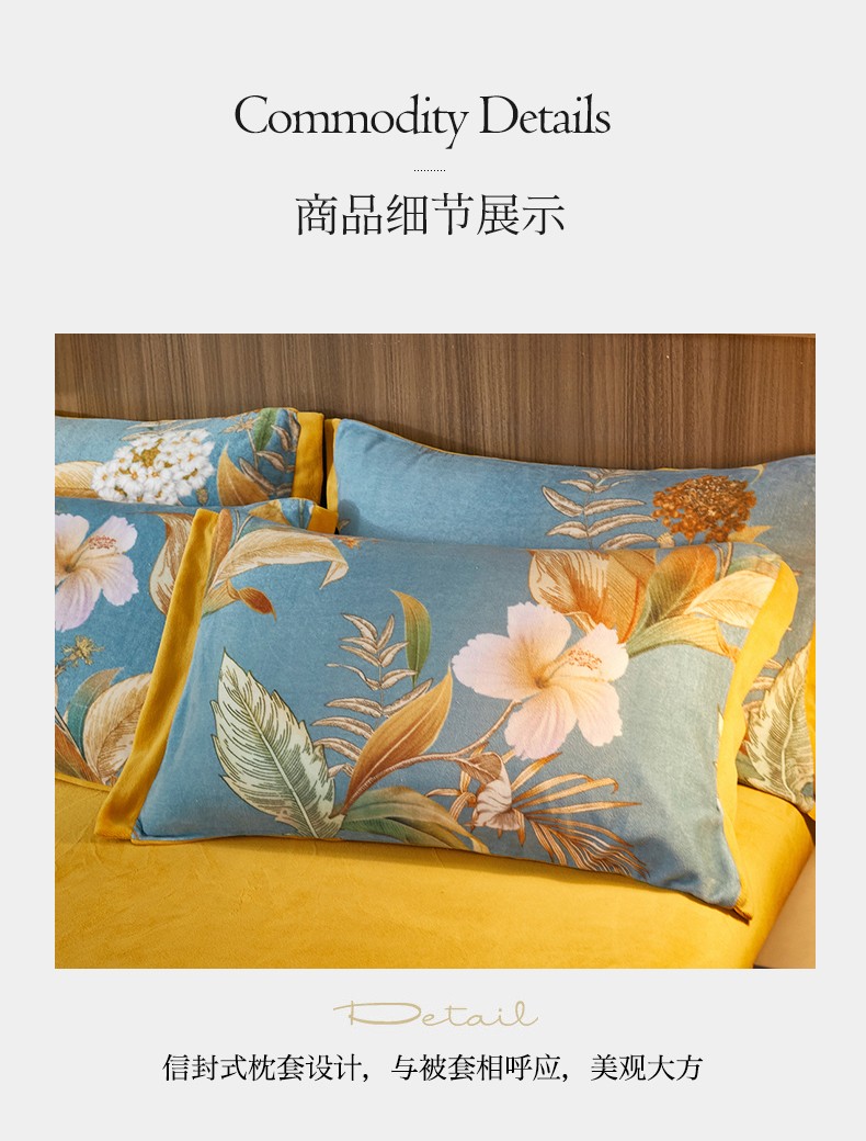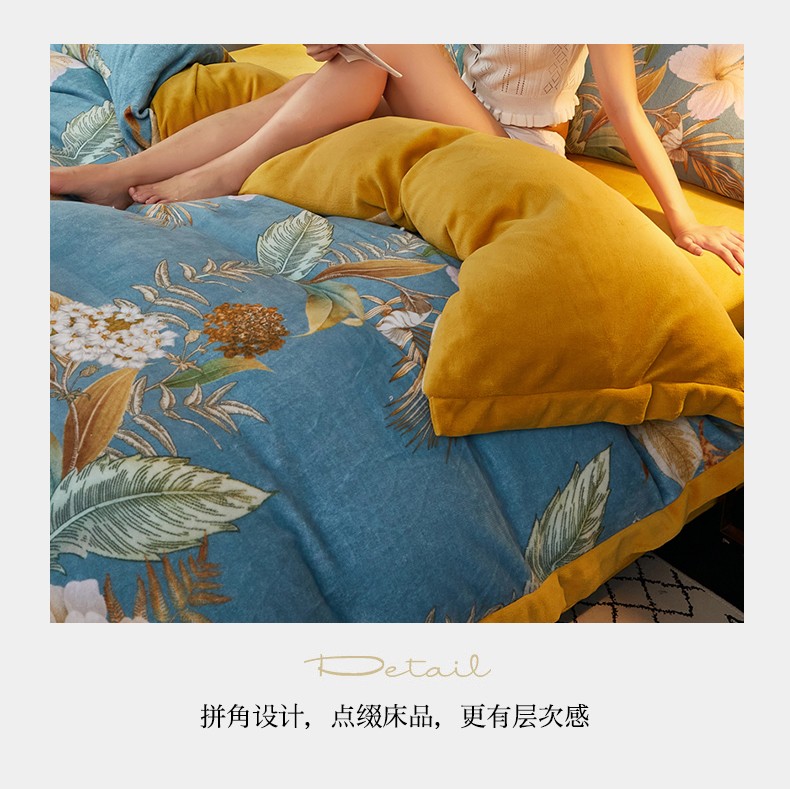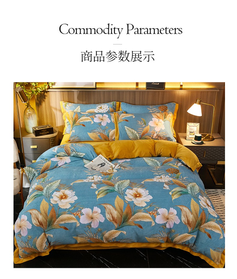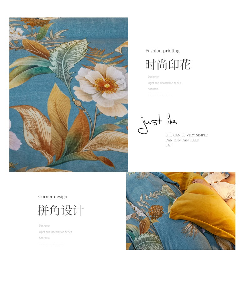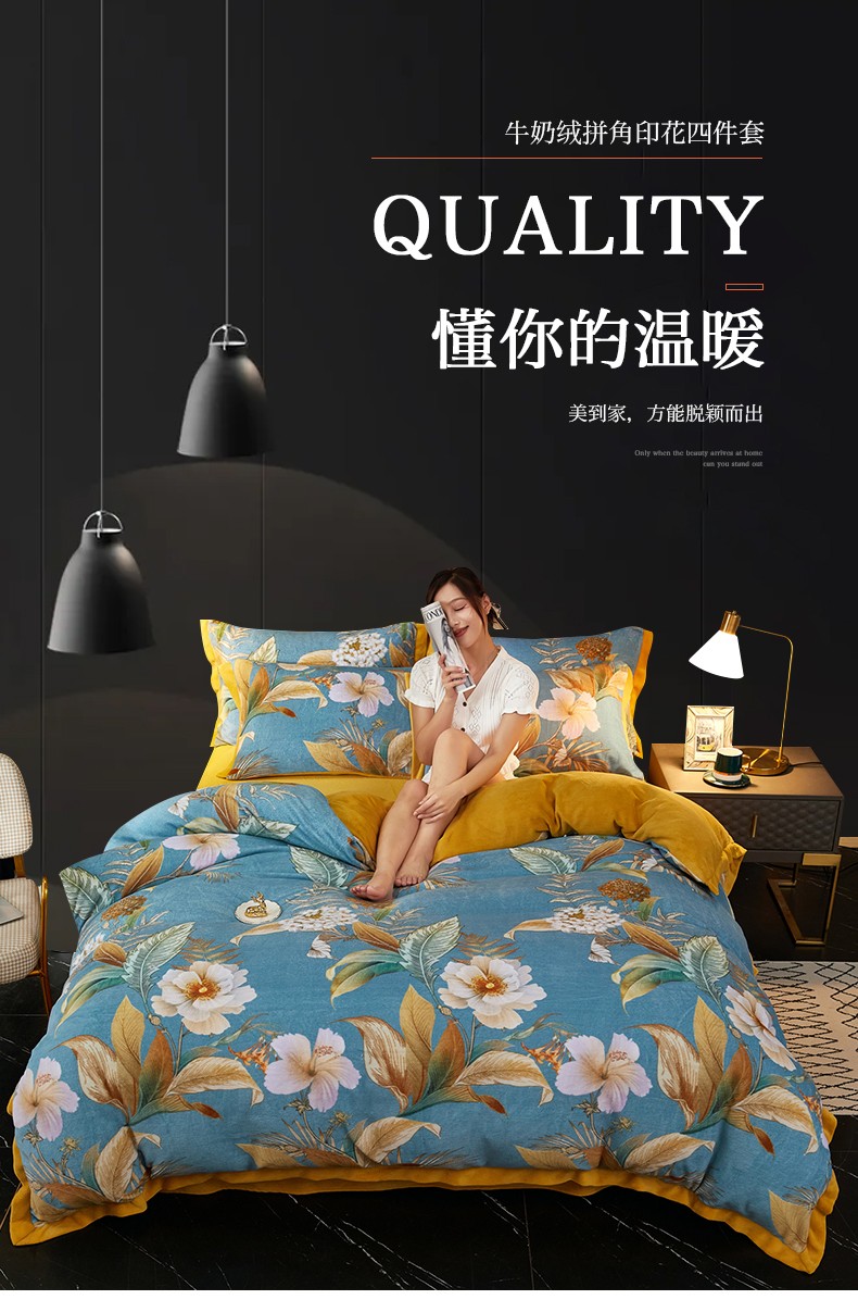 商品名称:澳洲羽 2024年新牛奶绒拼角印花四件套水晶法莱绒直播供货 花漾 蓝