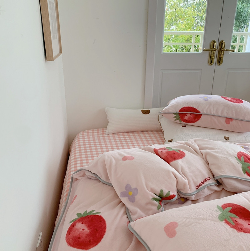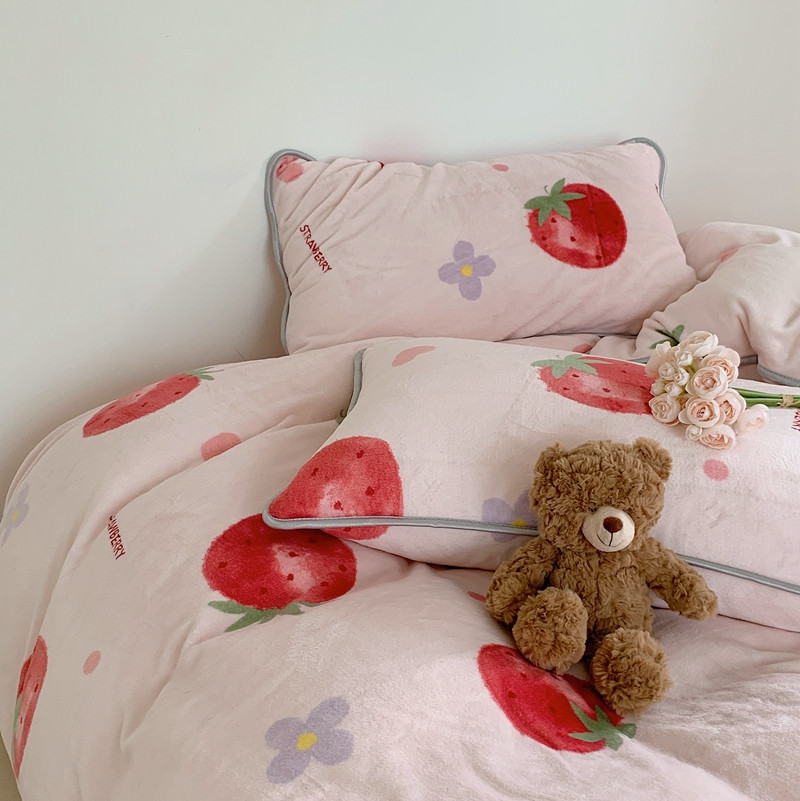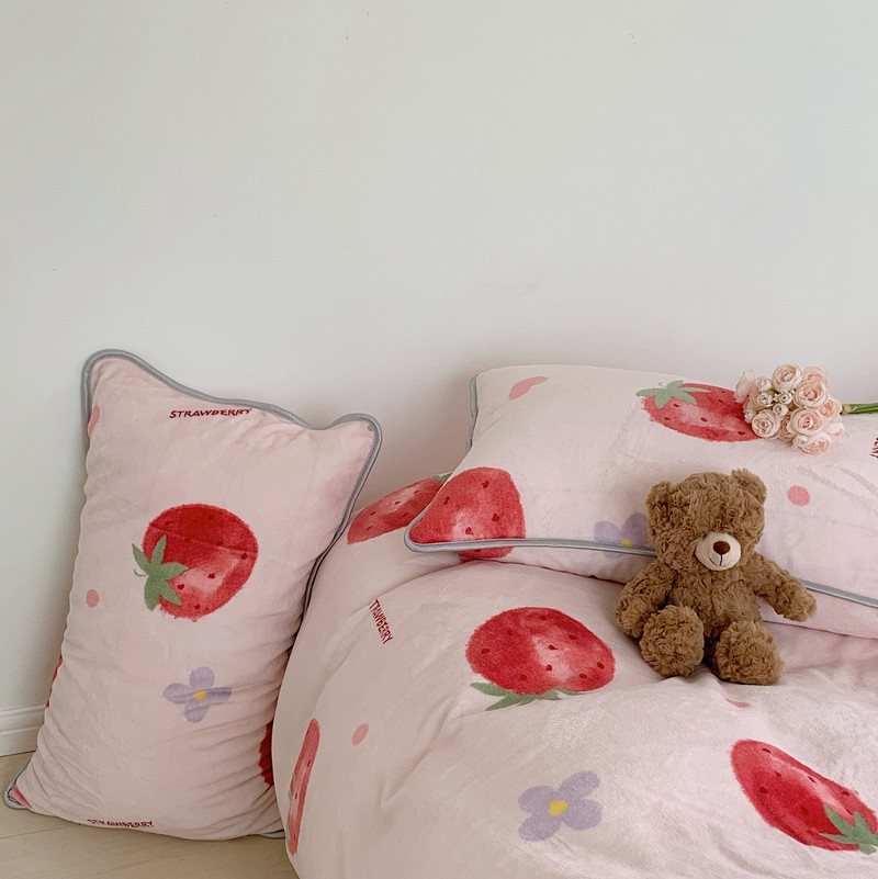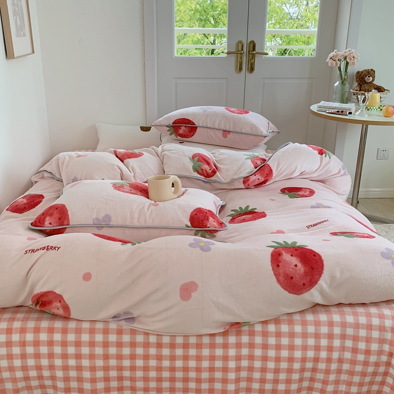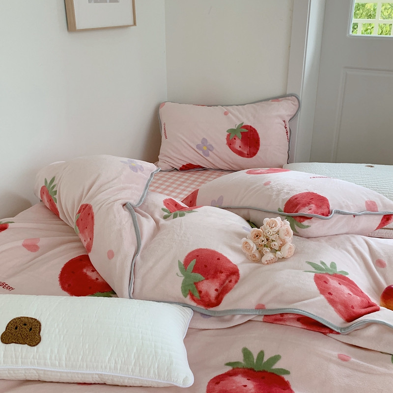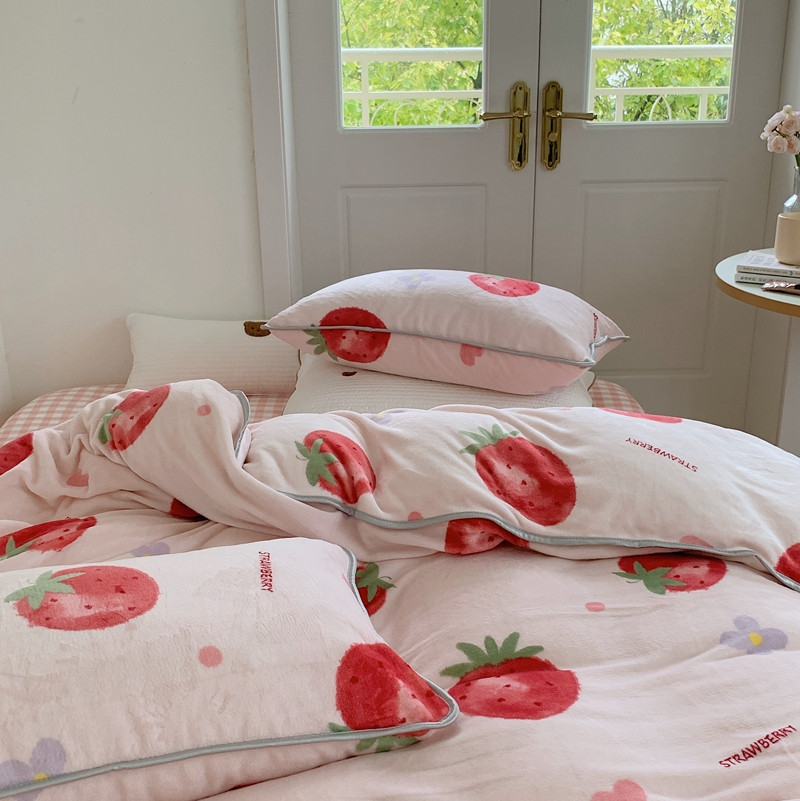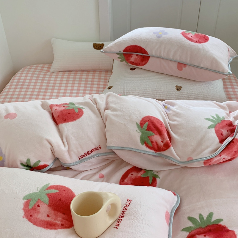 顾里2021新款ins韩国高端保暖牛奶绒四件套 花花草莓