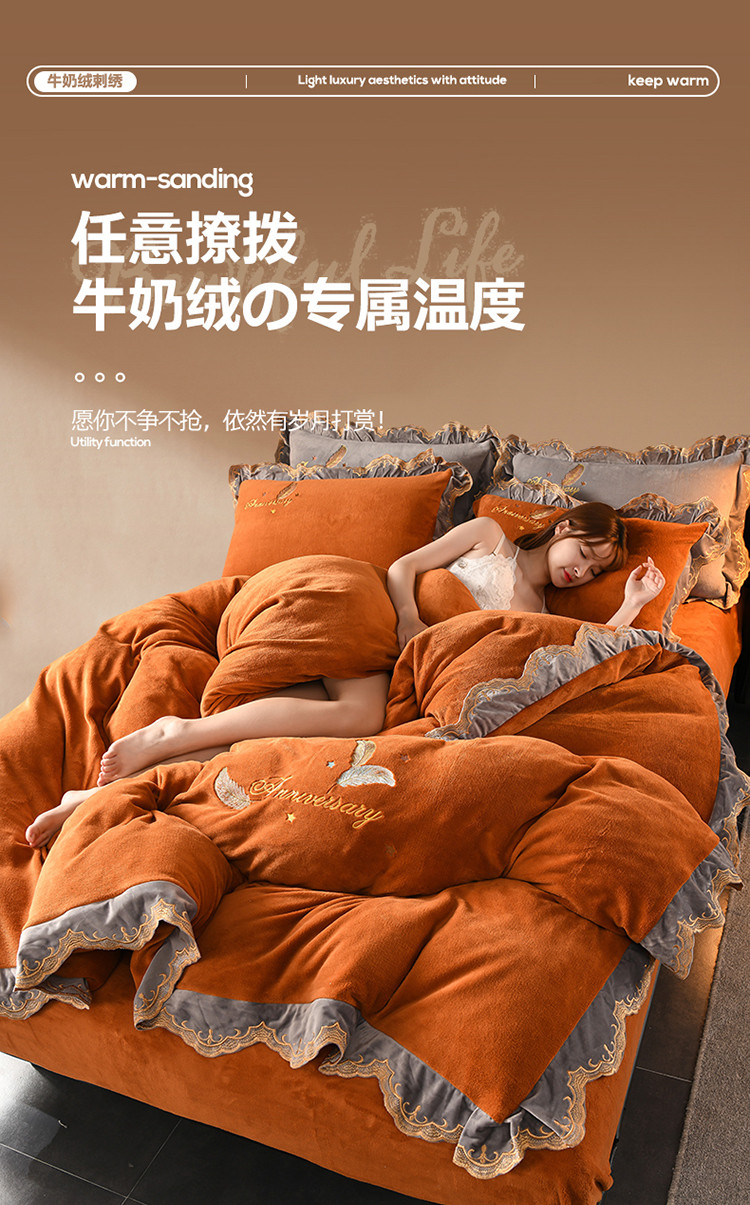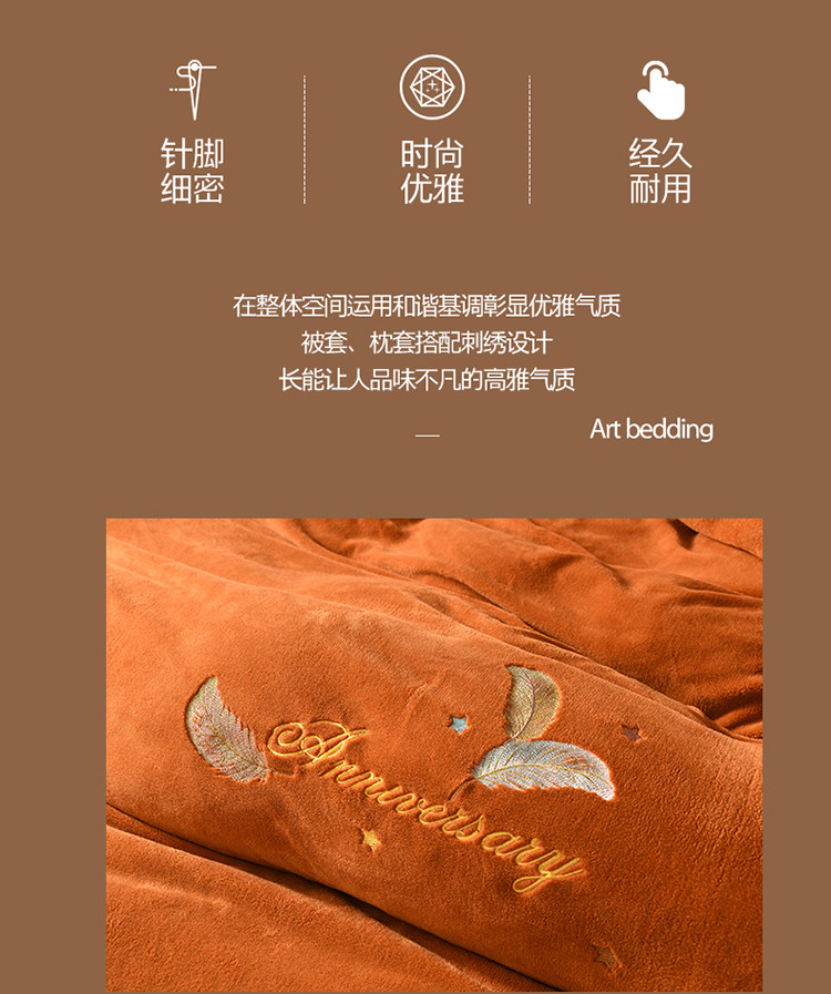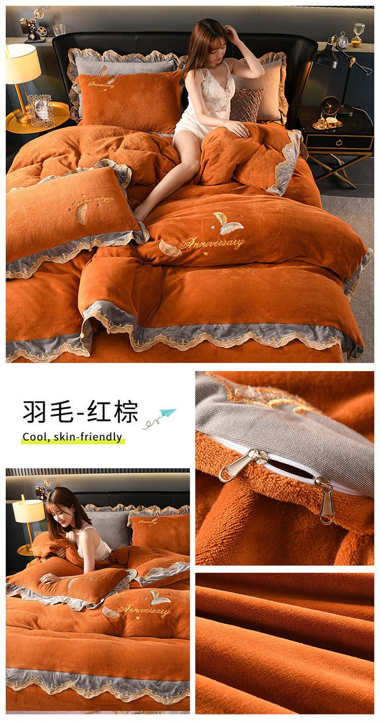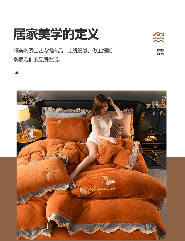 眠帛家居 2021新款秋冬牛奶绒刺绣工艺四件套 羽毛-红棕