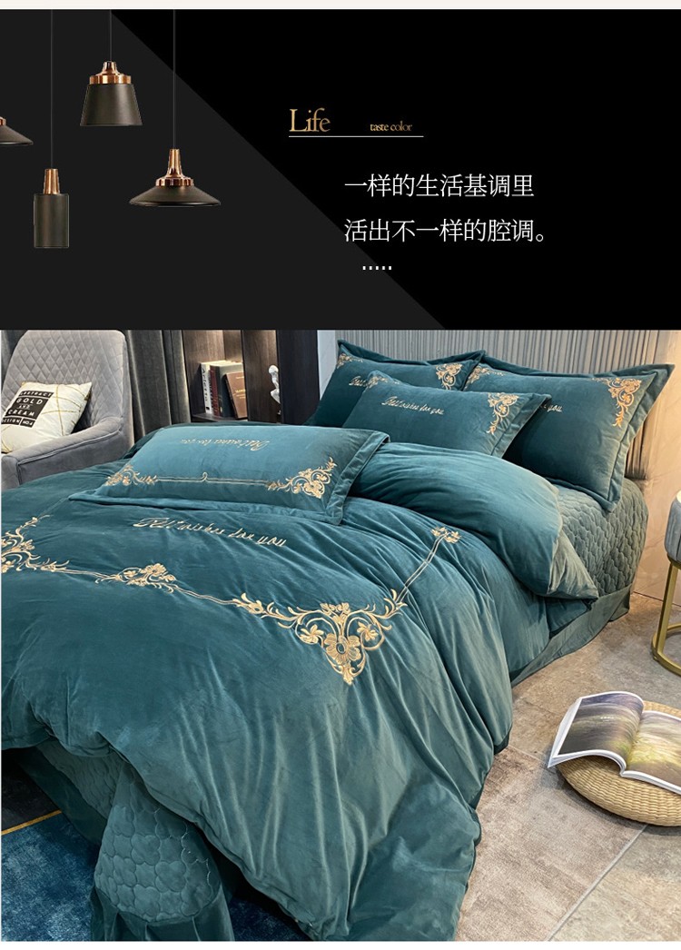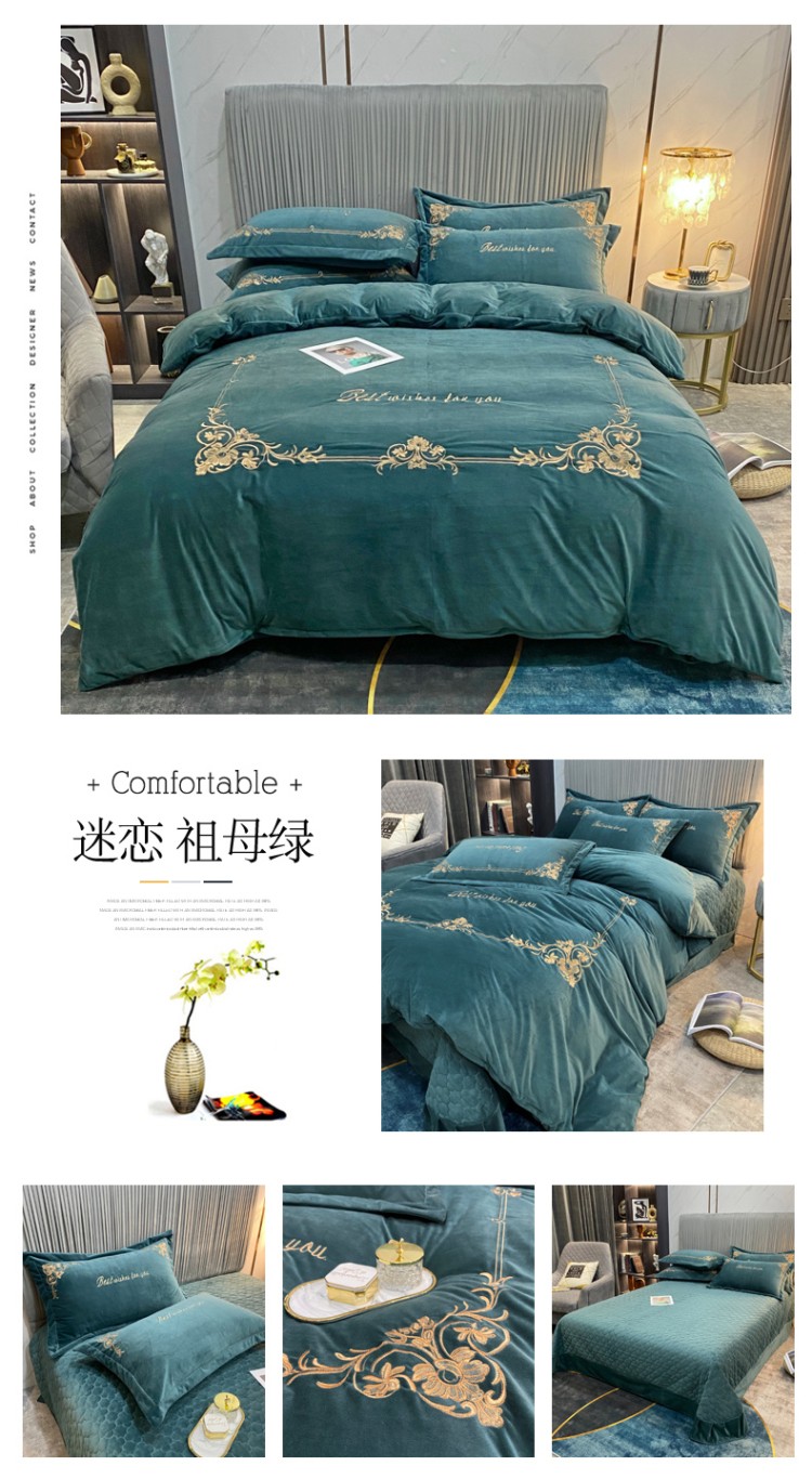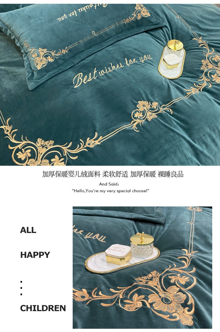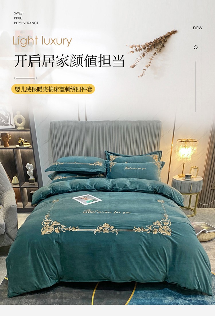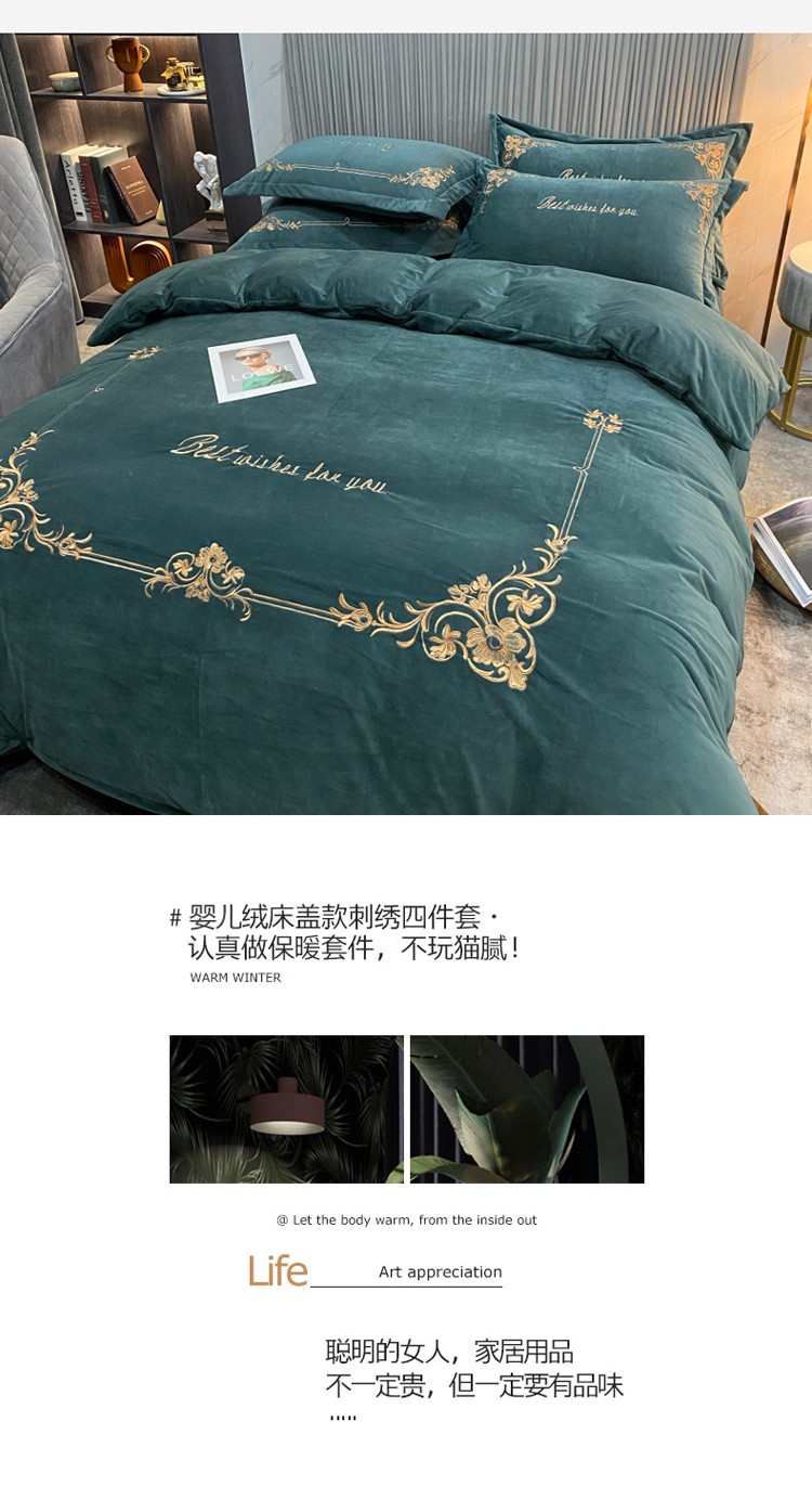 商品名称:星尚2021高品质婴儿绒夹棉床盖绣花四件套牛奶法莱绒 祖母绿