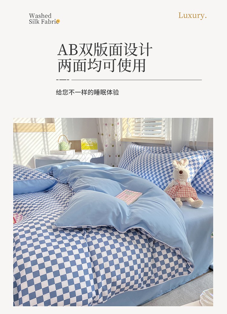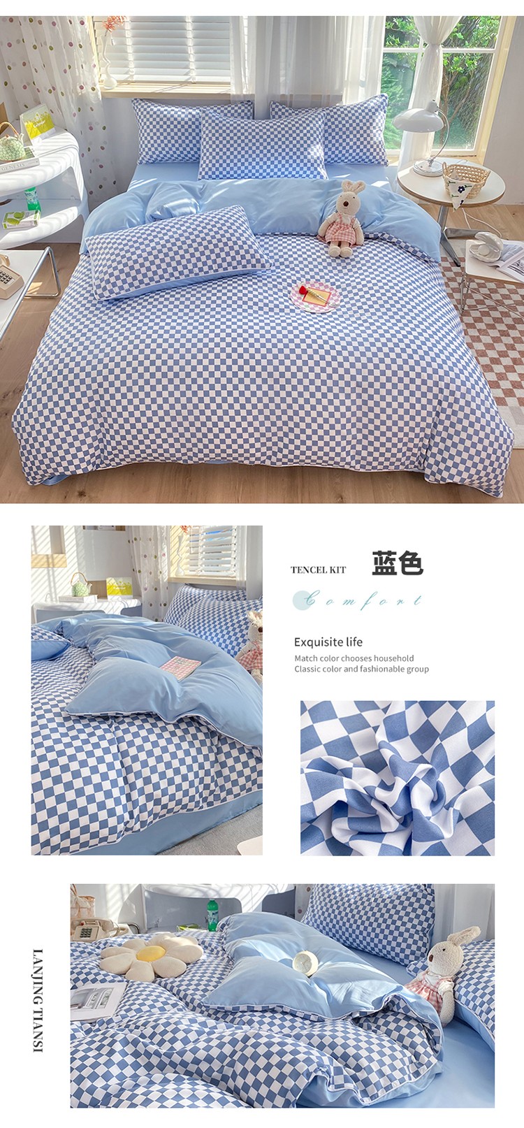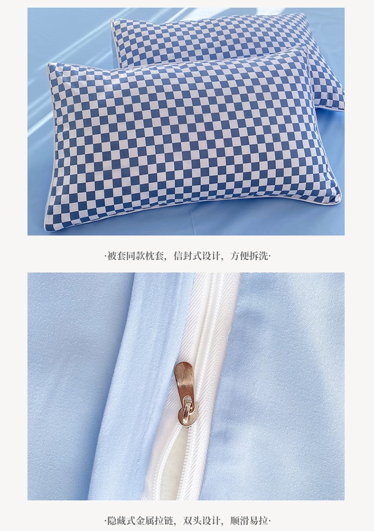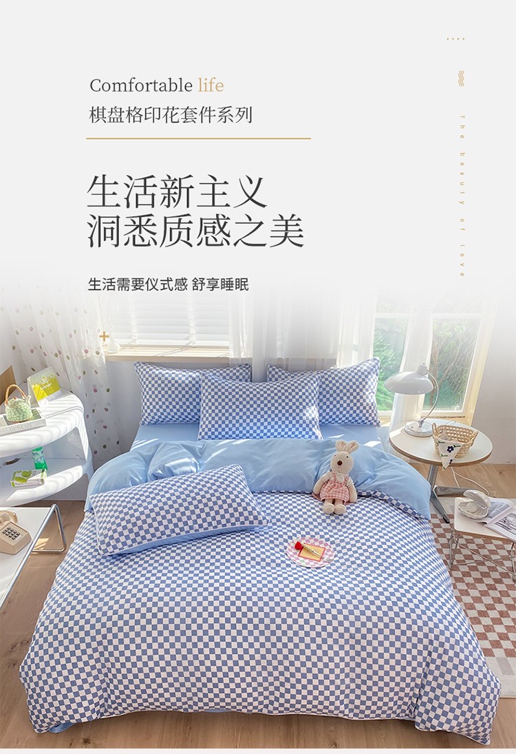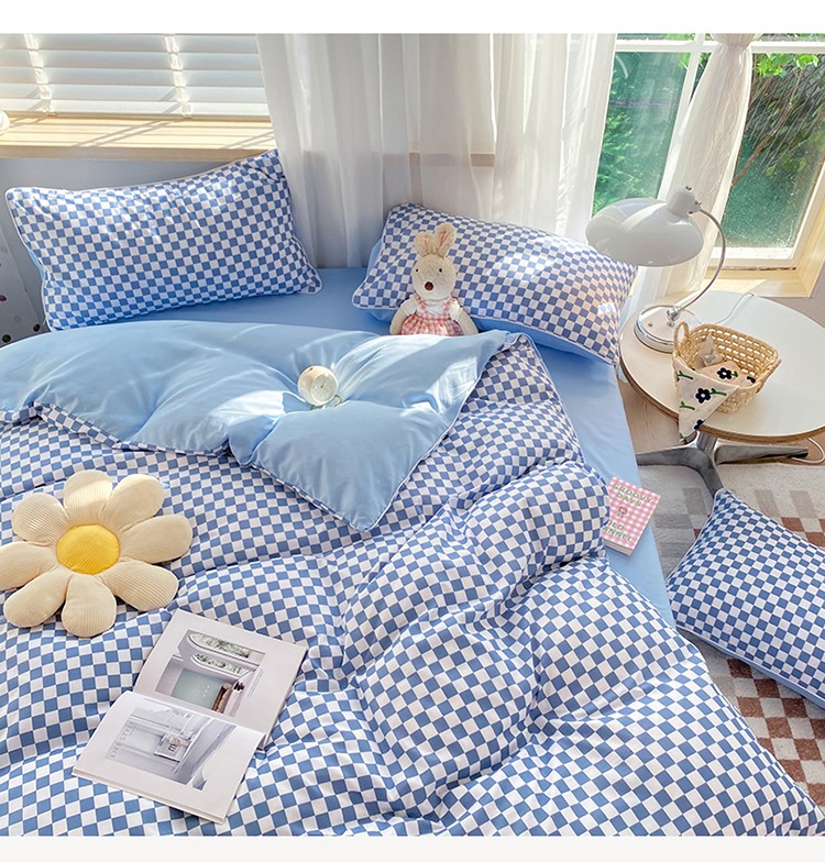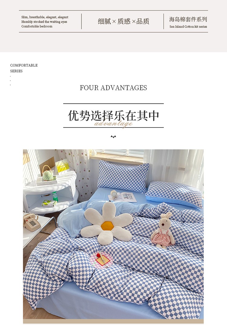 大米家居双面用小雏菊棋盘格雪纺花边海岛棉四件套 棋盘格-蓝色