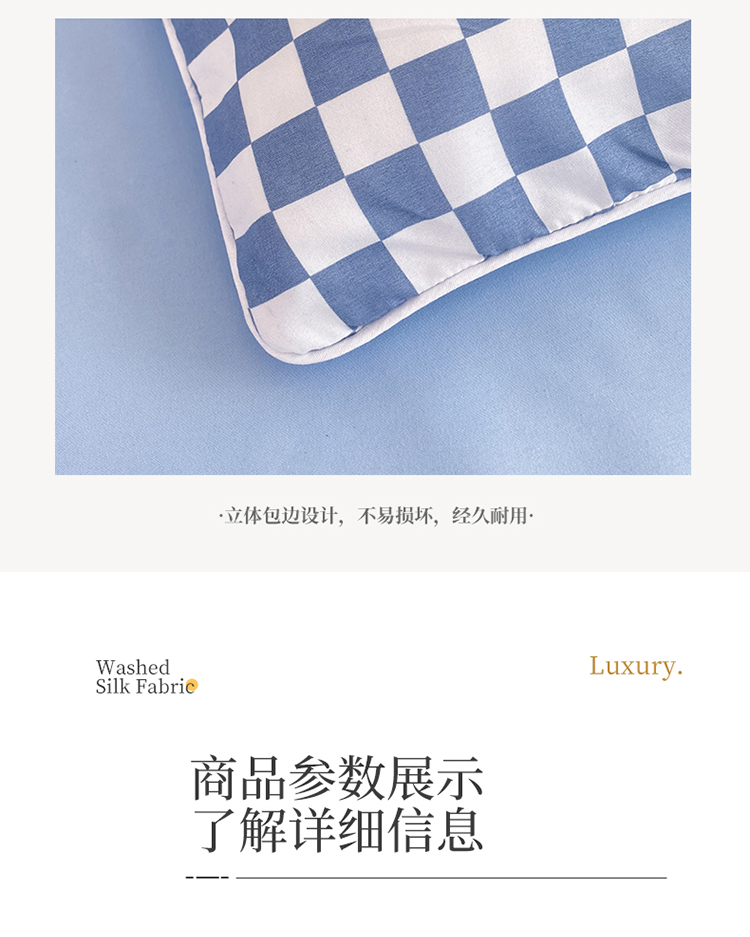 商品名称:大米家居双面用小雏菊棋盘格雪纺花边海岛棉四件套 棋盘格-蓝色