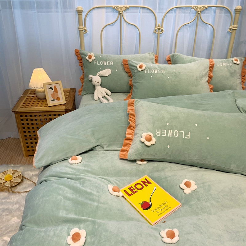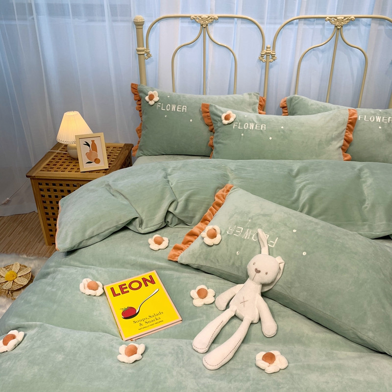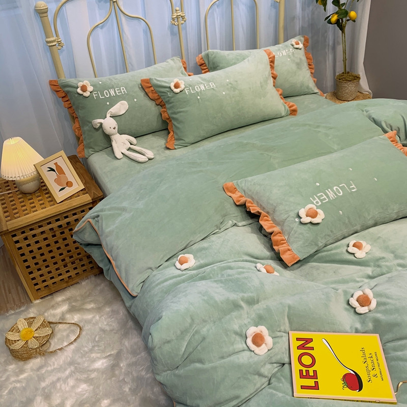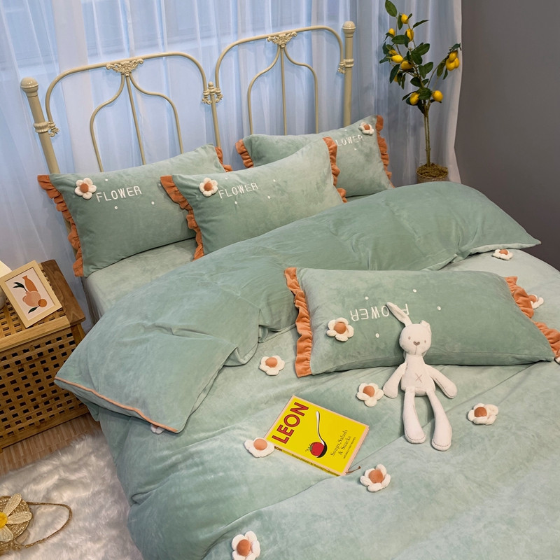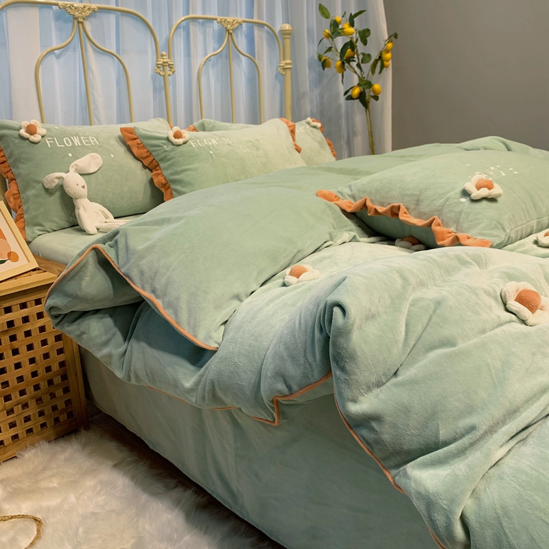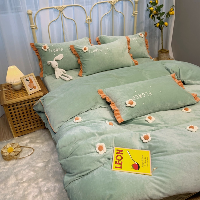 商品名称:馨蕊 2022新款秋冬轻奢煦暖绒那时花开系列四件套 那时花开-浅绿