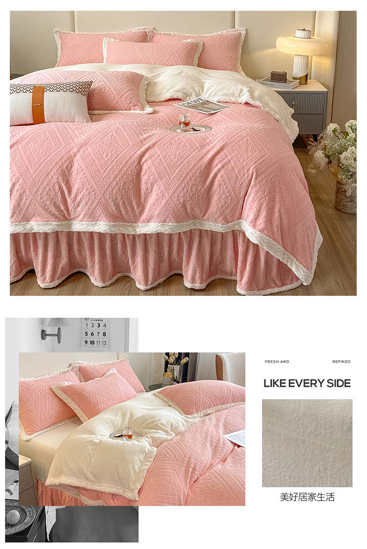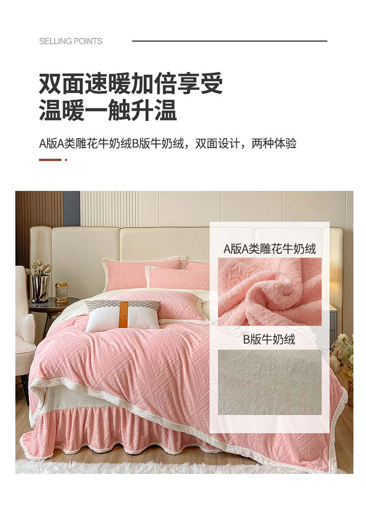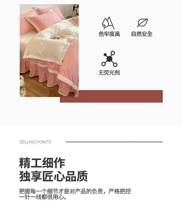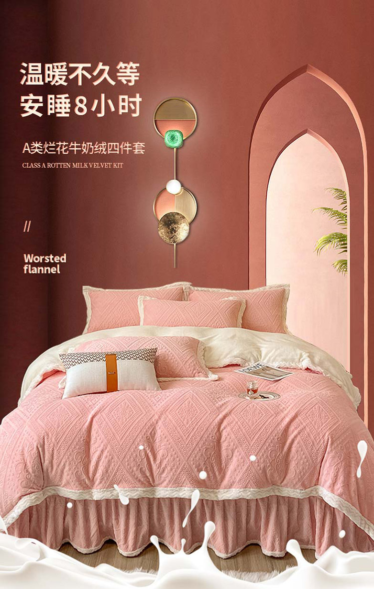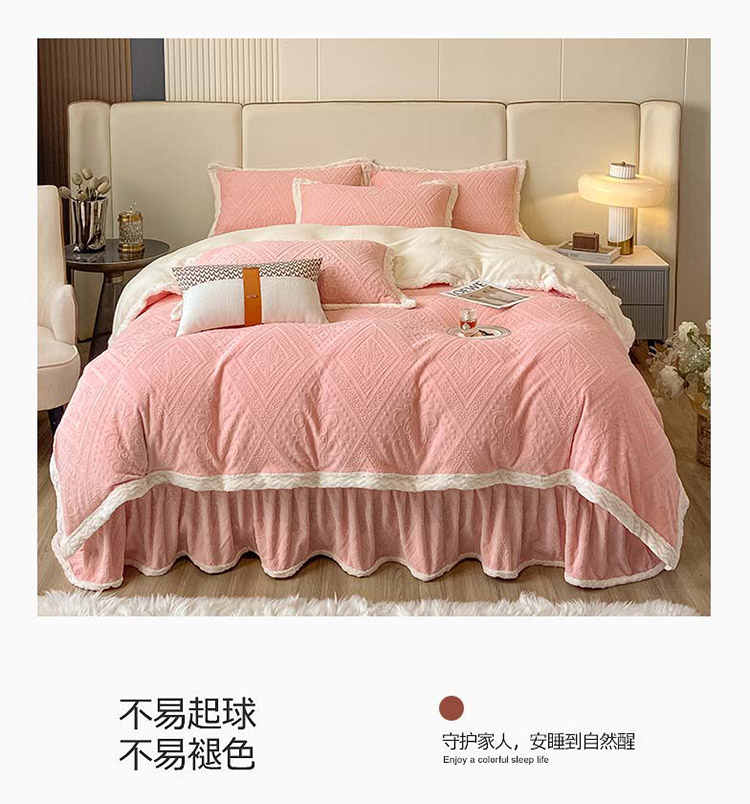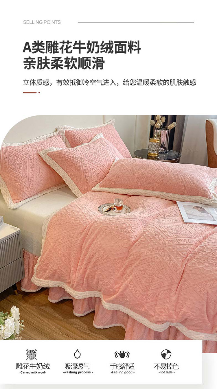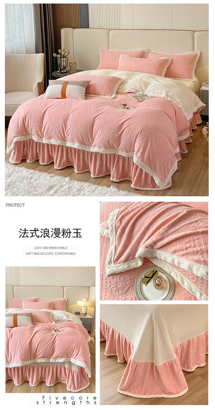 商品名称:铠畅 2022新款A类烂花牛奶绒床裙四件套 法式浪漫粉玉