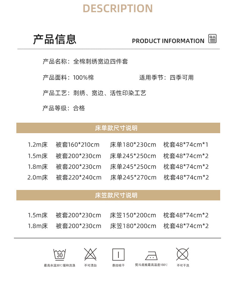 商品名称:梧桐家居 2023新款13372全棉刺绣宽边四件套-秀色系列 香槟金