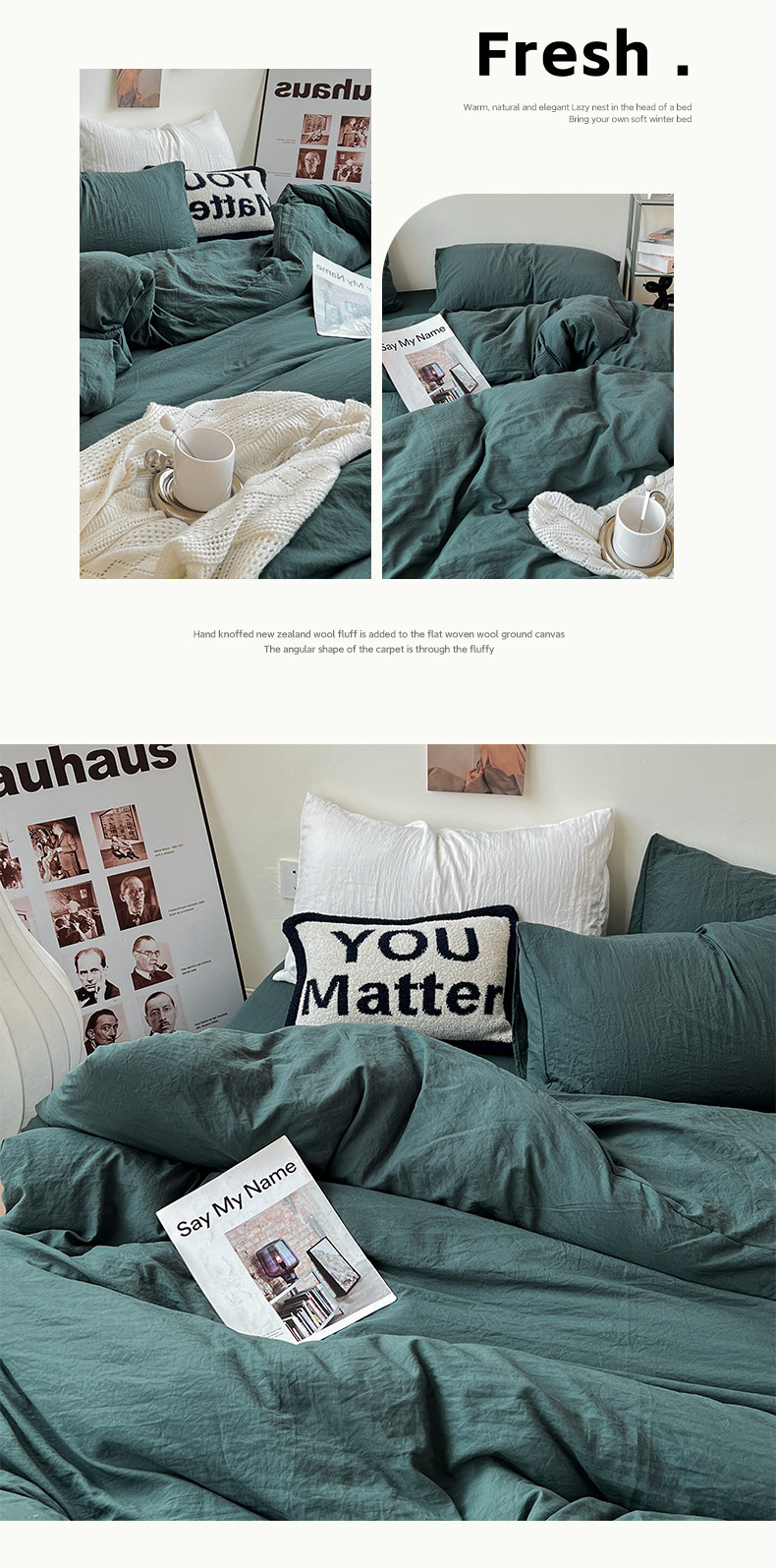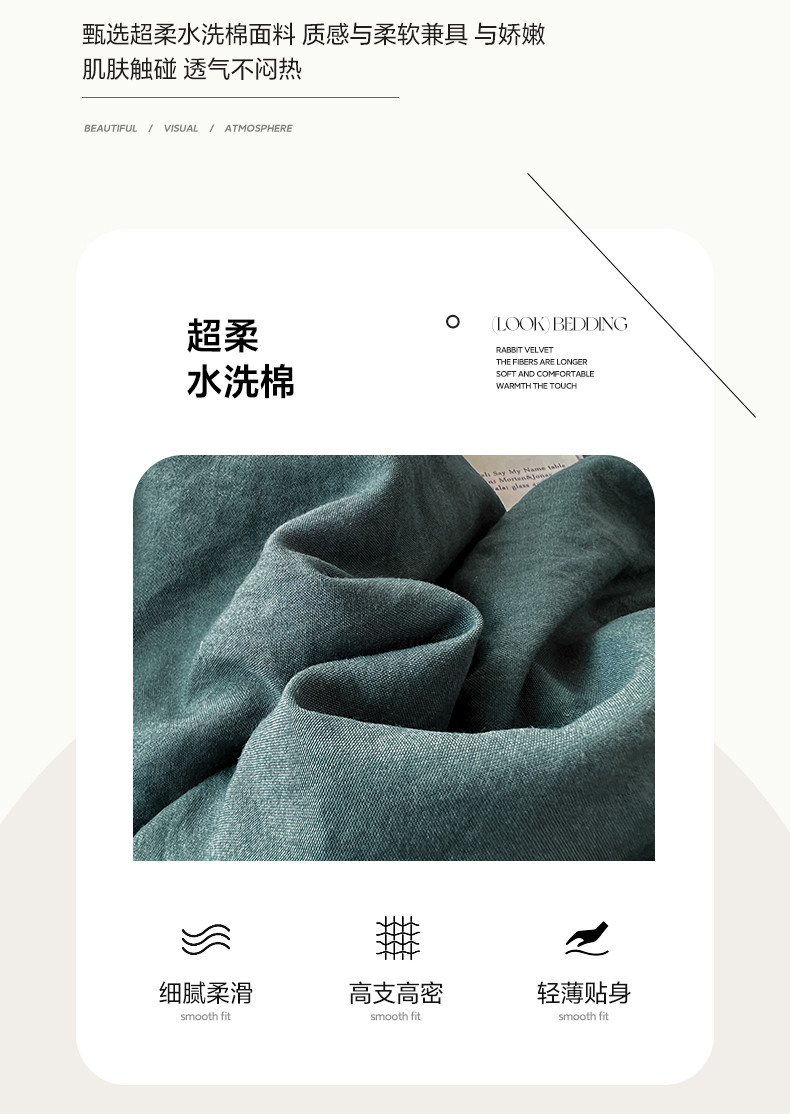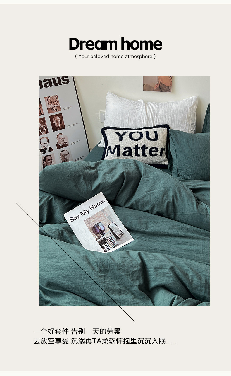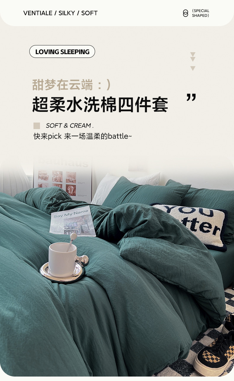 (总)水墨江南 2025新款亲肤磨毛水洗棉纯色四件套,翡绿,暗夜绿,碧蓝,橄榄绿,墨灰,浅灰深灰,雅白,藻绿米黄,中驼