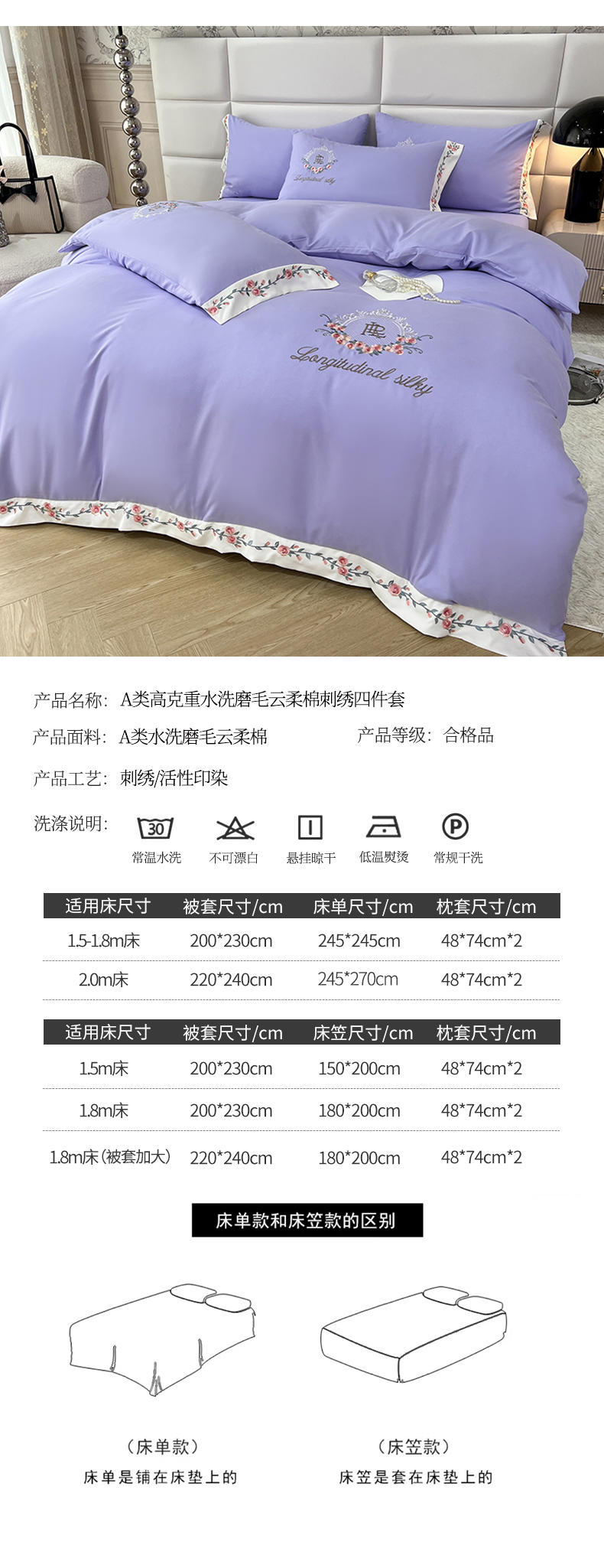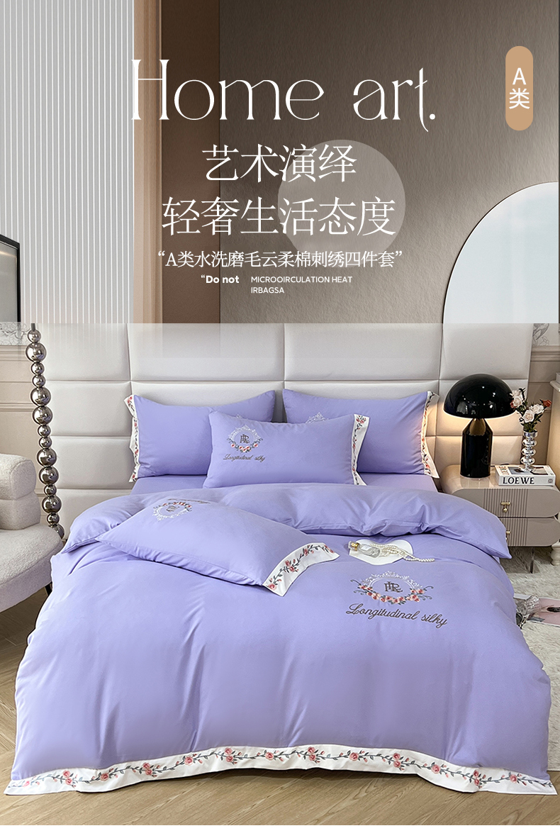商品名称:易辰美 2024新款A类高克重水洗磨毛云柔棉刺绣四件套 彐青色