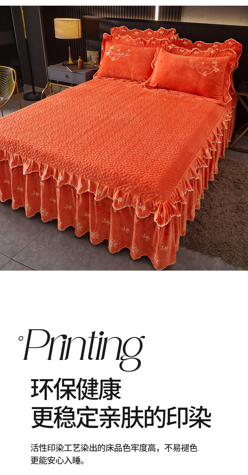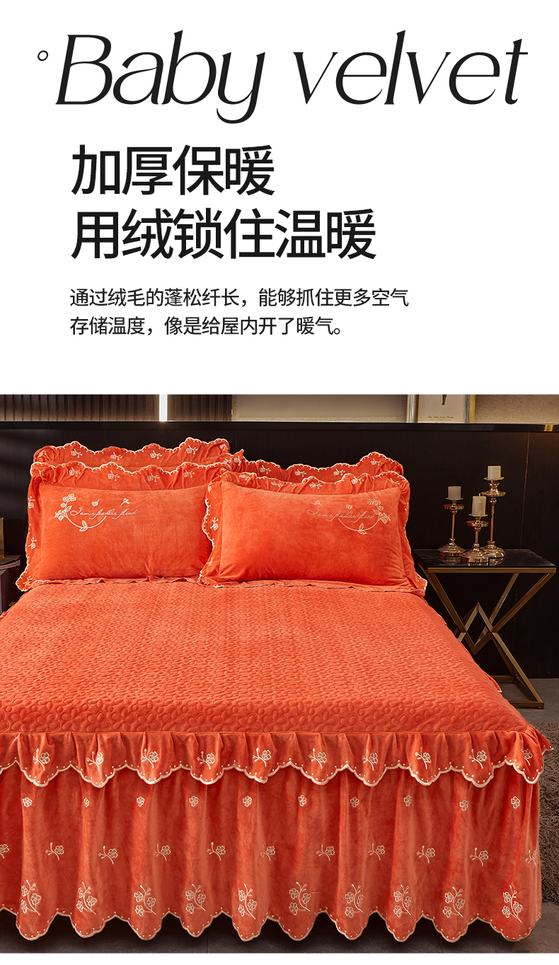 (总)恒爱 2022秋冬水晶绒翩翩花舞夹棉单床裙,大红色,豆沙红,橄榄绿,公主粉,桔色,咖啡色,孔雀绿,拉菲红,罗兰紫,玫红色,美人玉,米白色,米驼色,抹茶绿,浅灰色,紫色