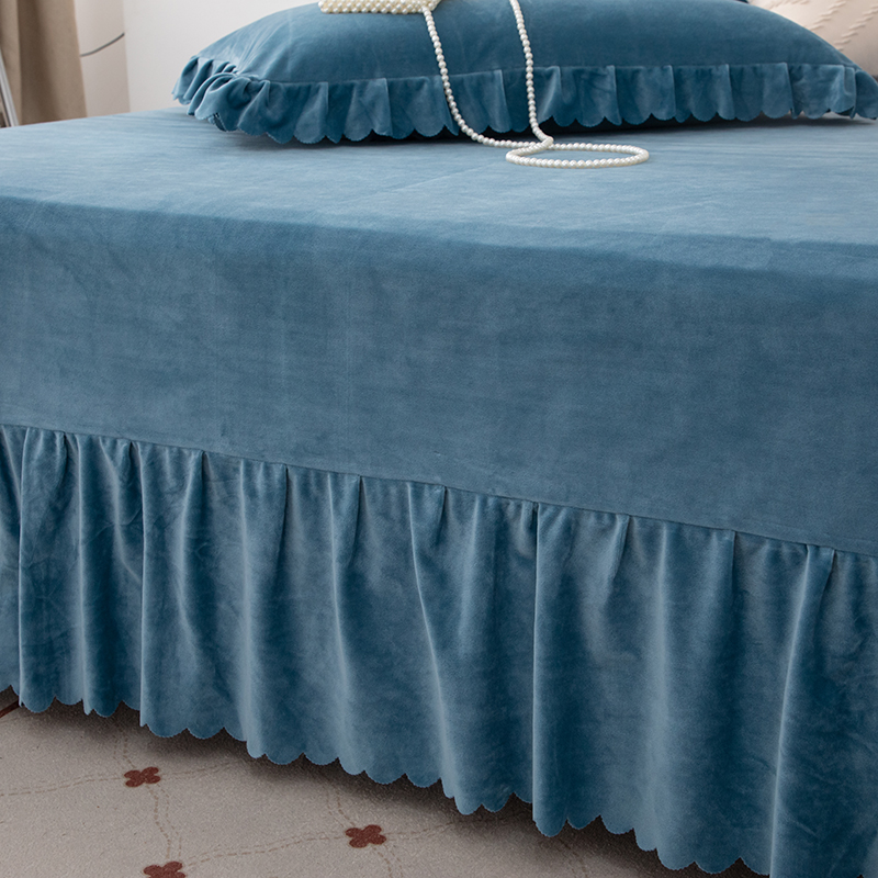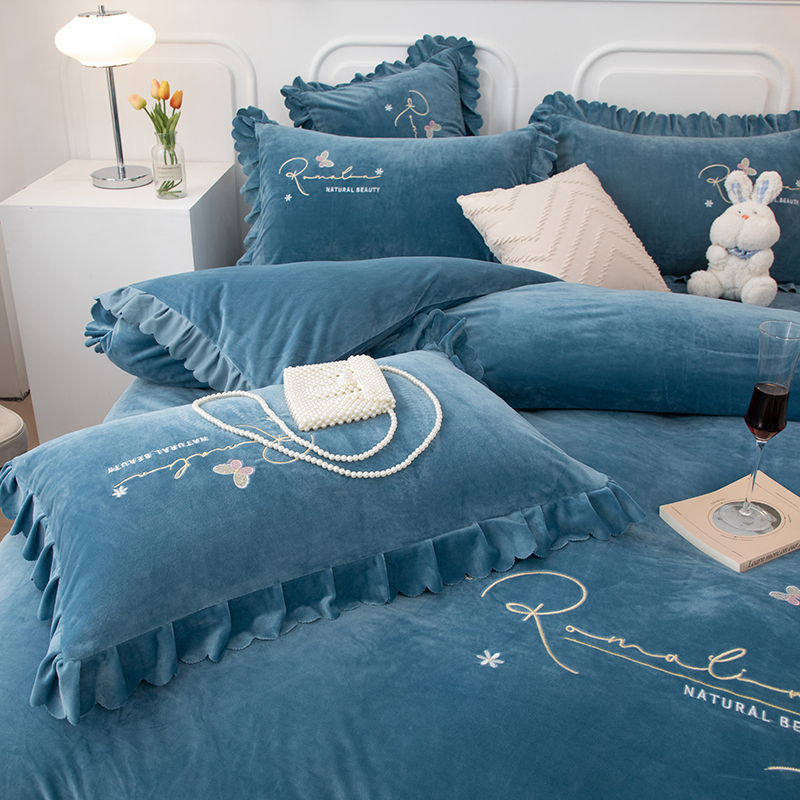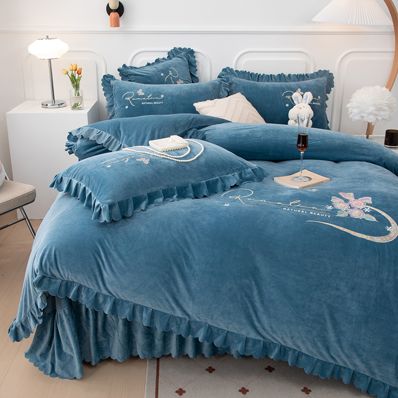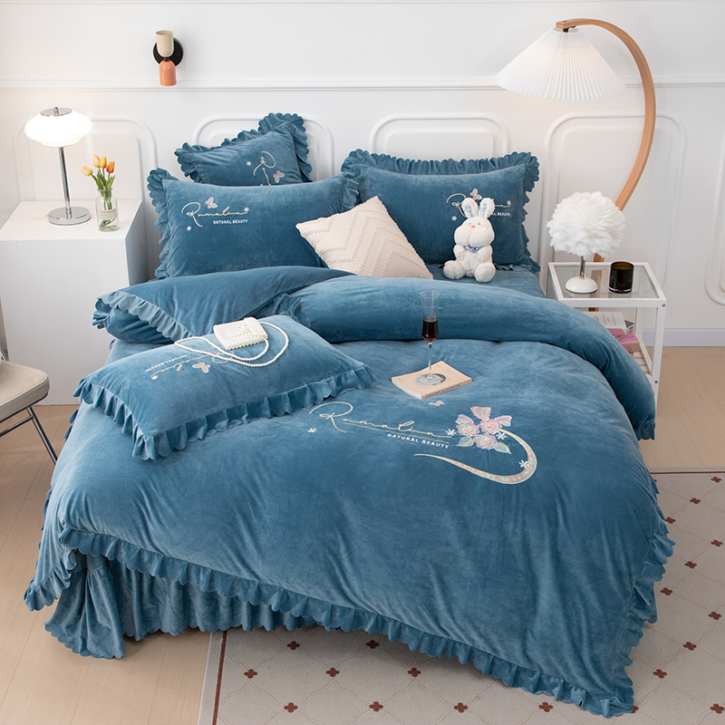 床品套件 > 优姿家纺 2024新品8.5斤德芙绒韩版床裙绣花保暖四件套 时尚玫瑰宝石兰