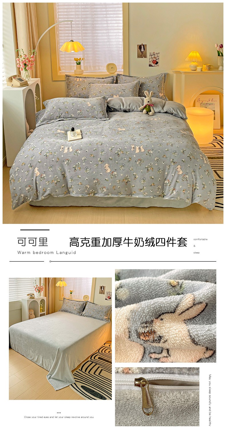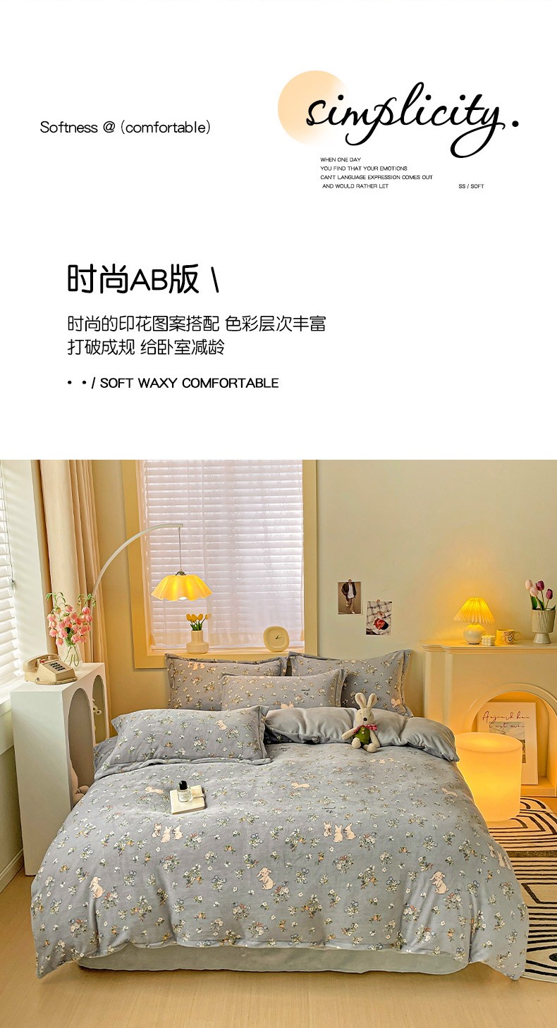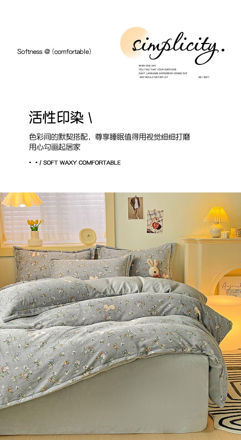 当前位置: 91家纺网 > 商品网购 > 床品套件 > 四件套 > 牛奶绒四件套 > 畅畅家纺 2023新款活性印花小清新AB版加厚高克重法莱绒牛奶绒四件套 可可里