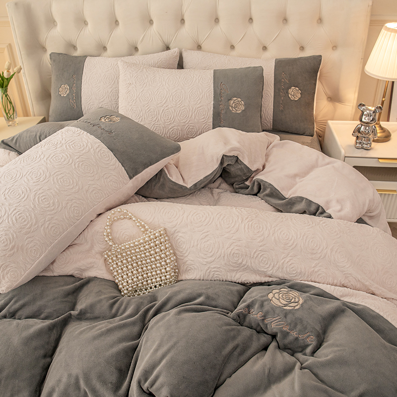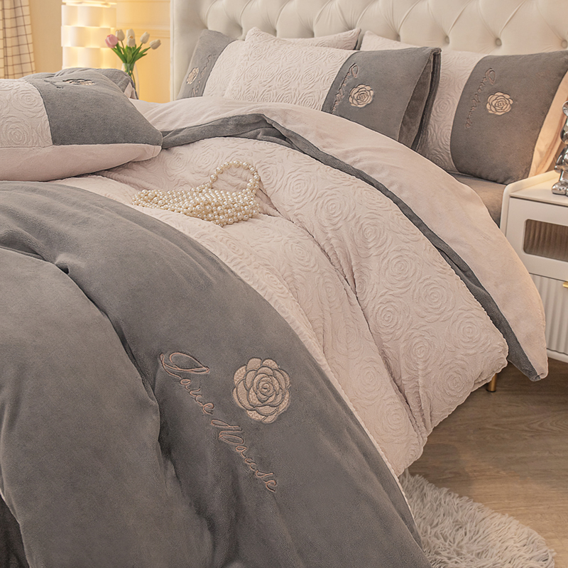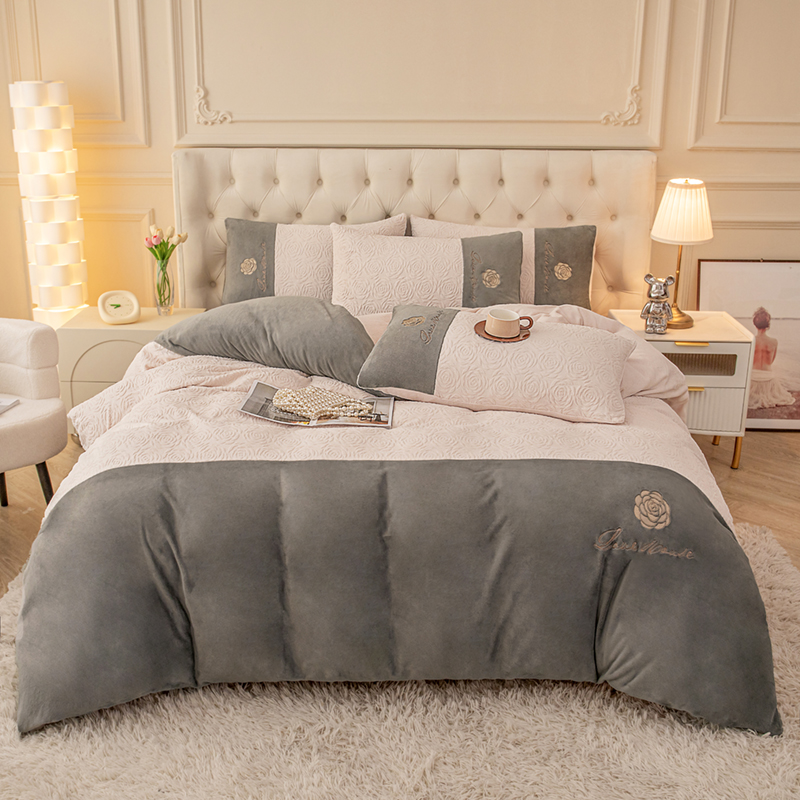 好阁 2023新款法式刺绣小香风雕花双拼牛奶绒四件套 灰色+流沙灰