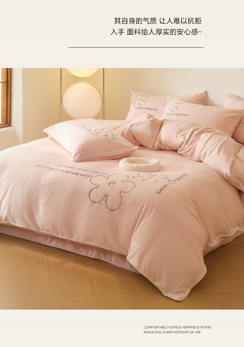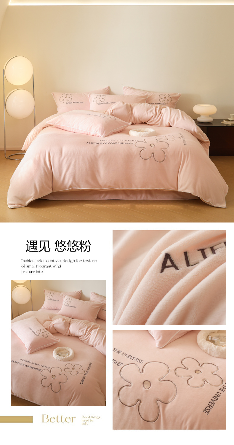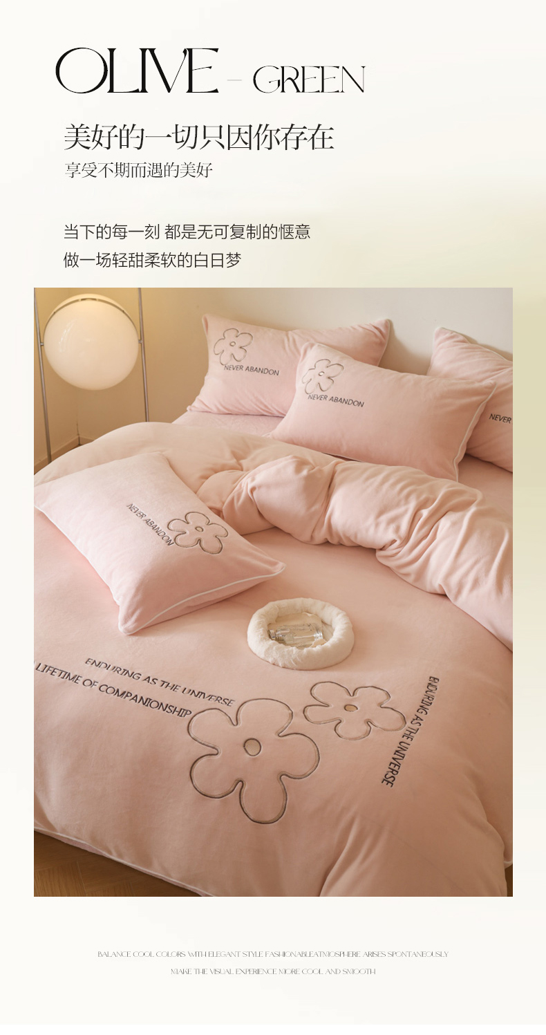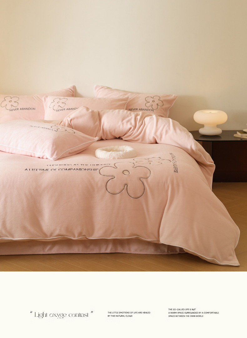 万盛家纺 2025新款牛奶绒简约绣花四件套 悠悠粉