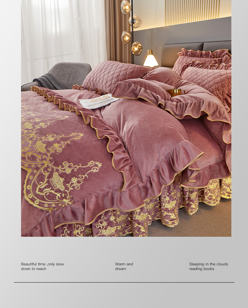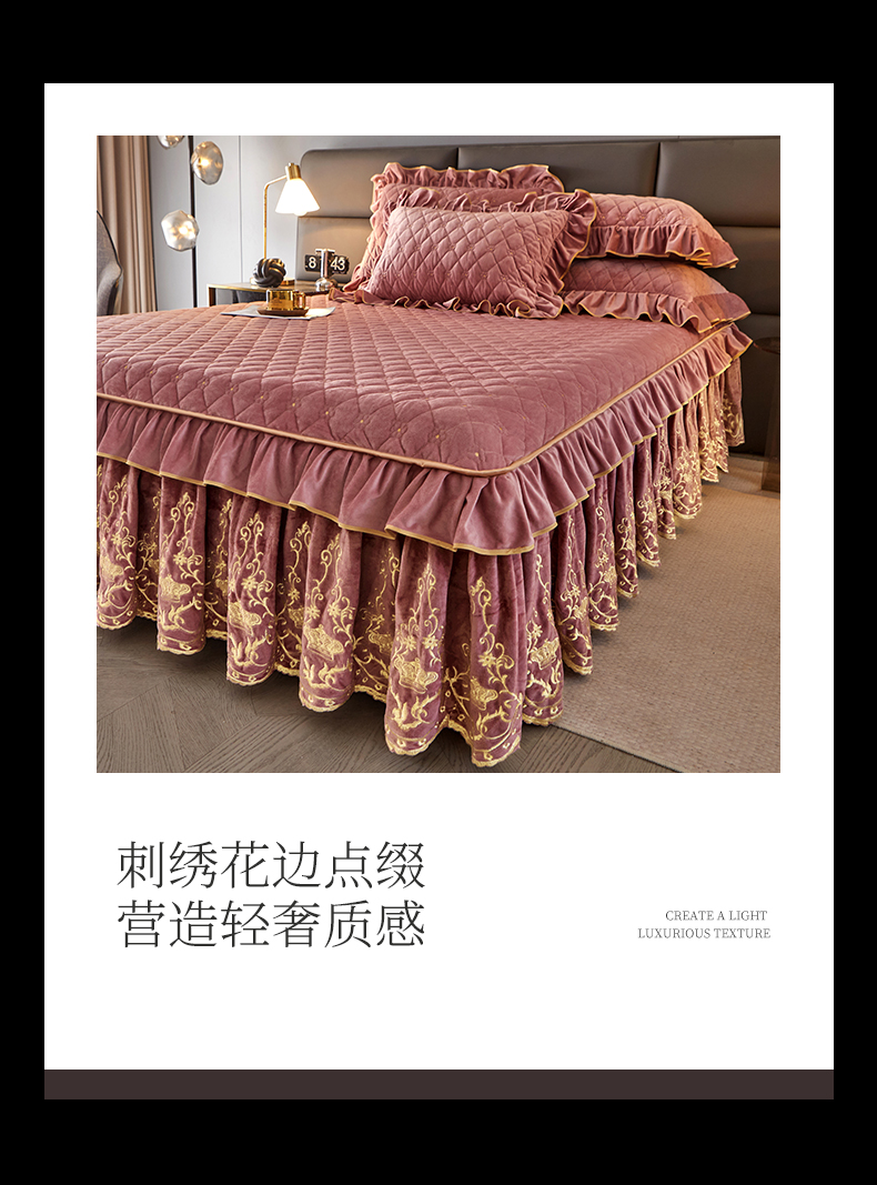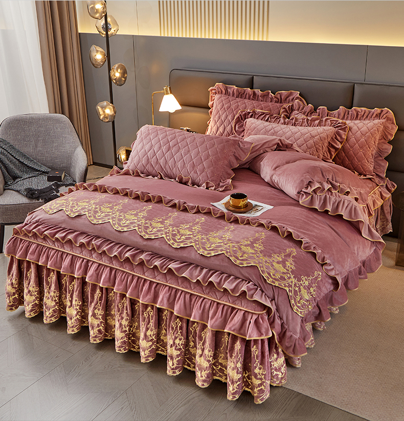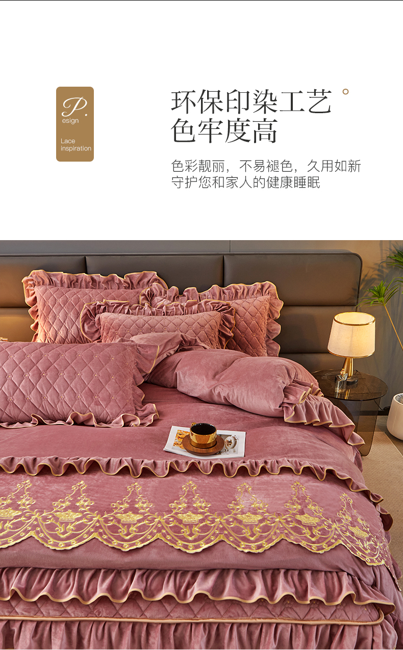 当前位置: 91家纺网 > 商品网购 > 床品套件 > 四件套 > 宝宝绒四件套 > 罗艺轩 2024新款欧洲风情宝宝绒可拆卸夹棉床裙四件套 豆沙粉