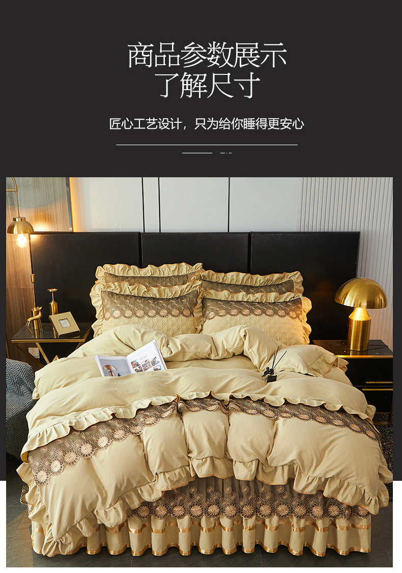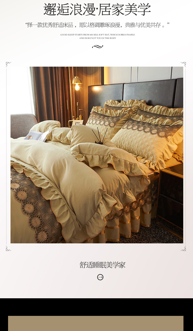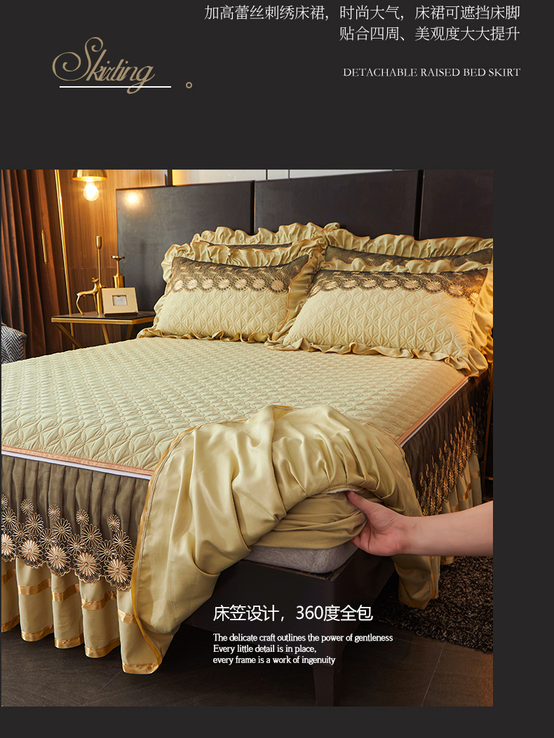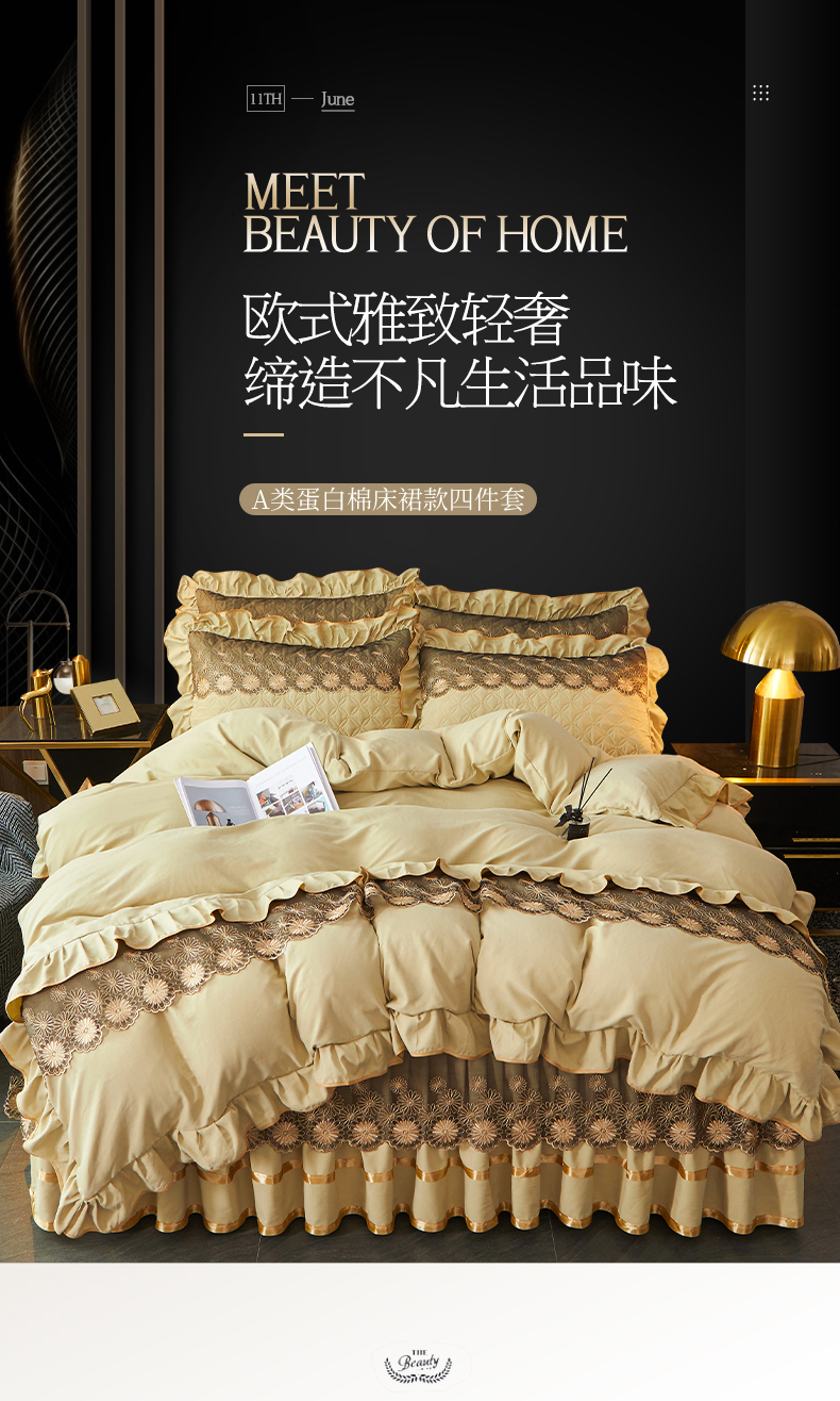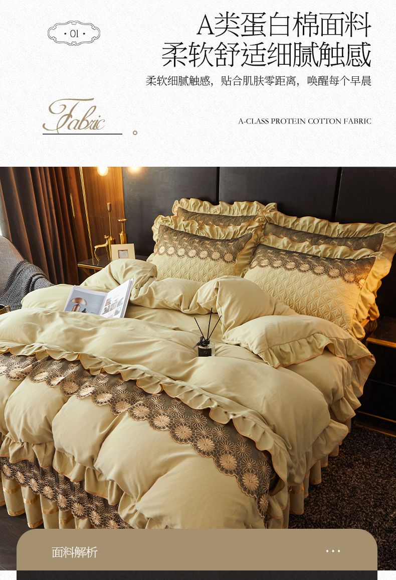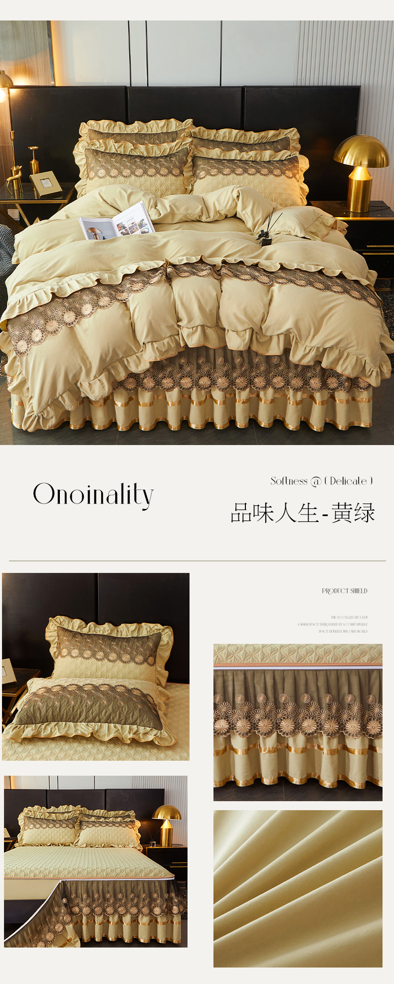 当前位置: 91家纺网 > 商品网购 > 床品套件 > 四件套 > 化纤普通四件套 > 罗艺轩 2024新款A类蛋白棉夹棉床裙四件套-品味人生 品味人生-黄绿