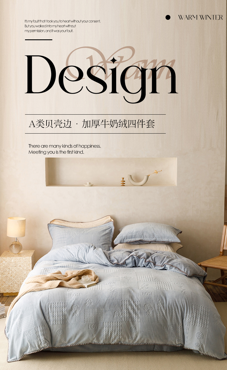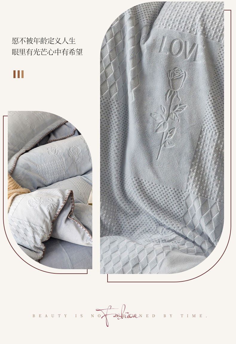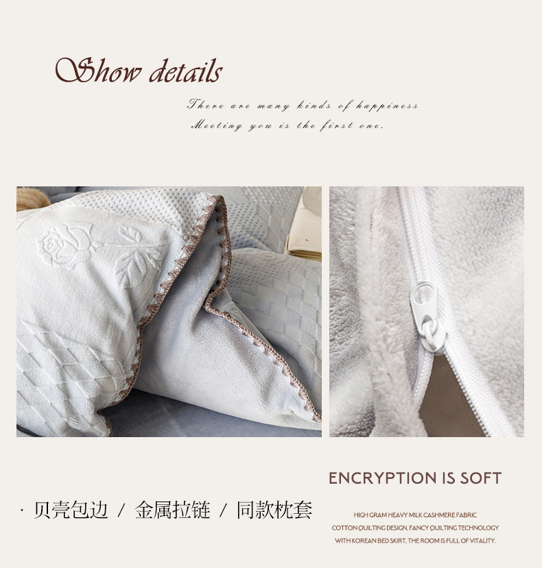 艾莱 2023新款贝壳边加厚牛奶绒四件套-玫瑰爱人 玫瑰爱人-蓝灰