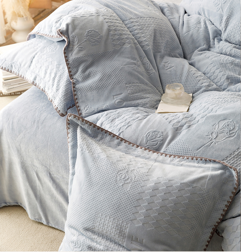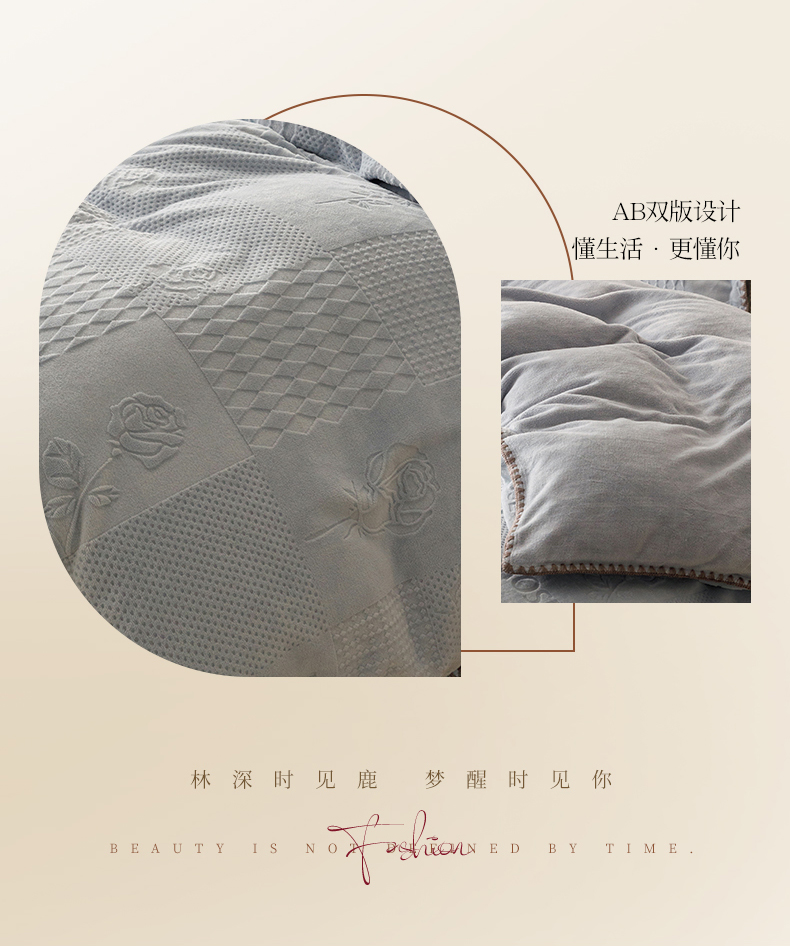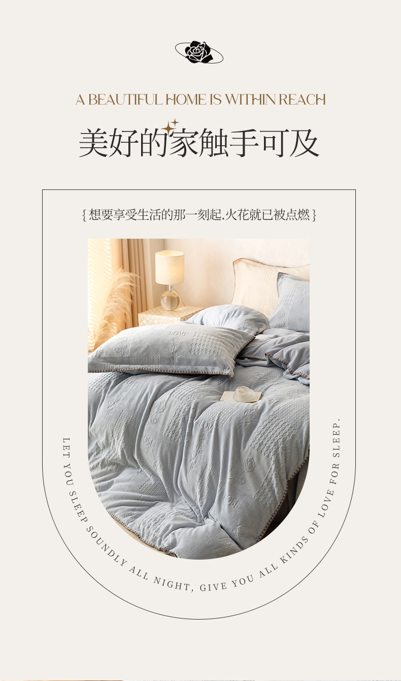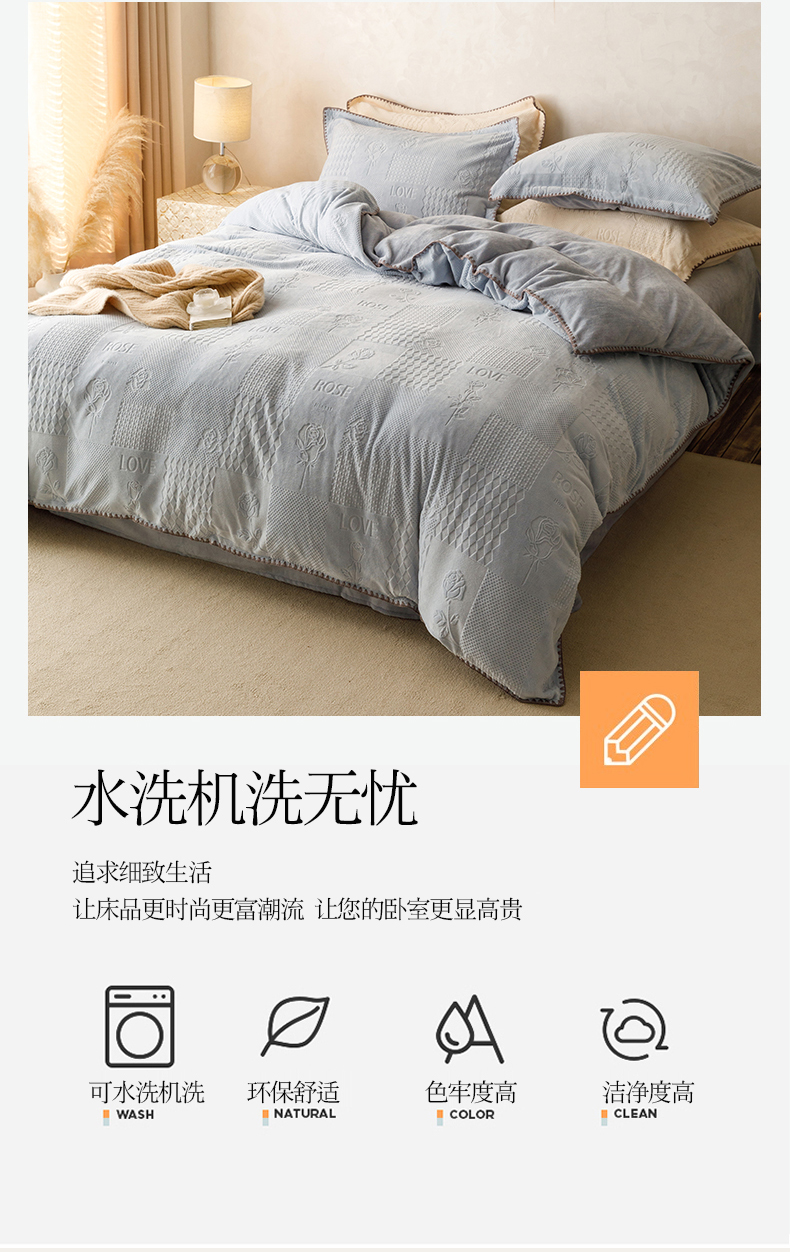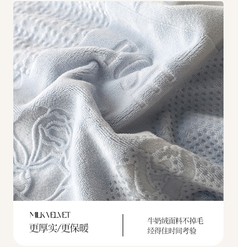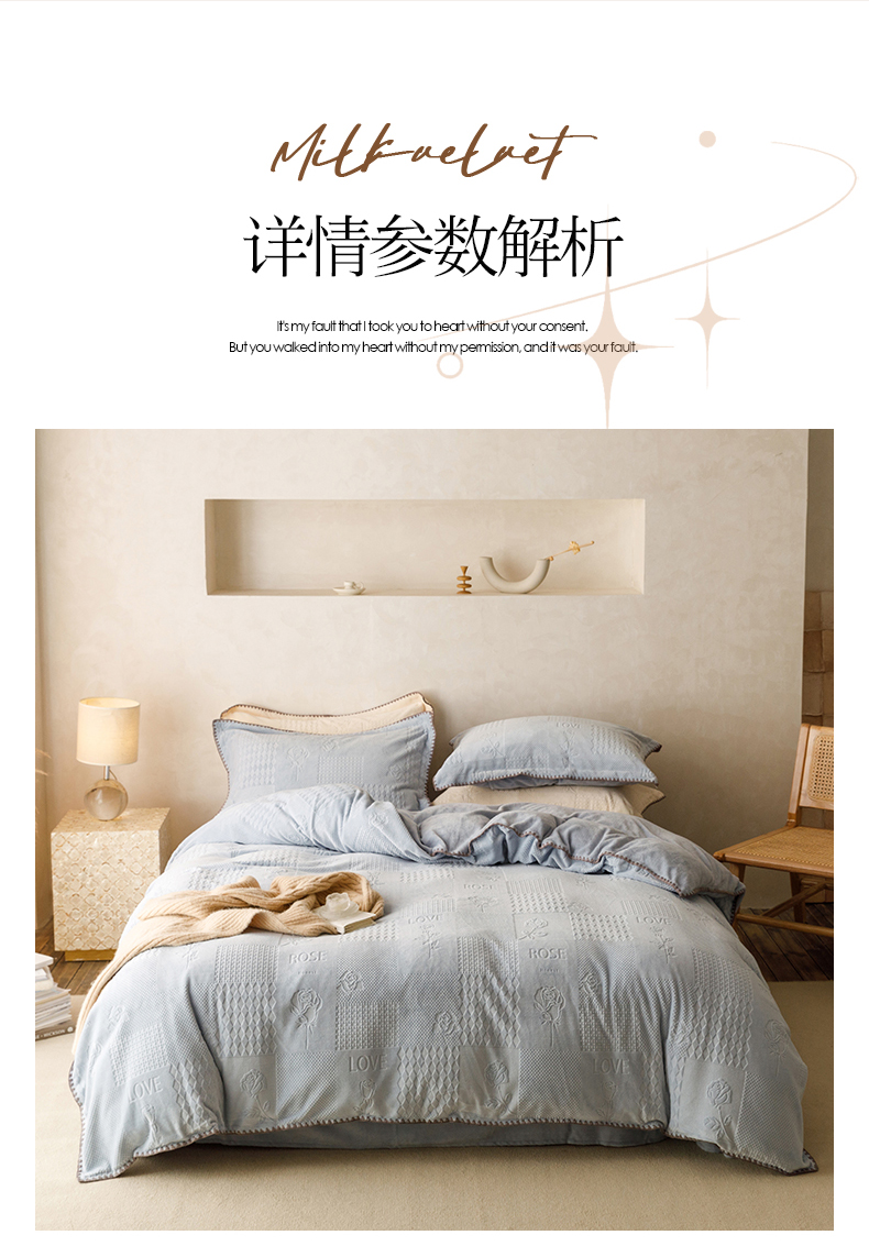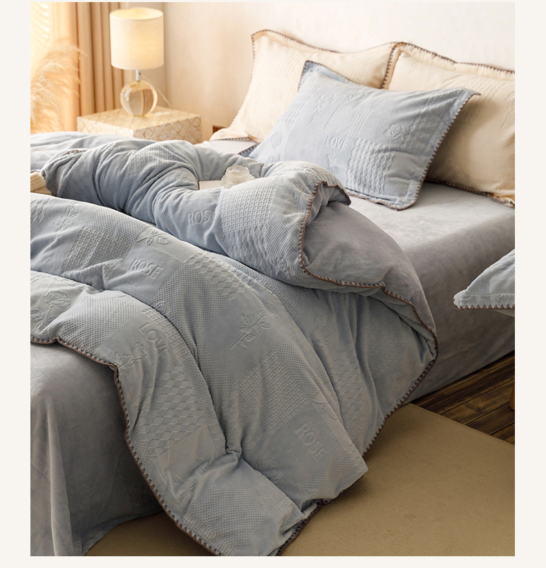 商品名称: 艾莱 2023新款贝壳边加厚牛奶绒四件套-玫瑰爱人 玫瑰爱人-蓝灰