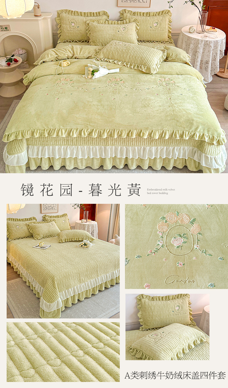 商品名称:宜凡家纺 2023新款高克重牛奶绒绣花夹棉床盖四件套 镜花园-暮光黄