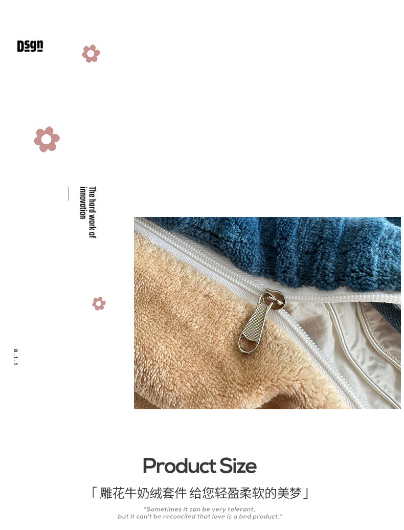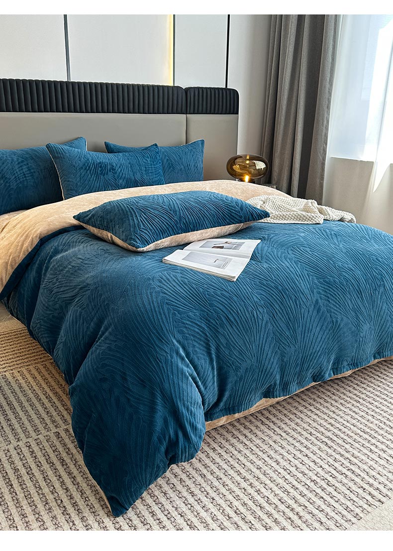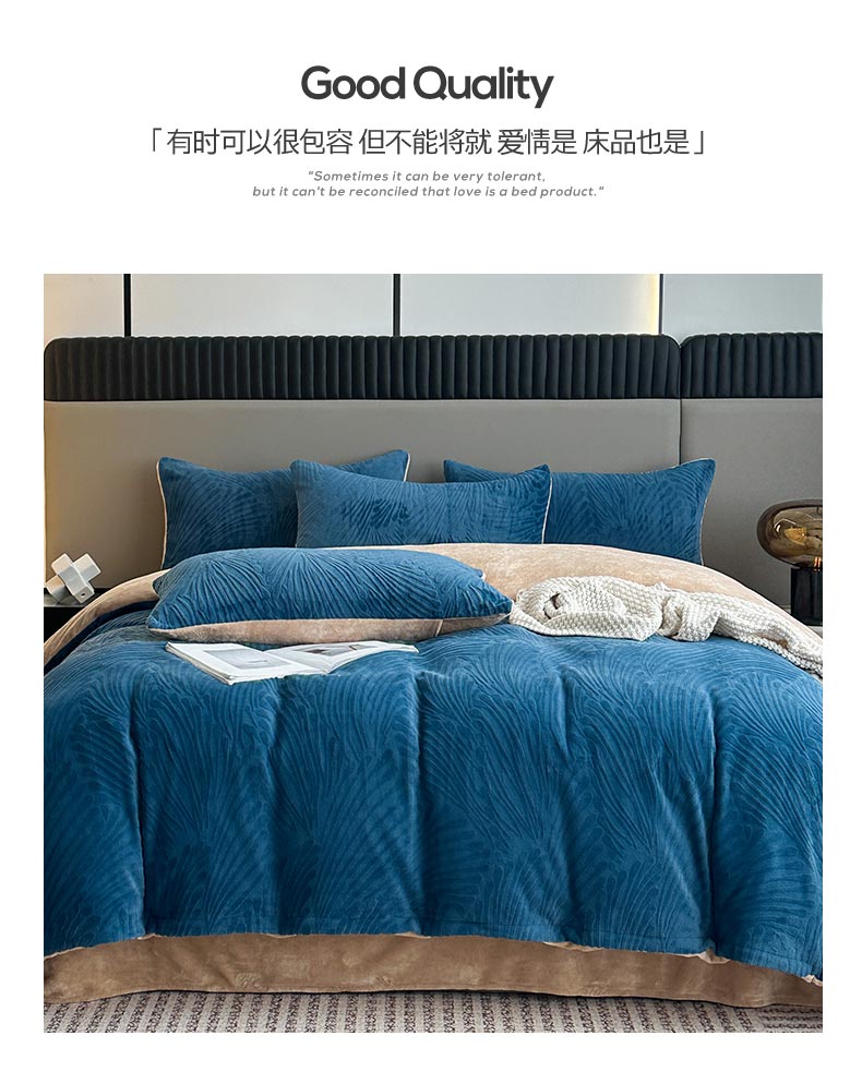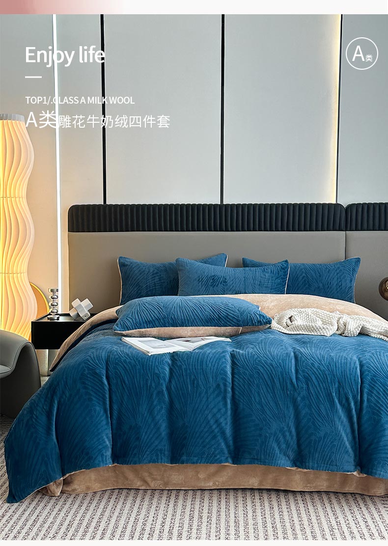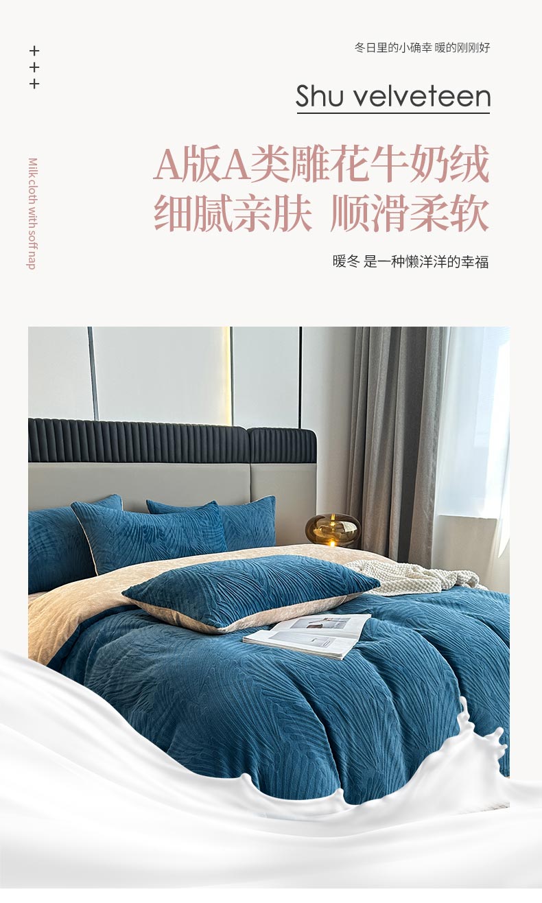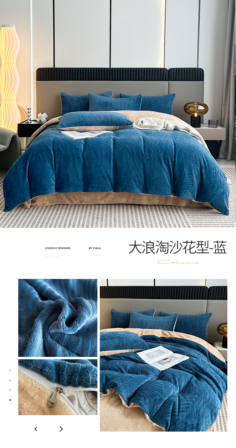 铠畅家纺 2023爆款A类230g立体雕花牛奶绒四件套 大浪淘沙花型-蓝
