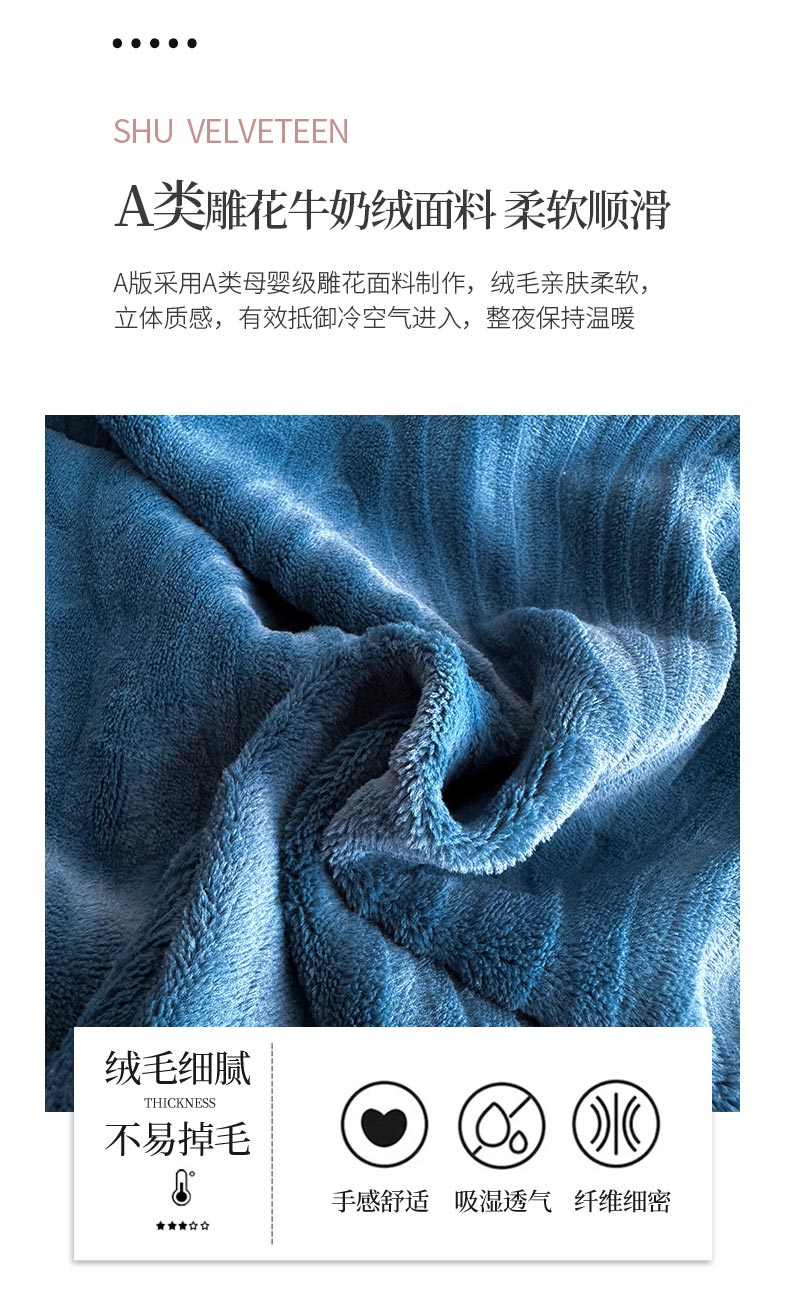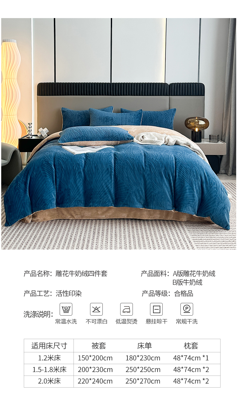 商品名称:铠畅家纺 2023爆款A类230g立体雕花牛奶绒四件套 大浪淘沙花型-蓝