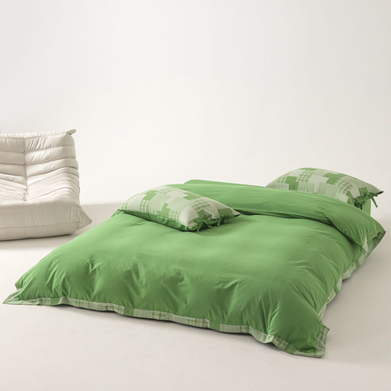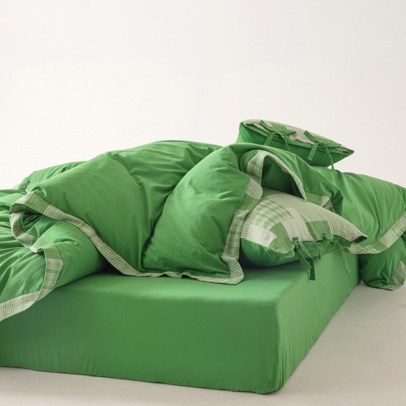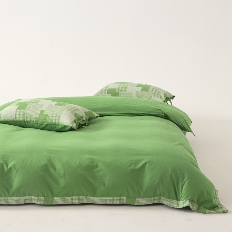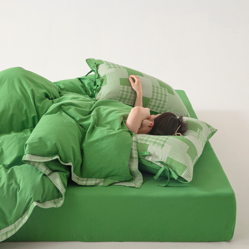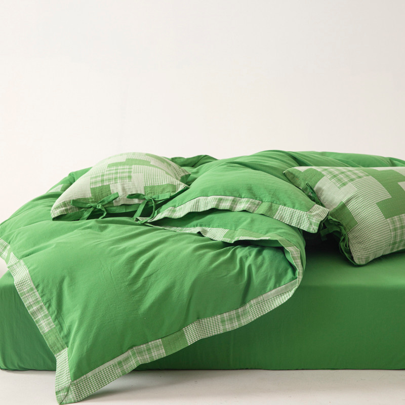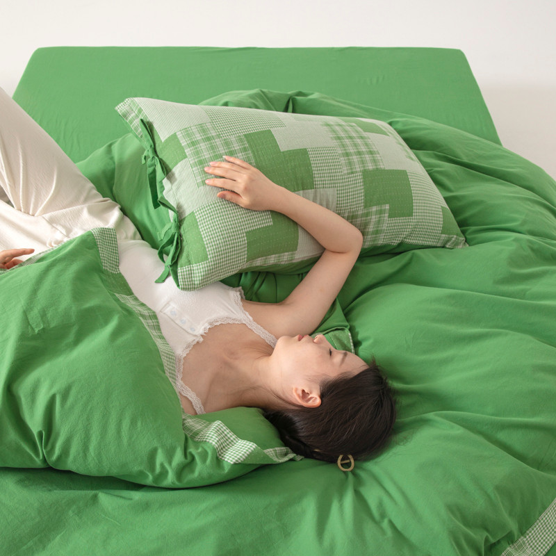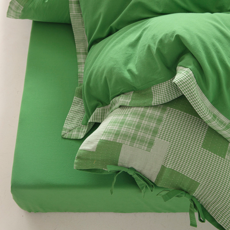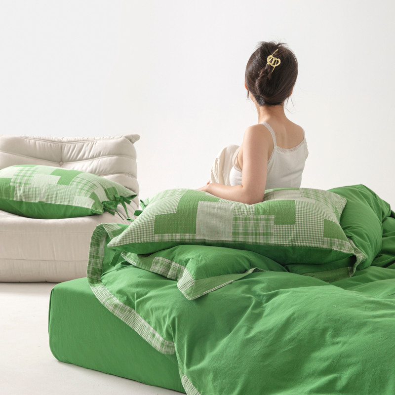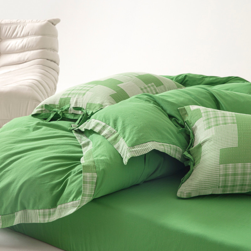 • 91家纺网 家纺一手货源 找家纺 安莱生活 2023新款简约拼布田园拼边四件套 嫩绿