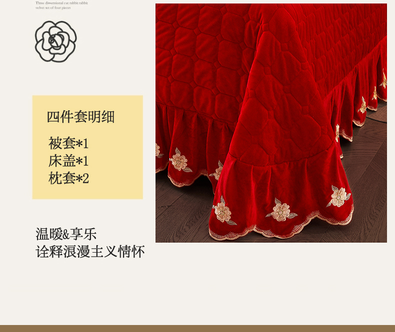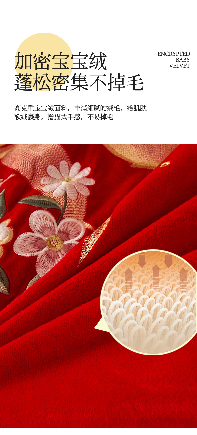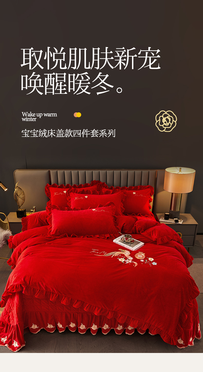 当前位置: 91家纺网 > 商品网购 > 床品套件 > 四件套 > 宝宝绒四件套 > 恒爱家纺 2023新款温暖舒适加密宝宝绒床盖四件套-邂逅系列 大红