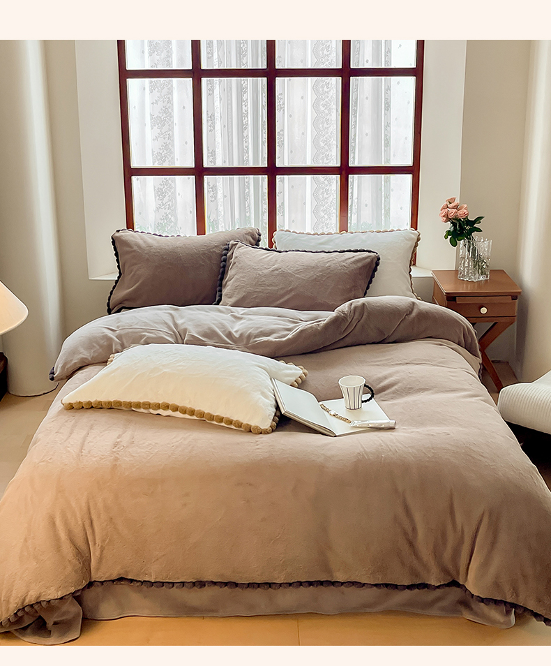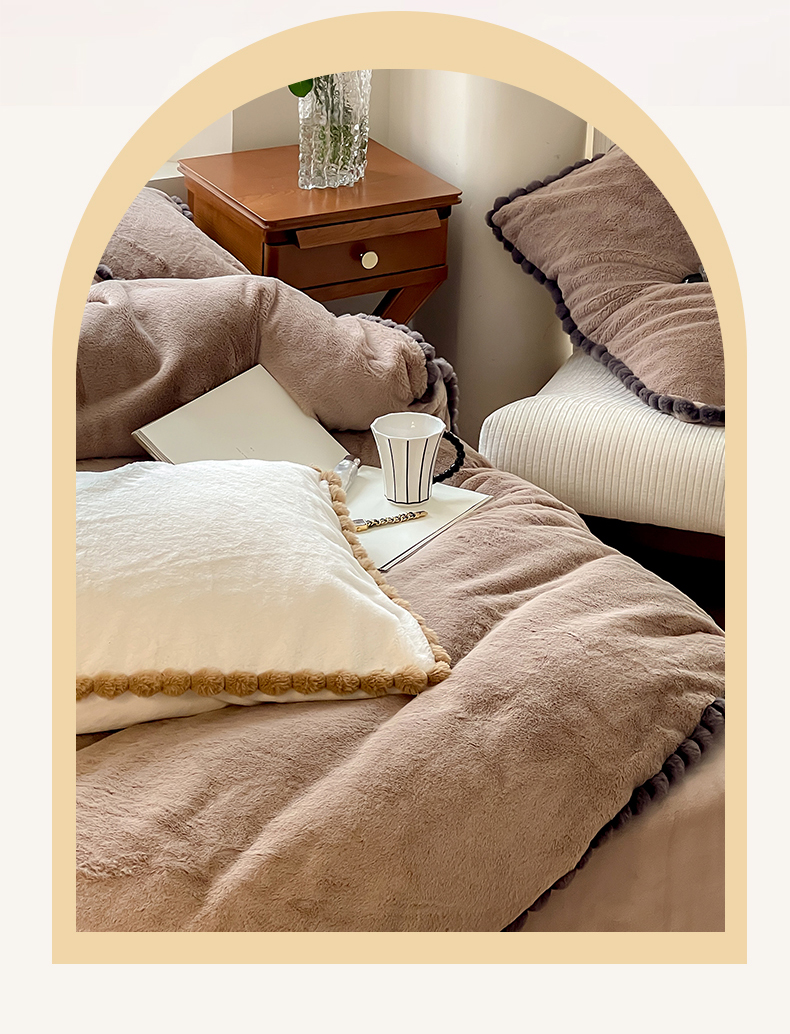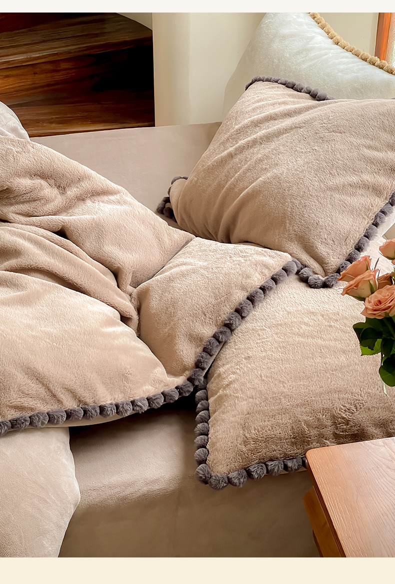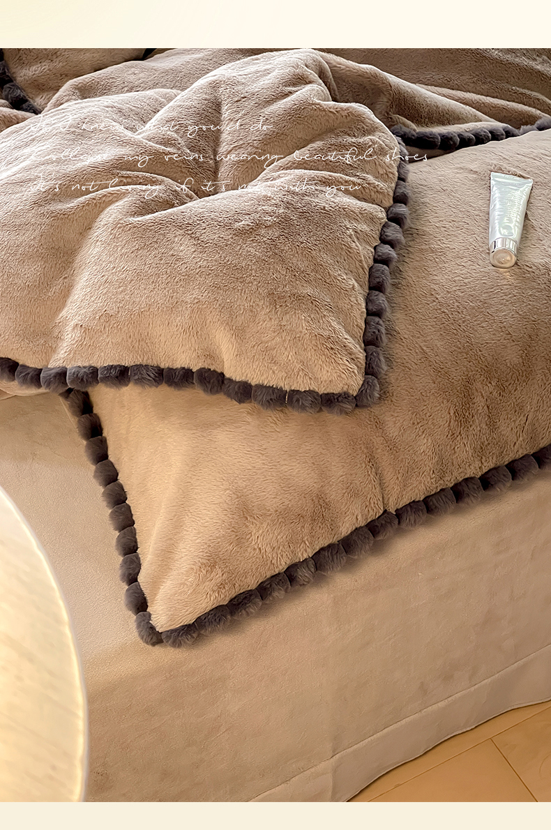 名品优仓 2023新款高克重兔绒边带球球款四件套 摩卡咖