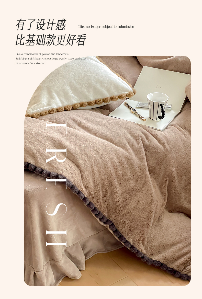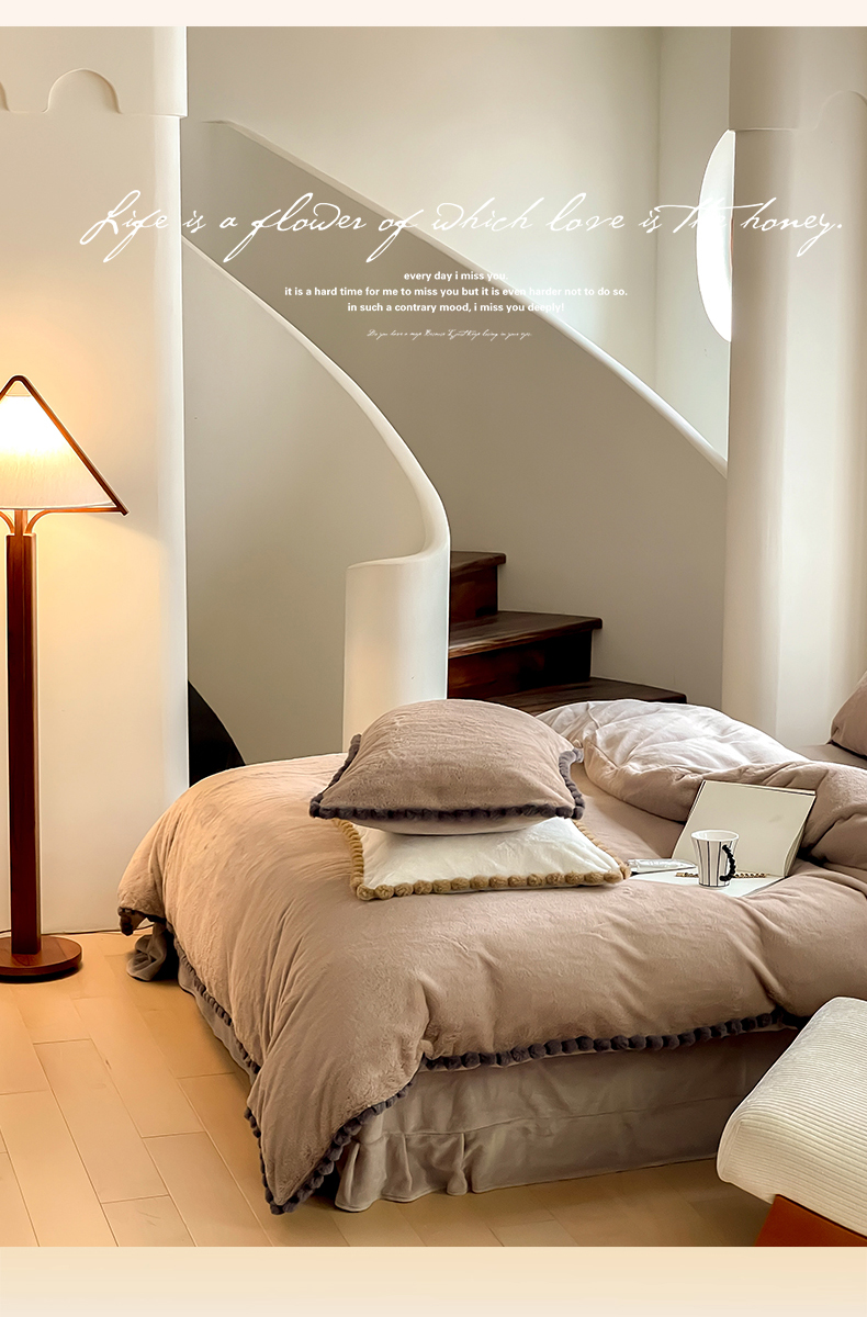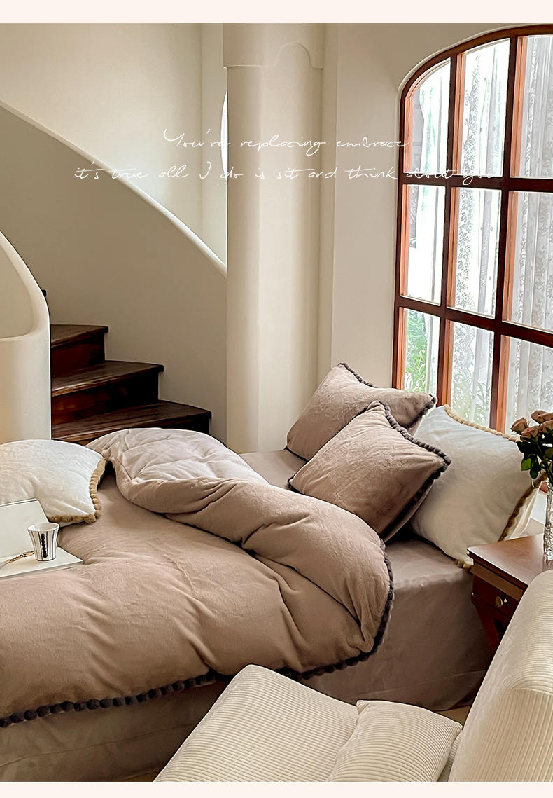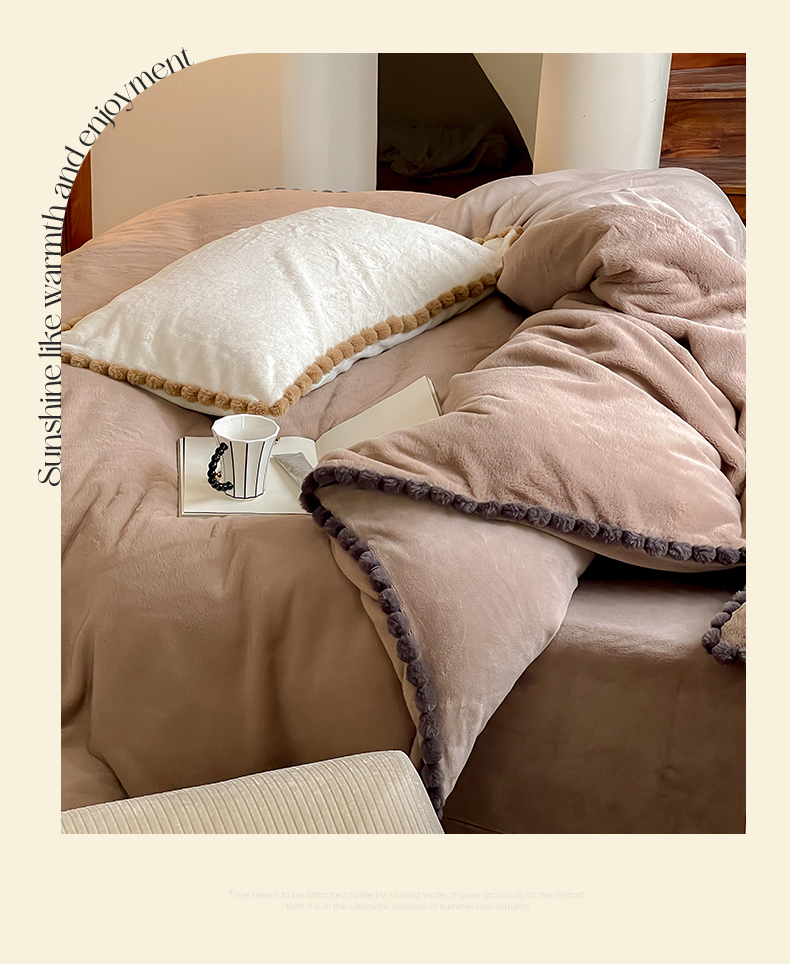 名品优仓 2023新款高克重兔绒边带球球款四件套 摩卡咖