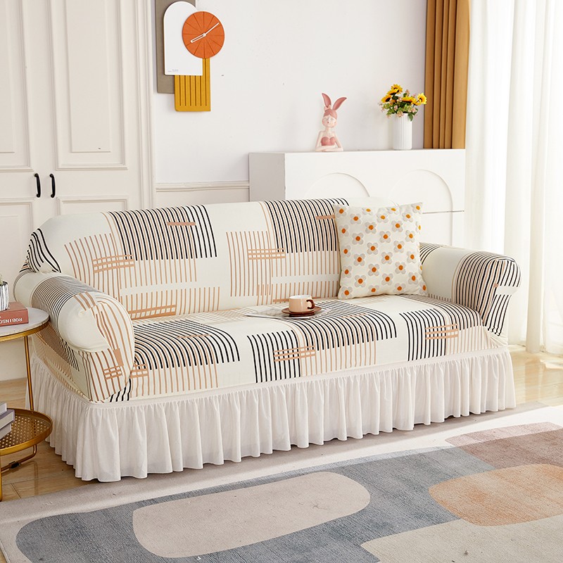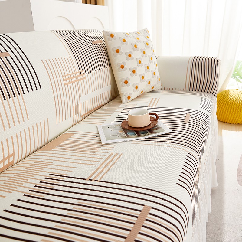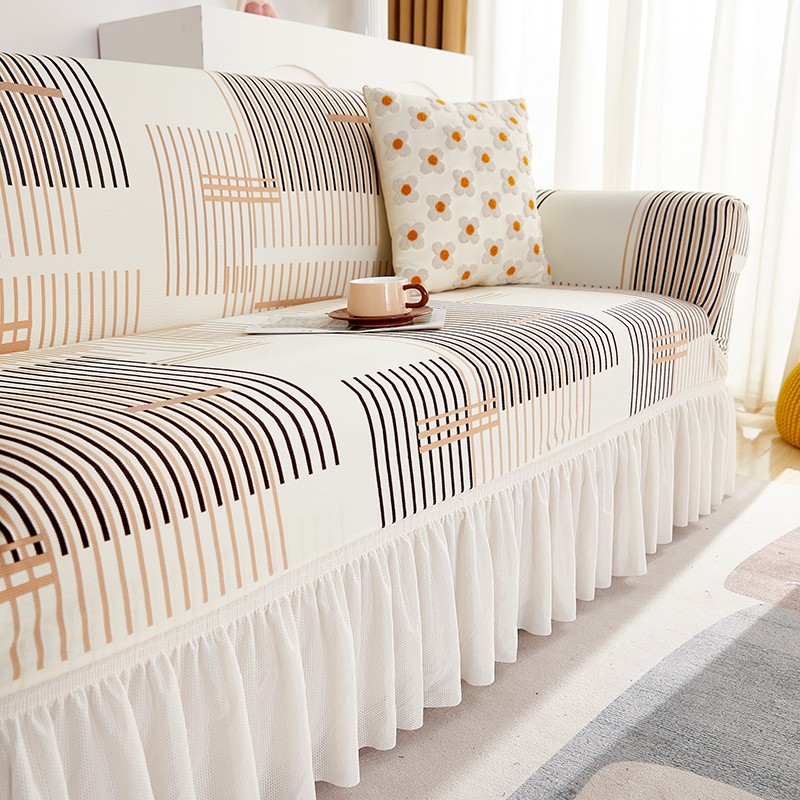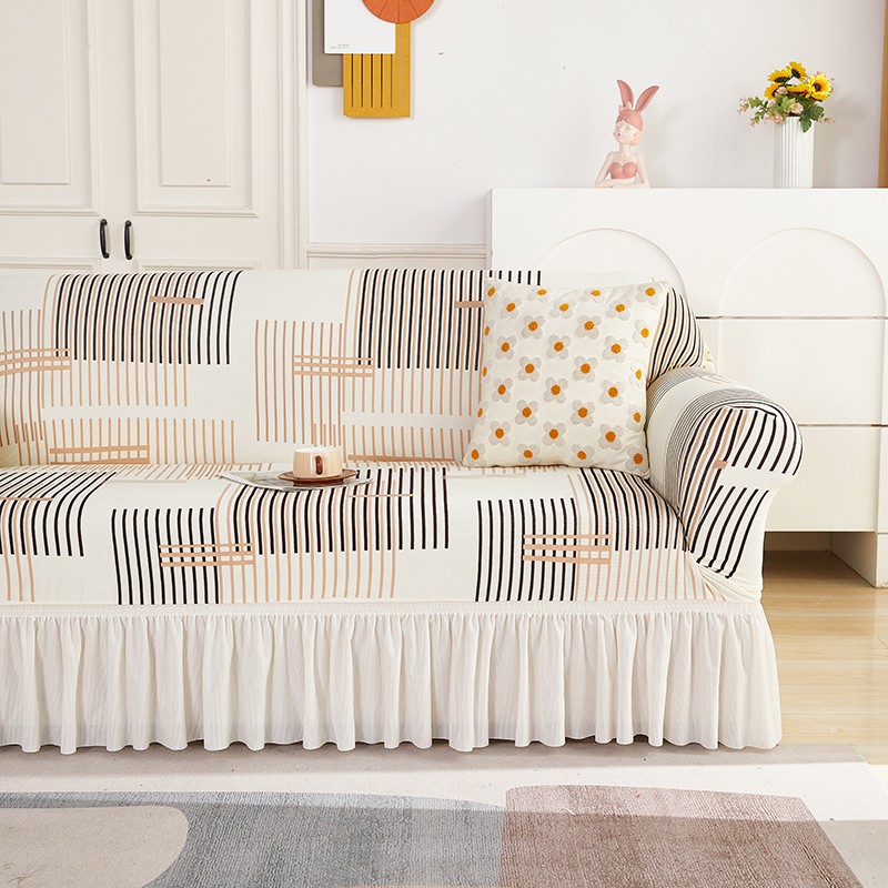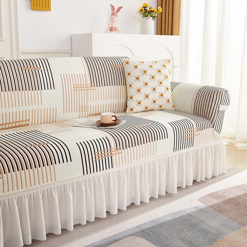 丝绮鹿 2023新款针织柔肤格沙发套(裙边款) 简素线条-黑