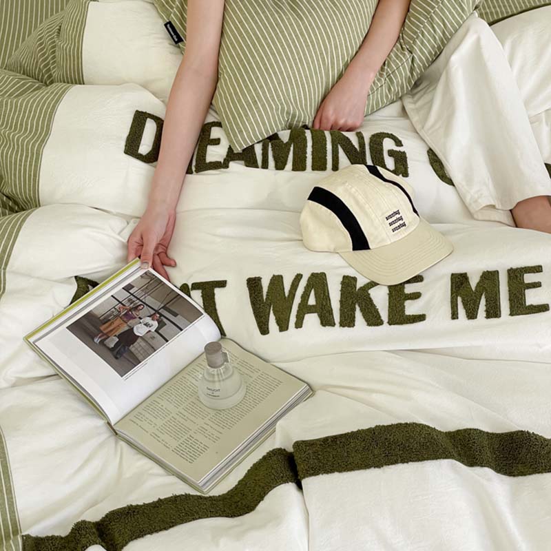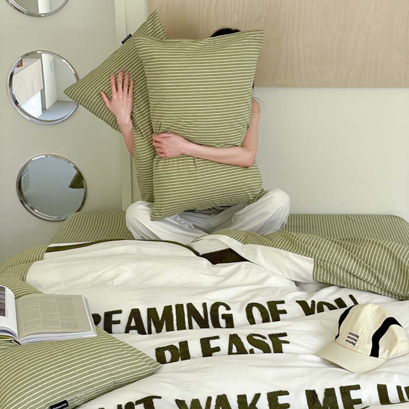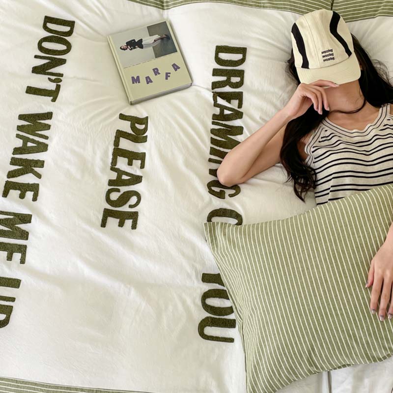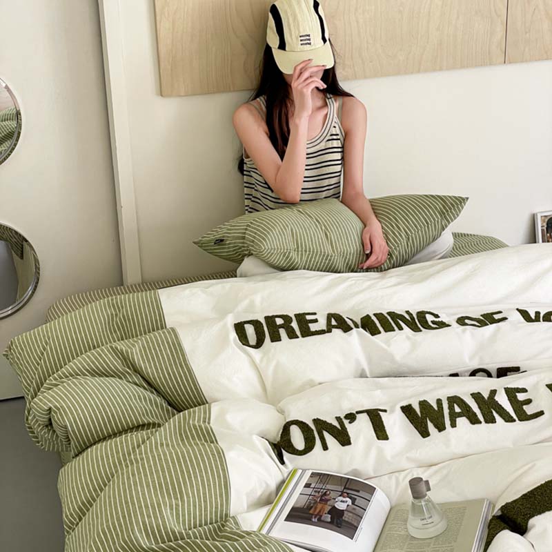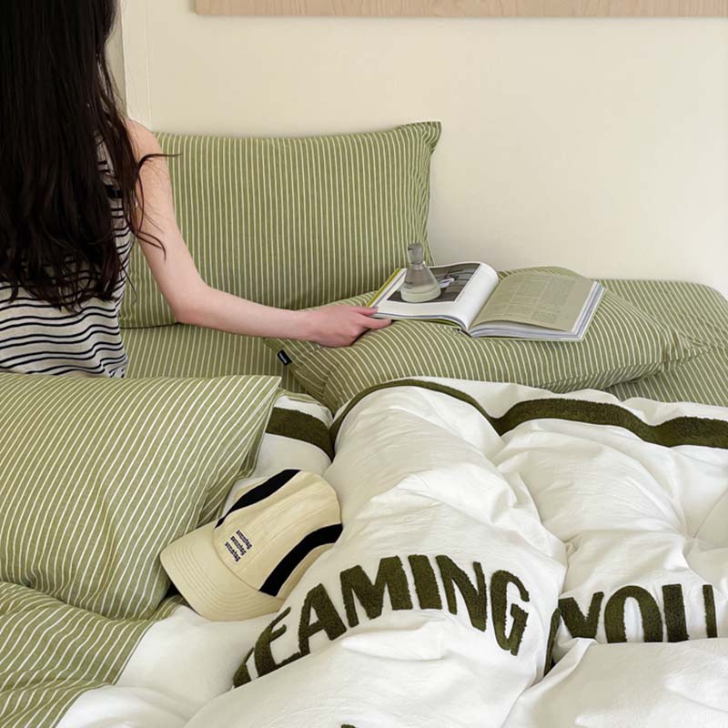 圆岛家纺 2024新款博主风全棉色织水洗棉拼接毛巾绣四件套 多米绿