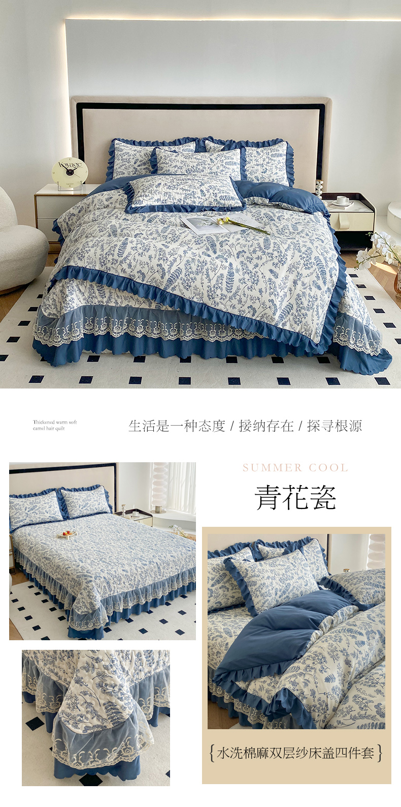 商品名称:艺慕家纺 2025新款水洗棉麻双层纱床盖四件套 青花瓷