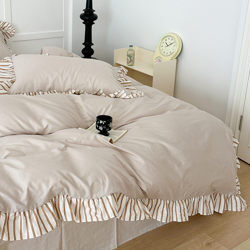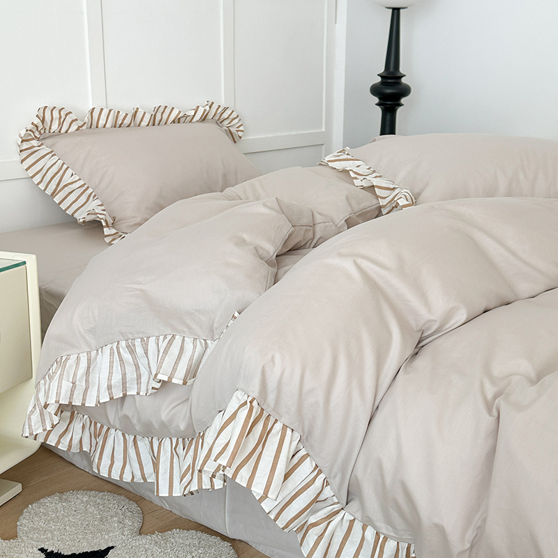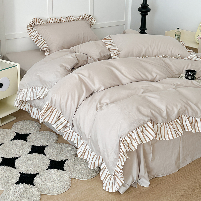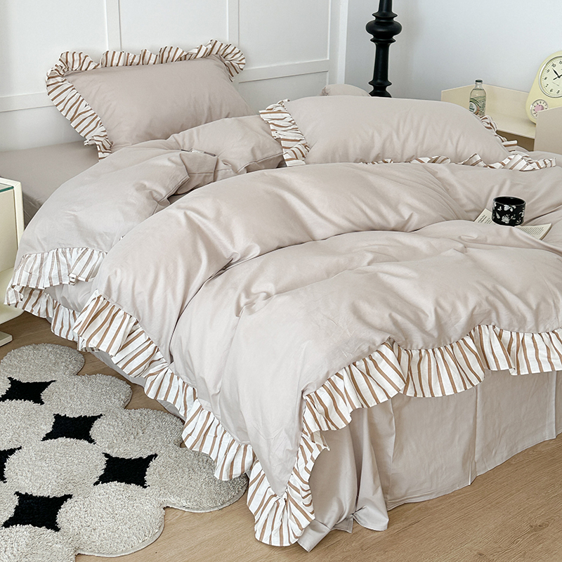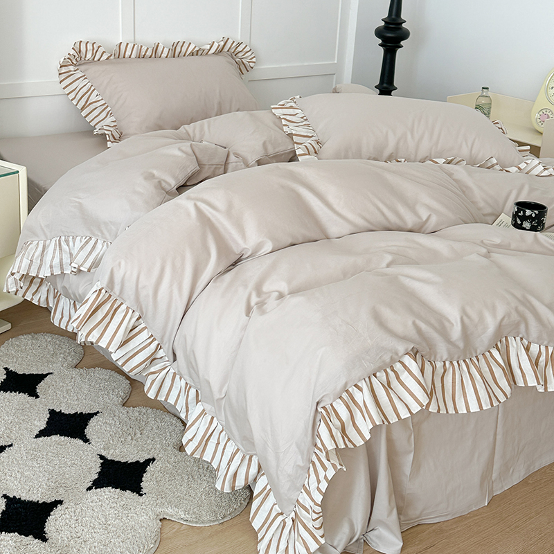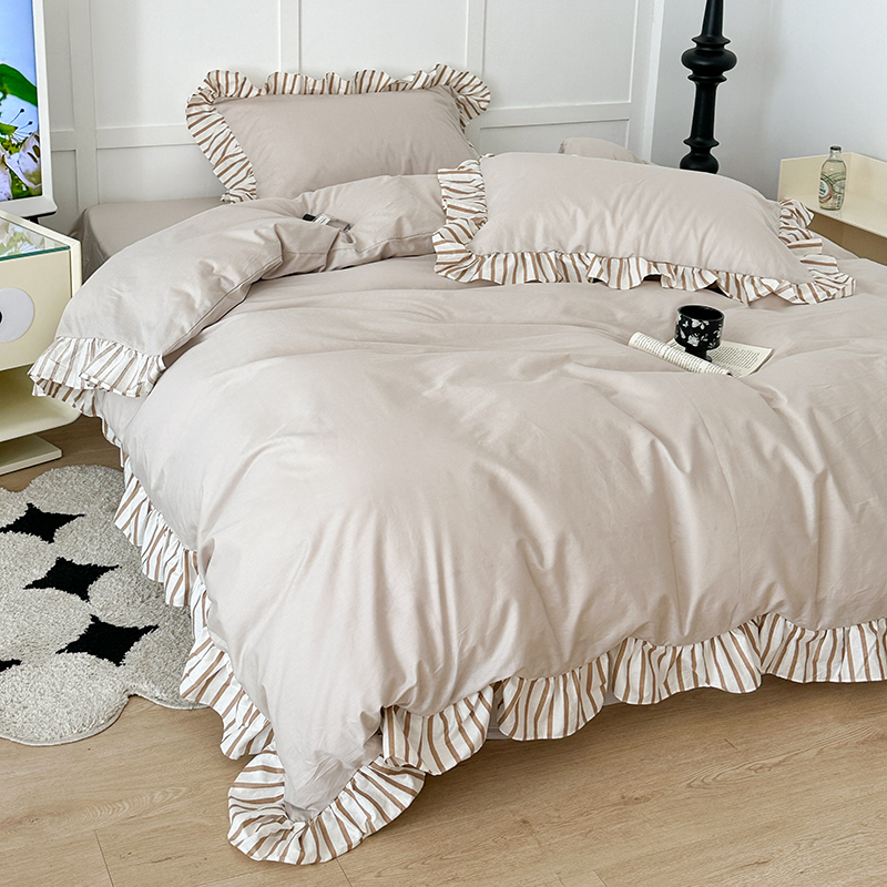 昔可家纺 2024新款纯色亲肤条纹花边四件套 奶咖条