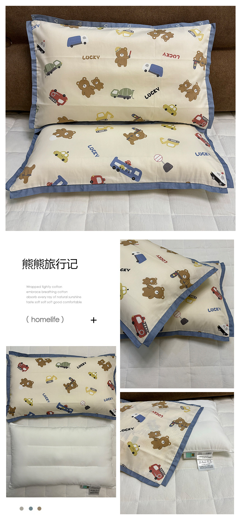商品名称:2024新款A类133x72铂金全棉枕套枕头枕芯七彩童年系列 枕套+枕芯-实拍图 熊熊旅行记